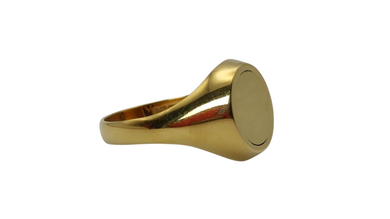 Unique ring that allows you to change the face. The oval head has a swivel panel showing plain gold on one side and the other is enamelled in blue with a Masonic dividers and set square. Two rings for the price of one!
