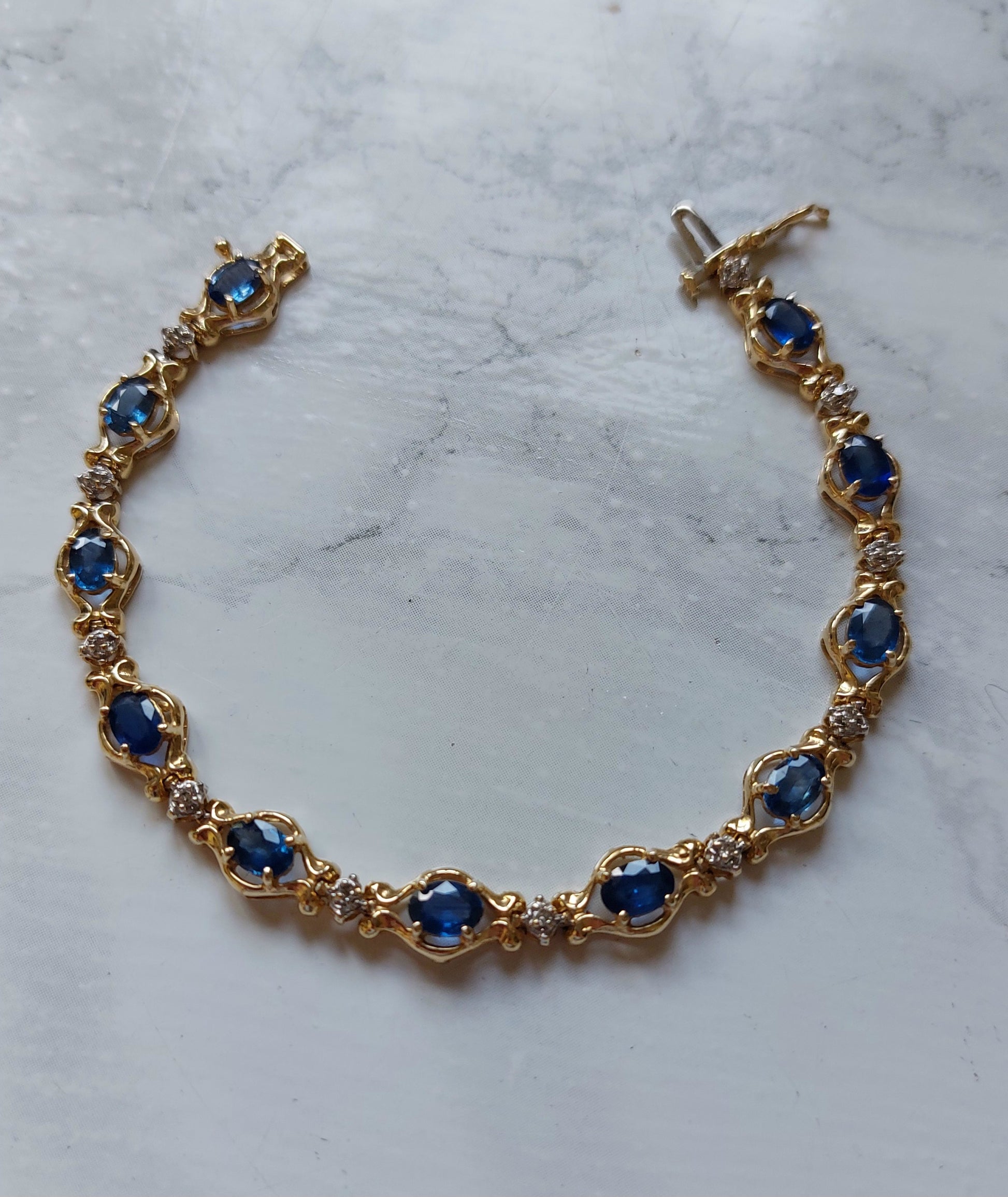A stunning 14ct Gold vintage Sapphire and Diamond bracelet in fantastic condition, showing hardly any signs of wear or age. This bracelet features a beautifully shaped set of links with oval sapphires, spaced by links set with brilliant-cut diamonds. We have included a brand new leather gift box with this sale which makes it a perfect gift.