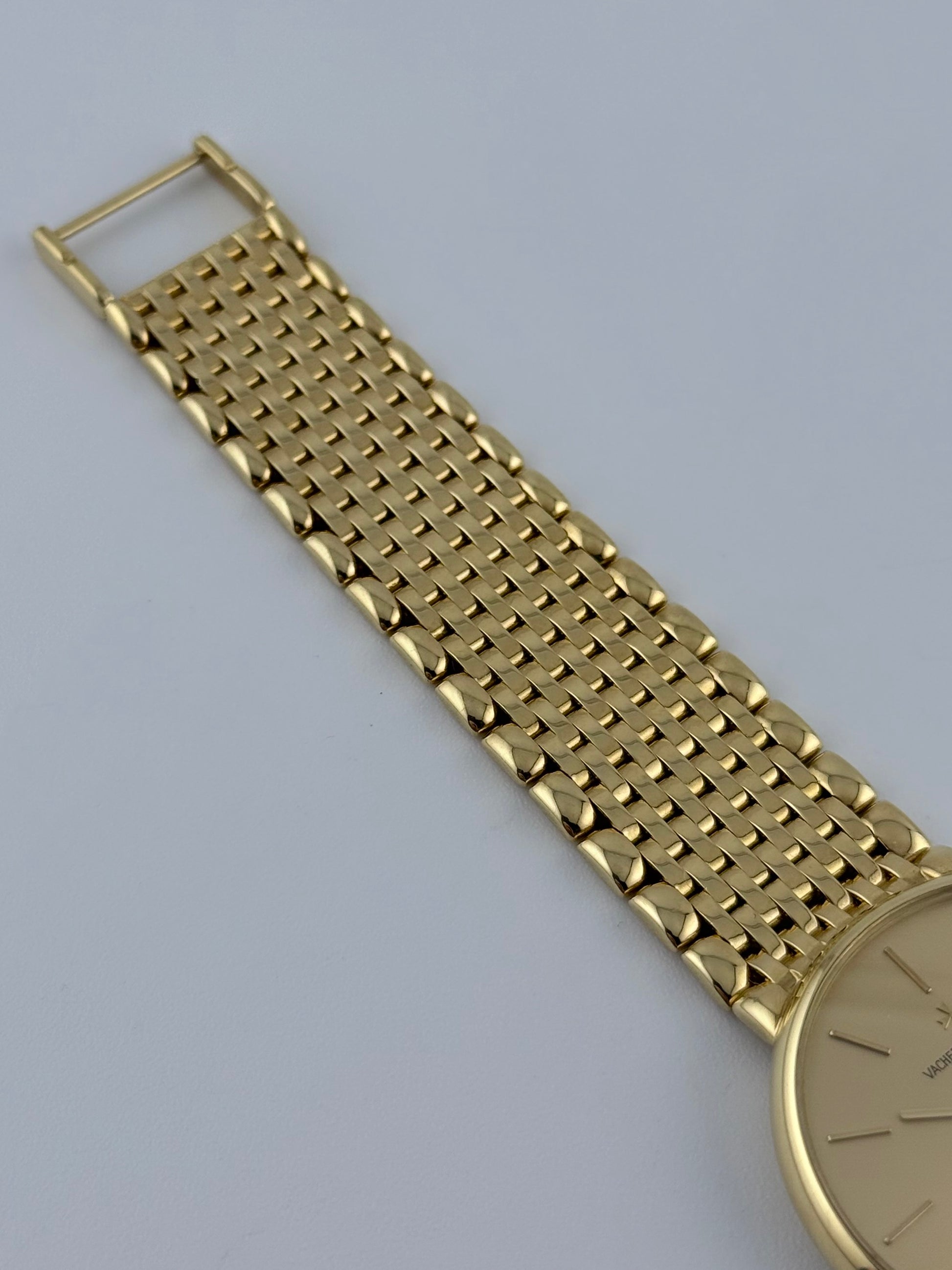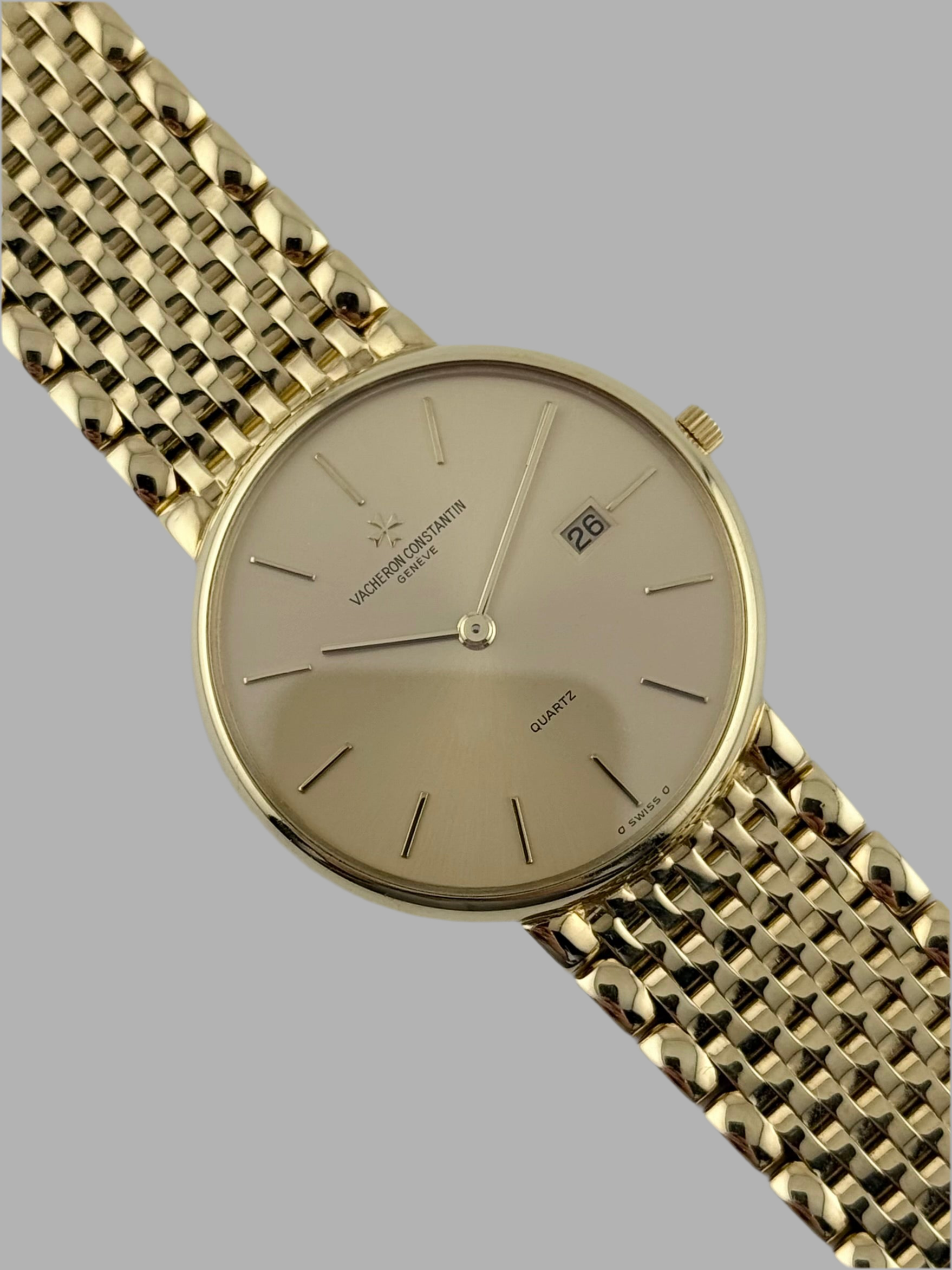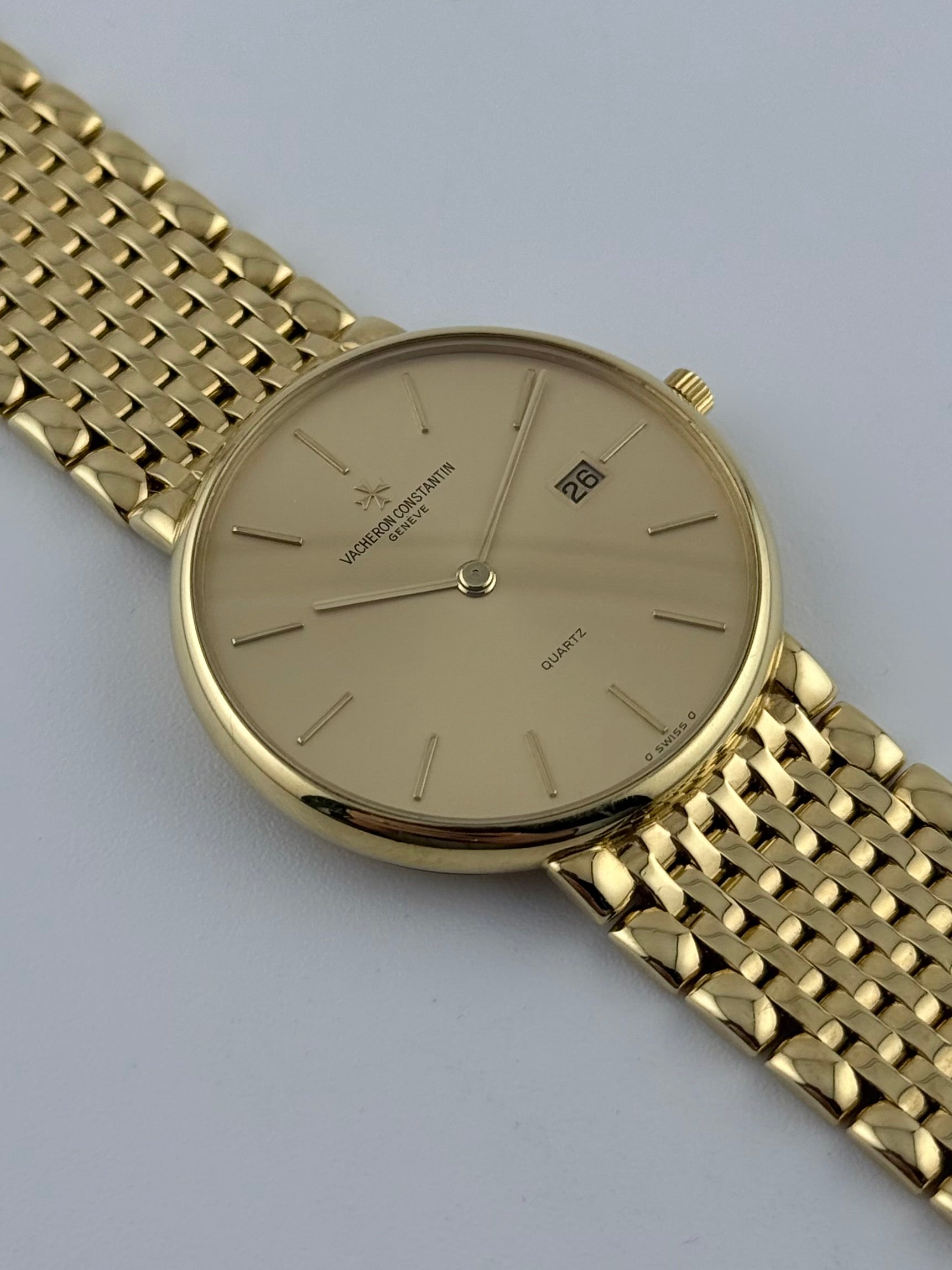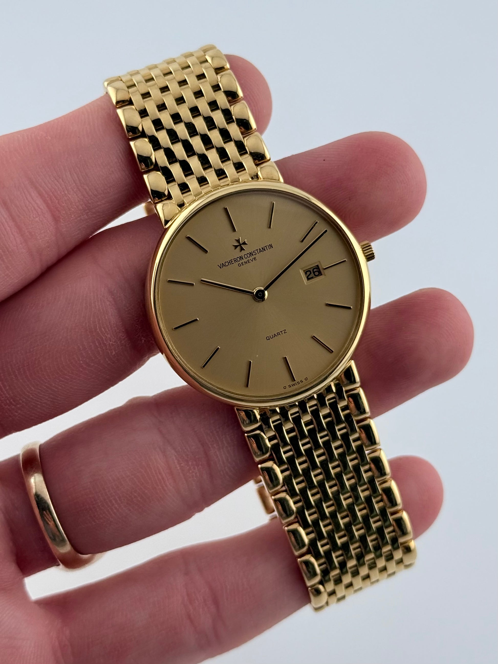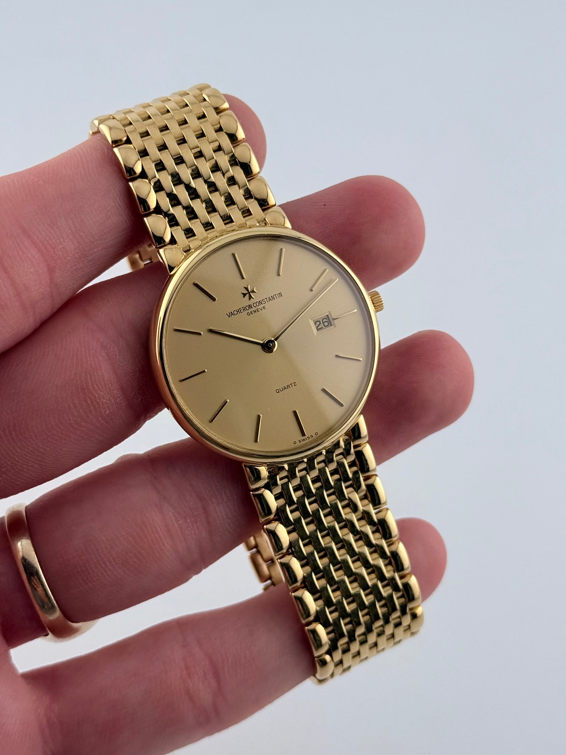 We have for sale an exceptional vintage Vacheron & Constantin Geneve dating back to the 1980s. This classy timepiece features not only a solid 18ct gold watch but also an 18ct gold bracelet. Together with the gold sunburst dial and case back, fine gold indices, hands and a date complication, this incredible watch makes a valuable and special addition to any watch collection. The watch is in excellent condition for its age, running perfectly in every way.