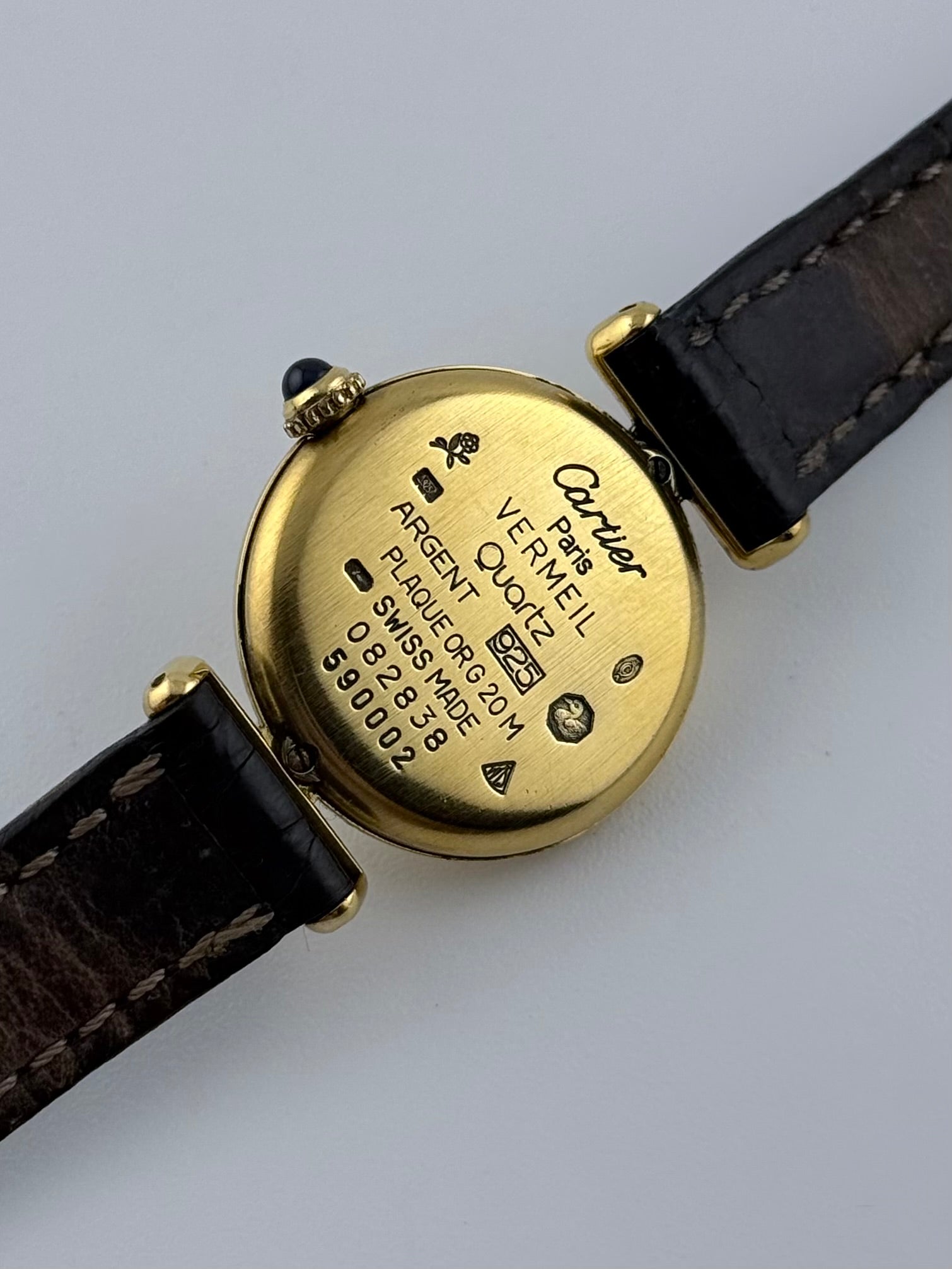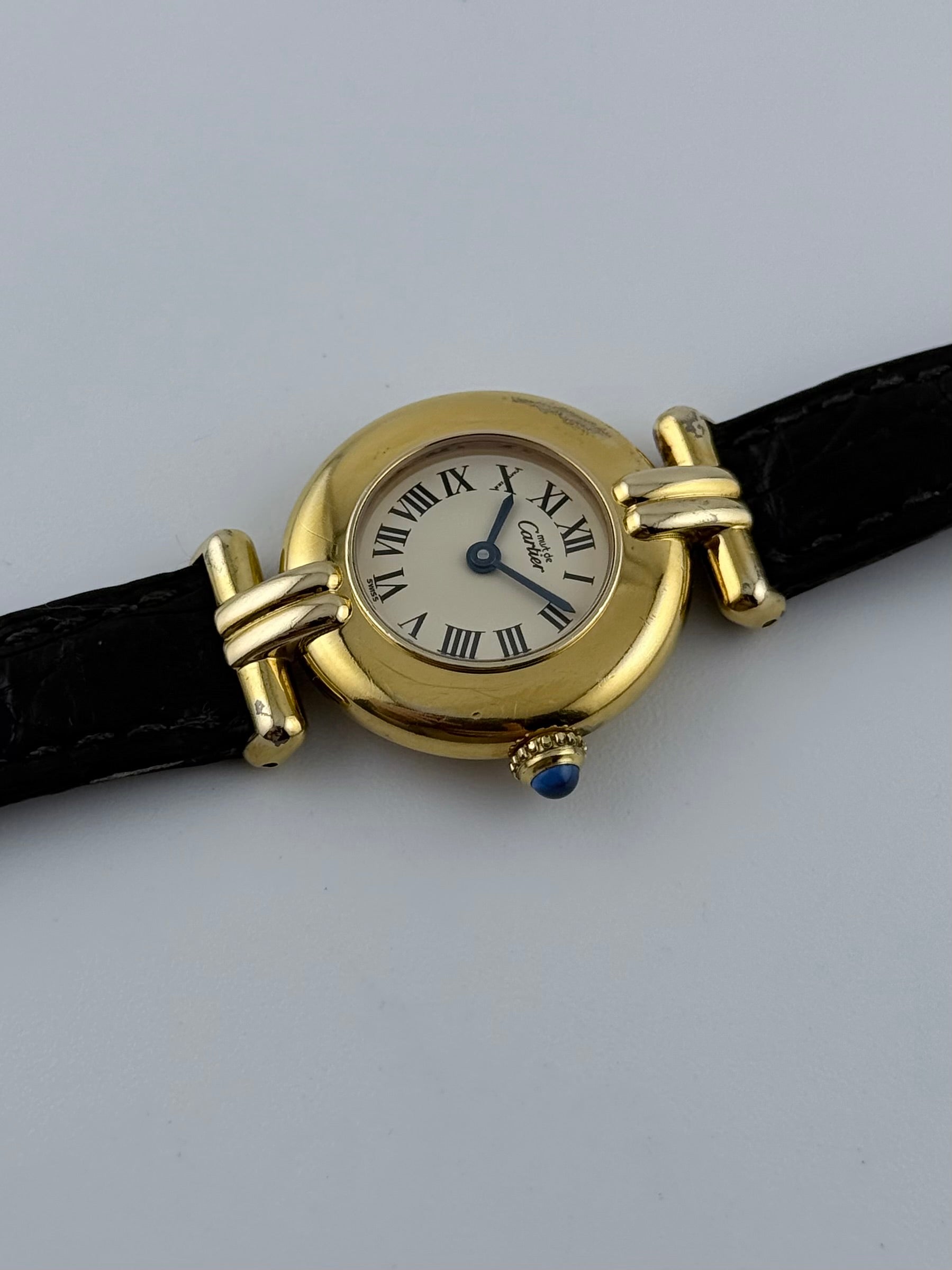 We are delighted to offer you for sale an incredibly stylish vintage must de Cartier Paris Vermeil which is presented in fantastic condition and excellent working order. This stunning watch features 925 sterling silver case which is gold plated and a dial featuring some of the signature markings of Cartier including hidden signature within Roman numerals, blued sword hands and bezel claws. This Cartier comes with its original strap and a quartz movement which is keeping excellent time.