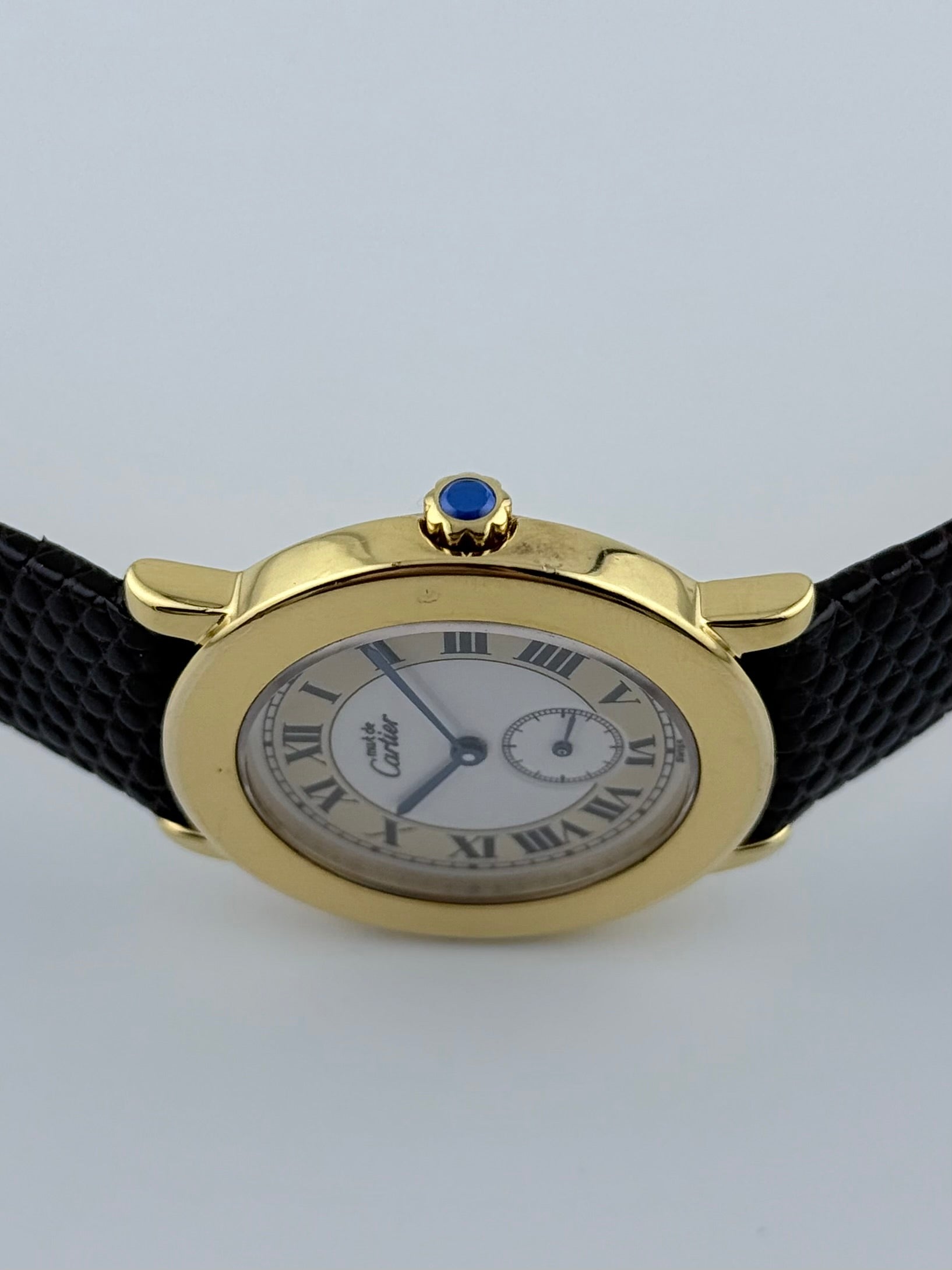 Crown - The crown is fully original and works perfectly in all of its functions. Its fluted edge decorated with the Cartier iconic sapphire add a mesmerising and luxurious touch.