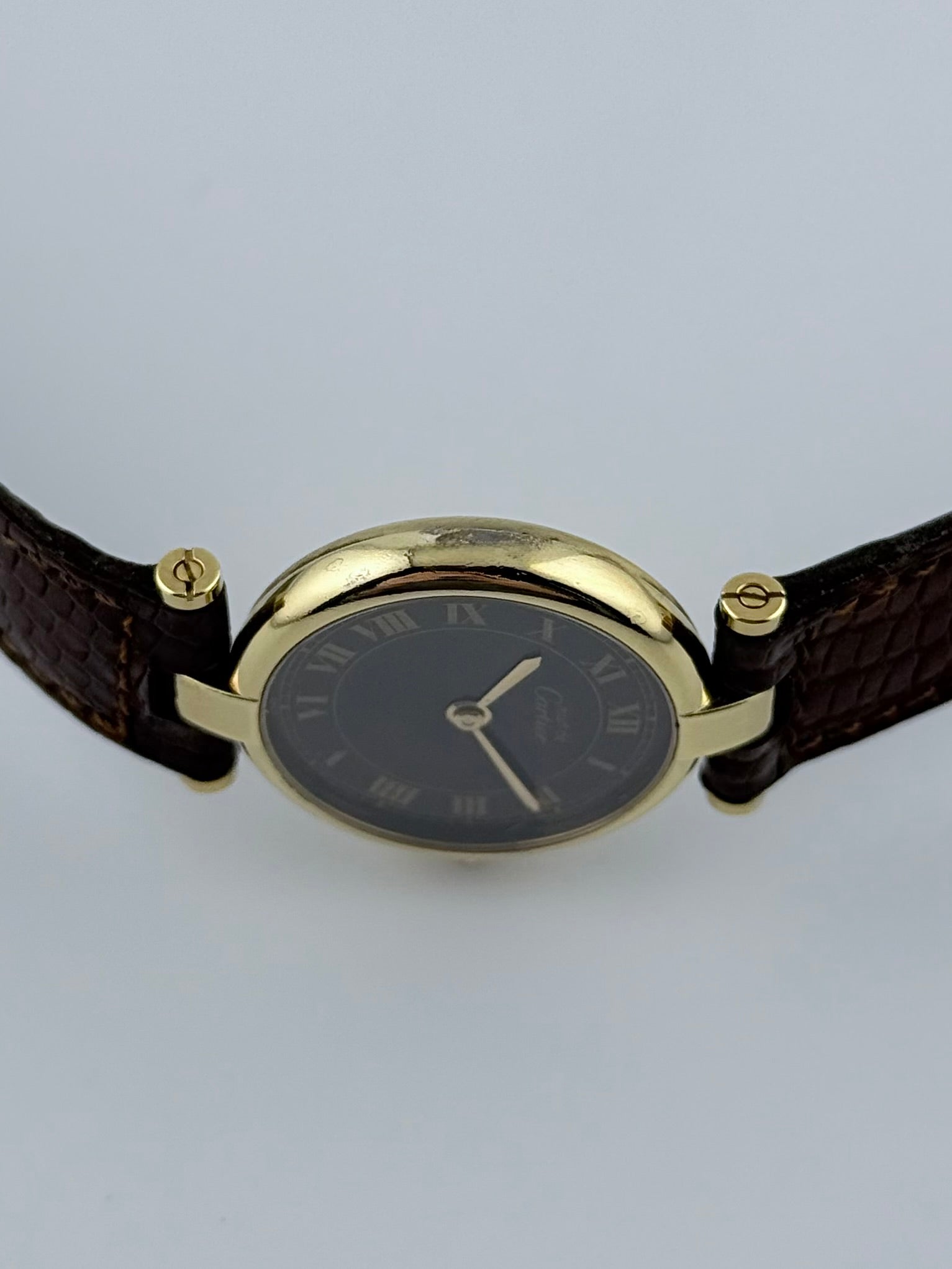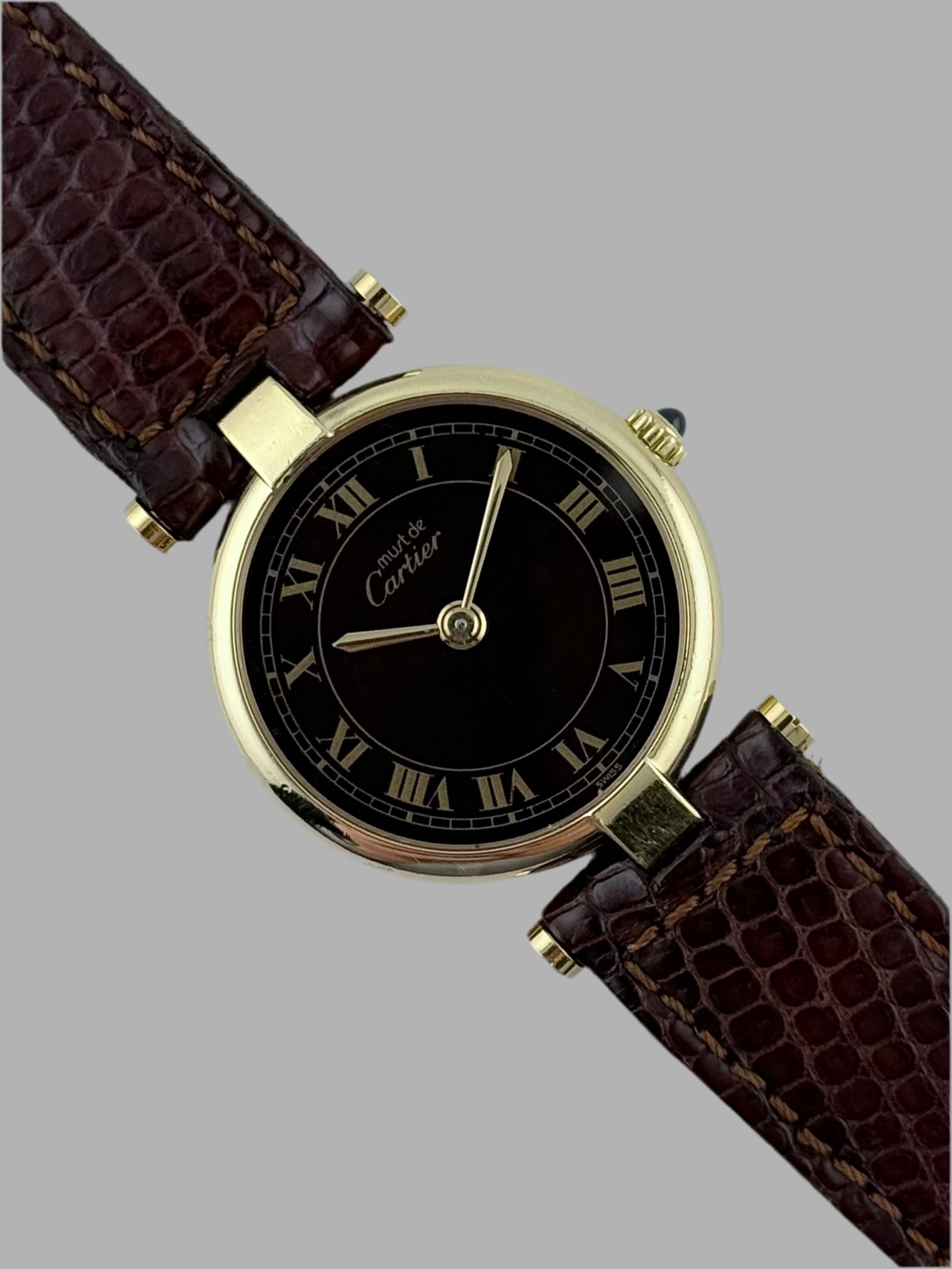 This is an absolutely stunning and classy vintage Must de Cartier featuring a gold plated solid 925 silver case and case and back with a stunning burgundy tortoise shell dial displaying gold sword hands, rail track and the hidden Cartier signature markings. This watch is in remarkably well preserved condition and includes its original Cartier strap and buckle. Its quartz movement is also in brilliant condition, keeping excellent time.
