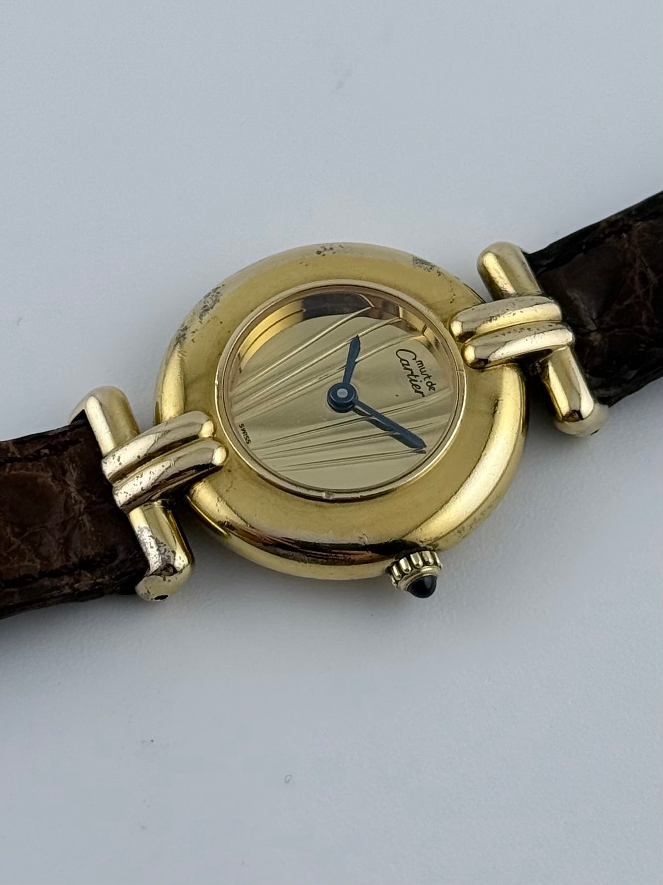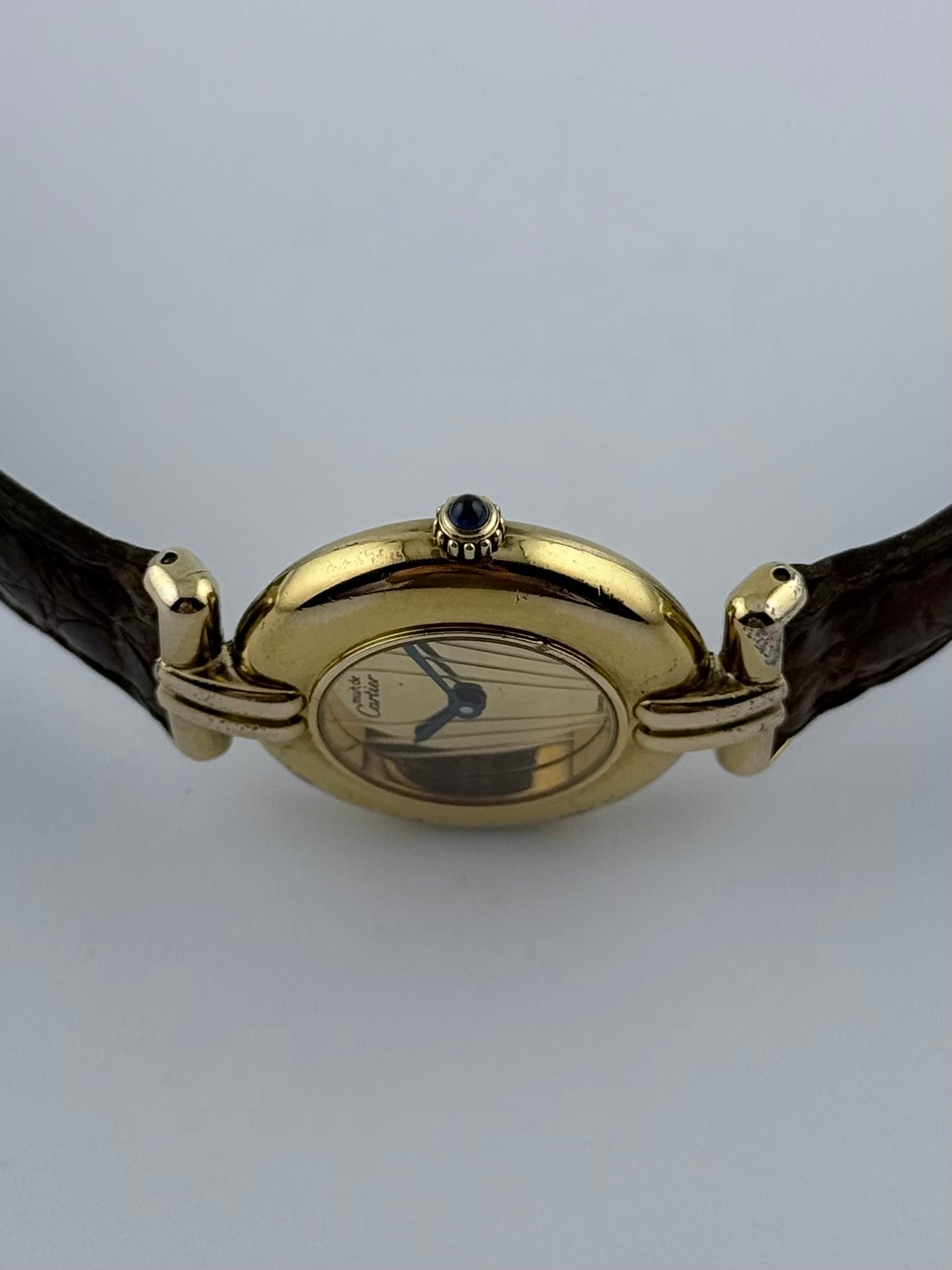 Crown - The crown is fully original and works perfectly in all its functions. Its fluted edge decorated with the Cartier iconic sapphire cabochon stone add a mesmerising and luxurious touch.