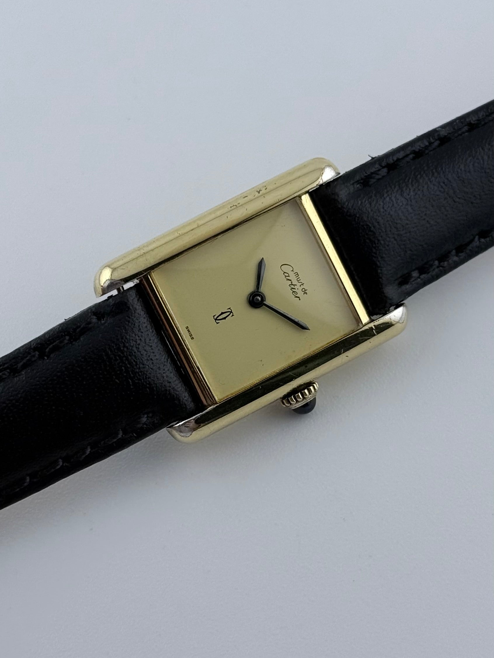 This is a beautiful vintage Must De Cartier tank which features the elegant cream colour dial with blued sword hands behind a domed shaped crystal. Encased in a gold plated solid 925 silver case this Cartier exudes sophistication, beauty and style. This time piece is in gorgeous vintage condition, showing some signs of age and wear. The Cartier manual wind movement is working perfectly and keeping excellent time.