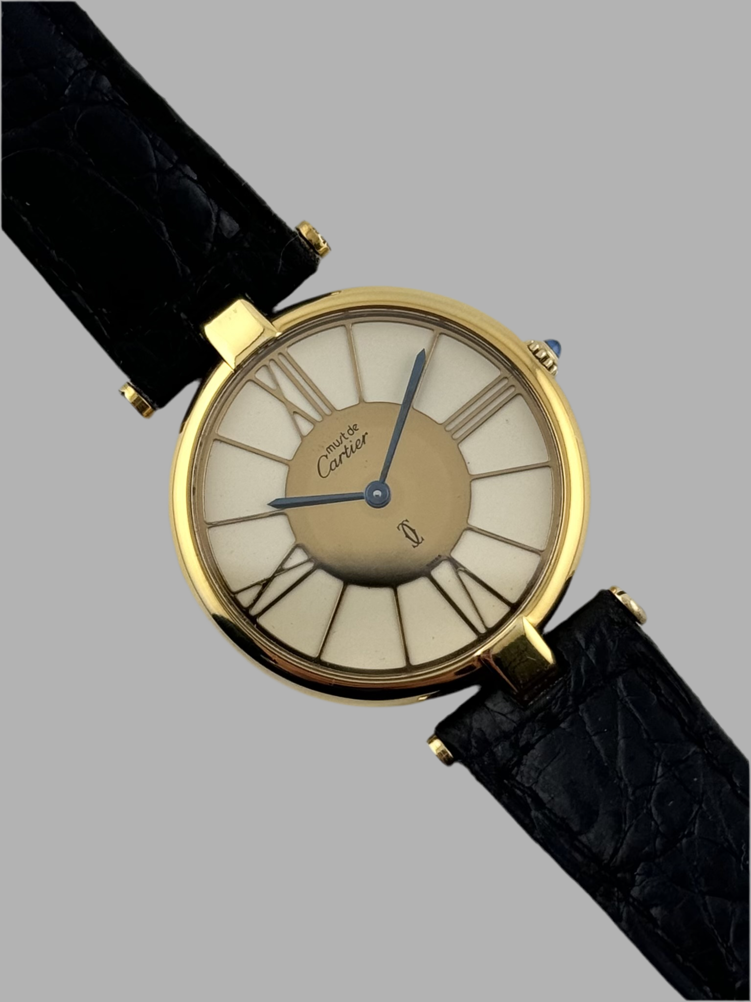 This is an effortlessly sophisticated vintage les must de Cartier Paris with its original box and a quartz movement which is keeping excellent time. This beautiful watch features 925 sterling silver case with gold plating embellished with a blue crown jewel together with blued hands which have a fascinating story of production. This stylish timepiece is a unisex watch suited to both a lady and a gentleman.