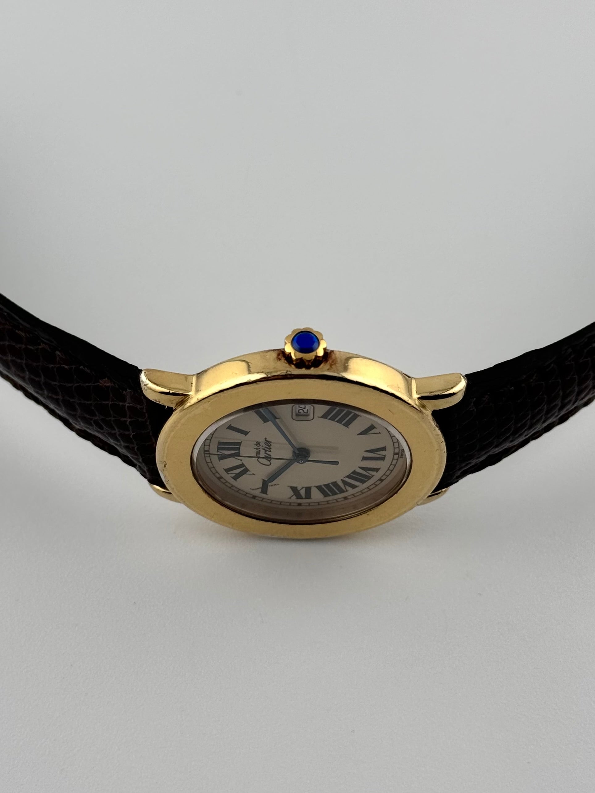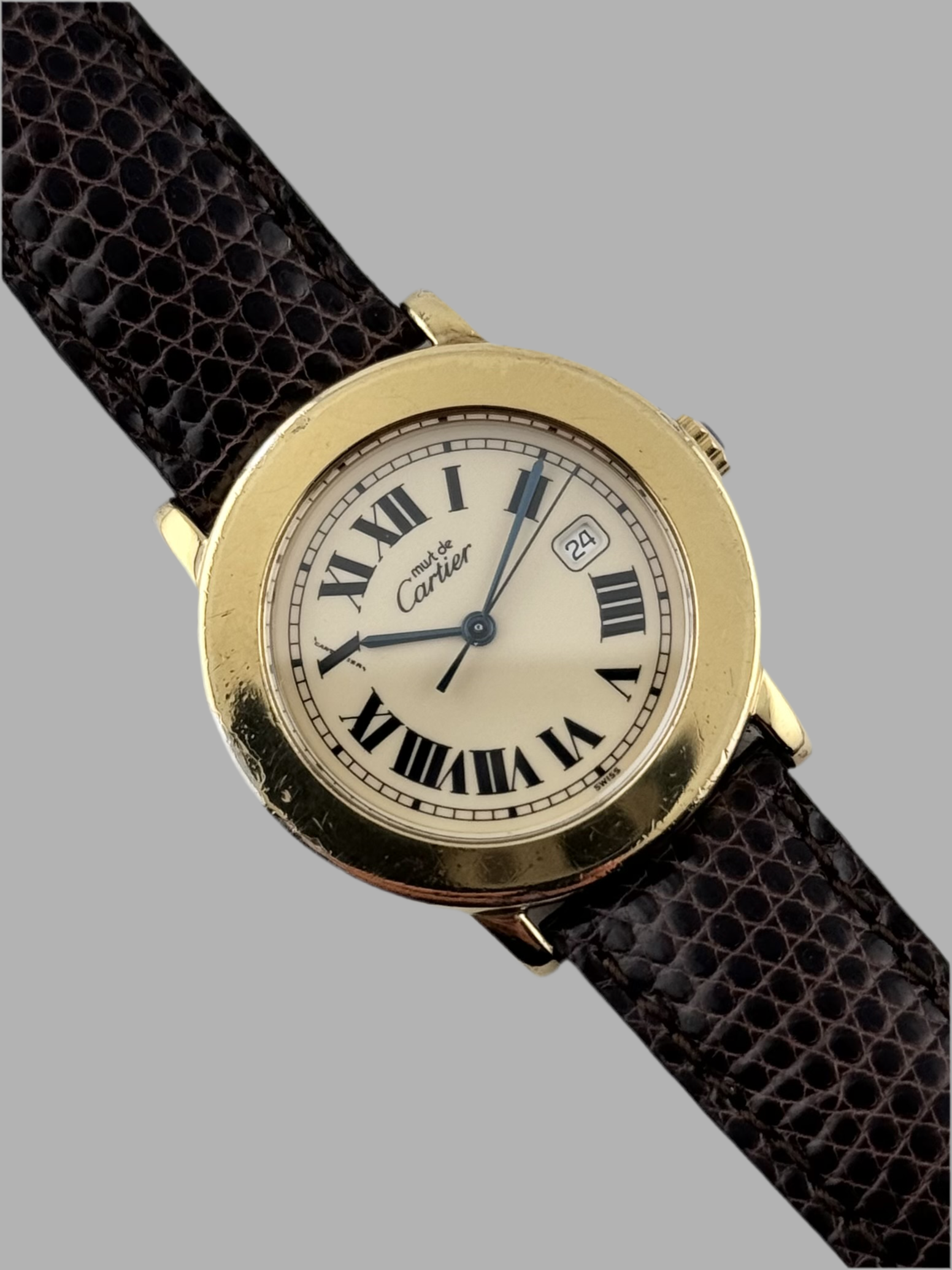 This is an absolutely stunning and classy vintage must-have Must De Cartier Ronde with its original quartz movement which is keeping excellent time. This beautiful watch features a sterling silver case which is gold plated embellished with all the hallmarks of a Cartier watch including a secret signature, crown jewel, the rail track and the blued hands with a fascinating story of production. This stylish timepiece is a unisex watch suited to both a lady and a gentleman.