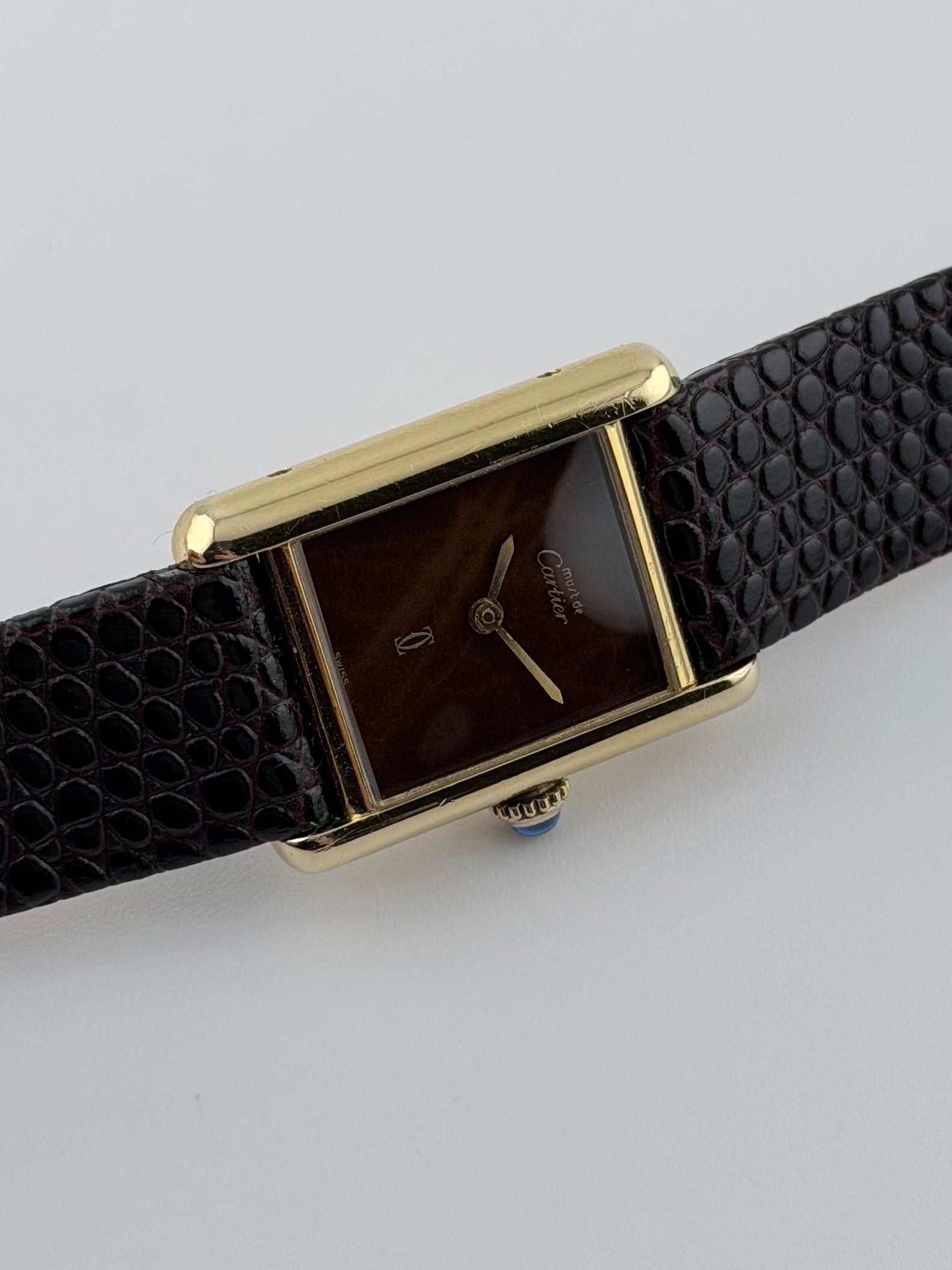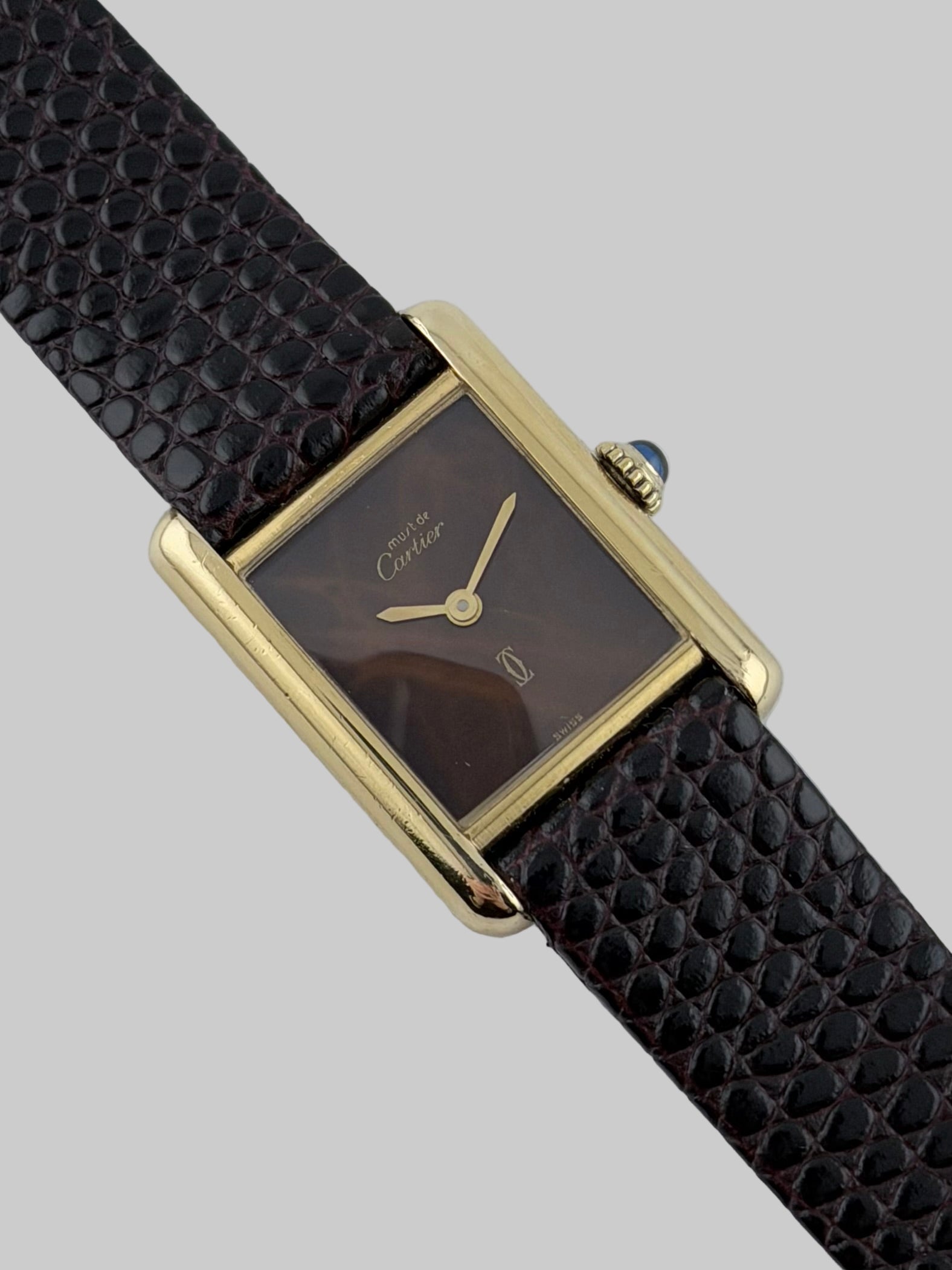 This is a fabulous vintage Must De Cartier Paris Tank which features a beautiful lacquer wood dial encased in a gold plated solid sterling silver case. This Cartier is in lovely condition showing only little signs of wear and age, but not short of elegance, class and charm. The Cartier manual wind movement is working perfectly and keeping excellent time.