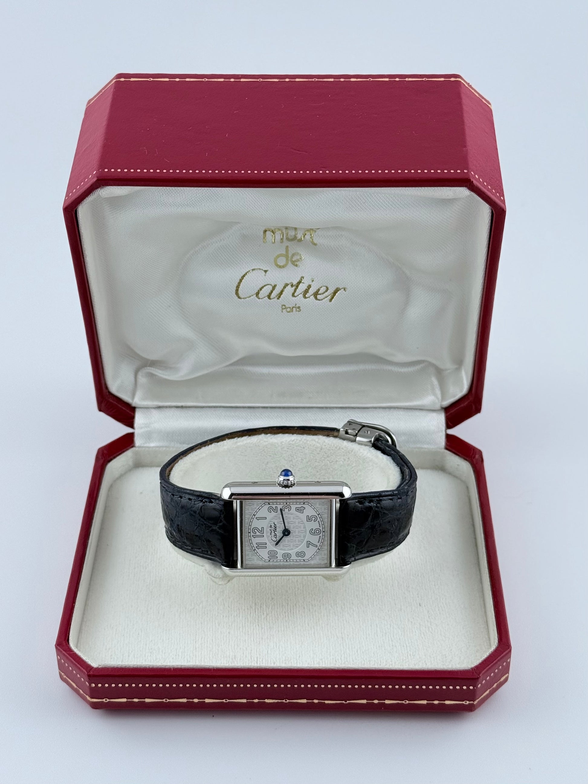 This is a rather stylish and stunning vintage Must De Cartier Tank featuring a fabulous embossed white dial with grey/silver Arabic numerals in a 925 silver case. In addition, this watch is not short on other famous features such as the Cartier sword blued hands. This Cartier is in incredible condition showing only light signs of wear. The Cartier quartz movement is working perfectly and keeping excellent time. In addition the watch still sits on its original strap and comes with its original box.