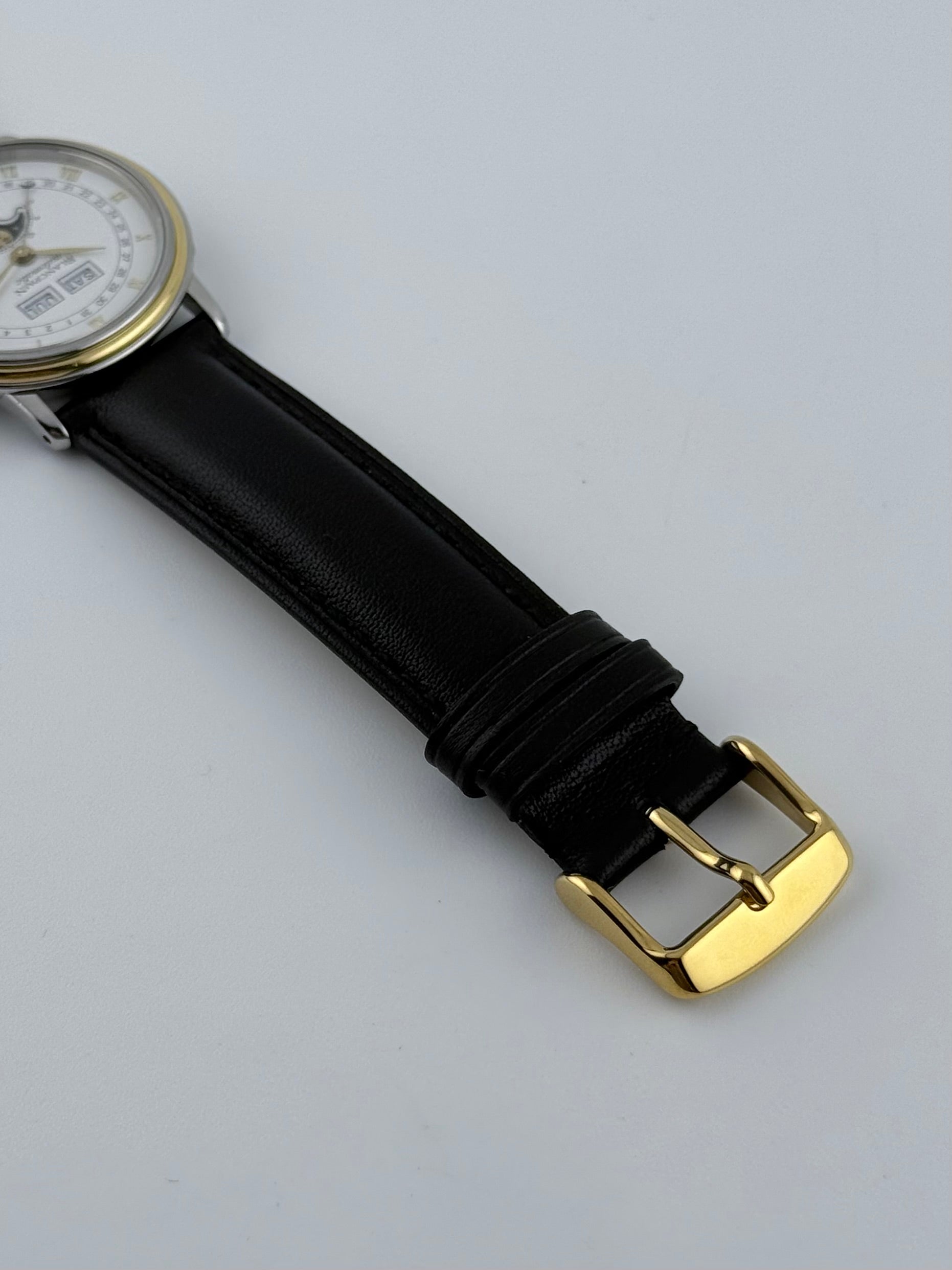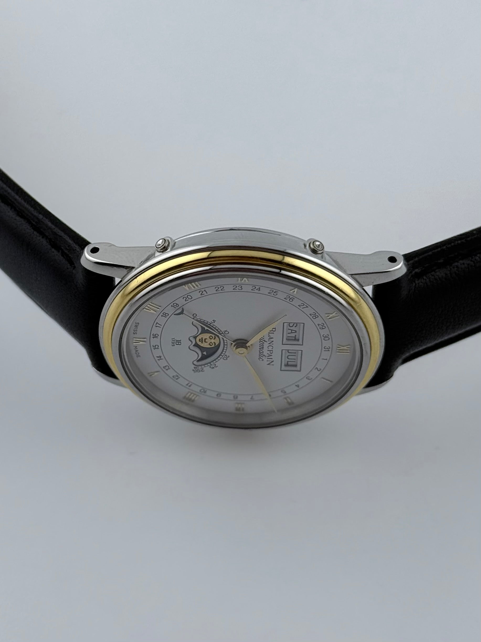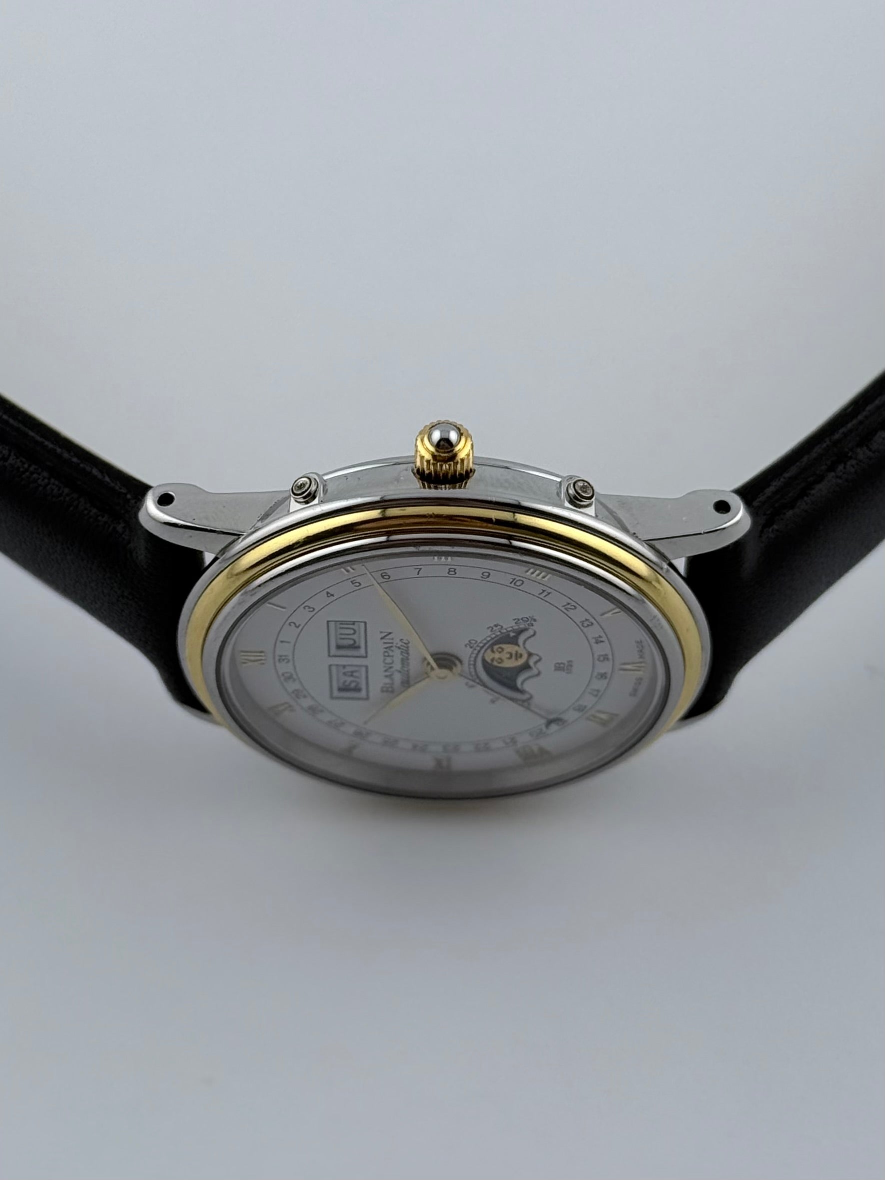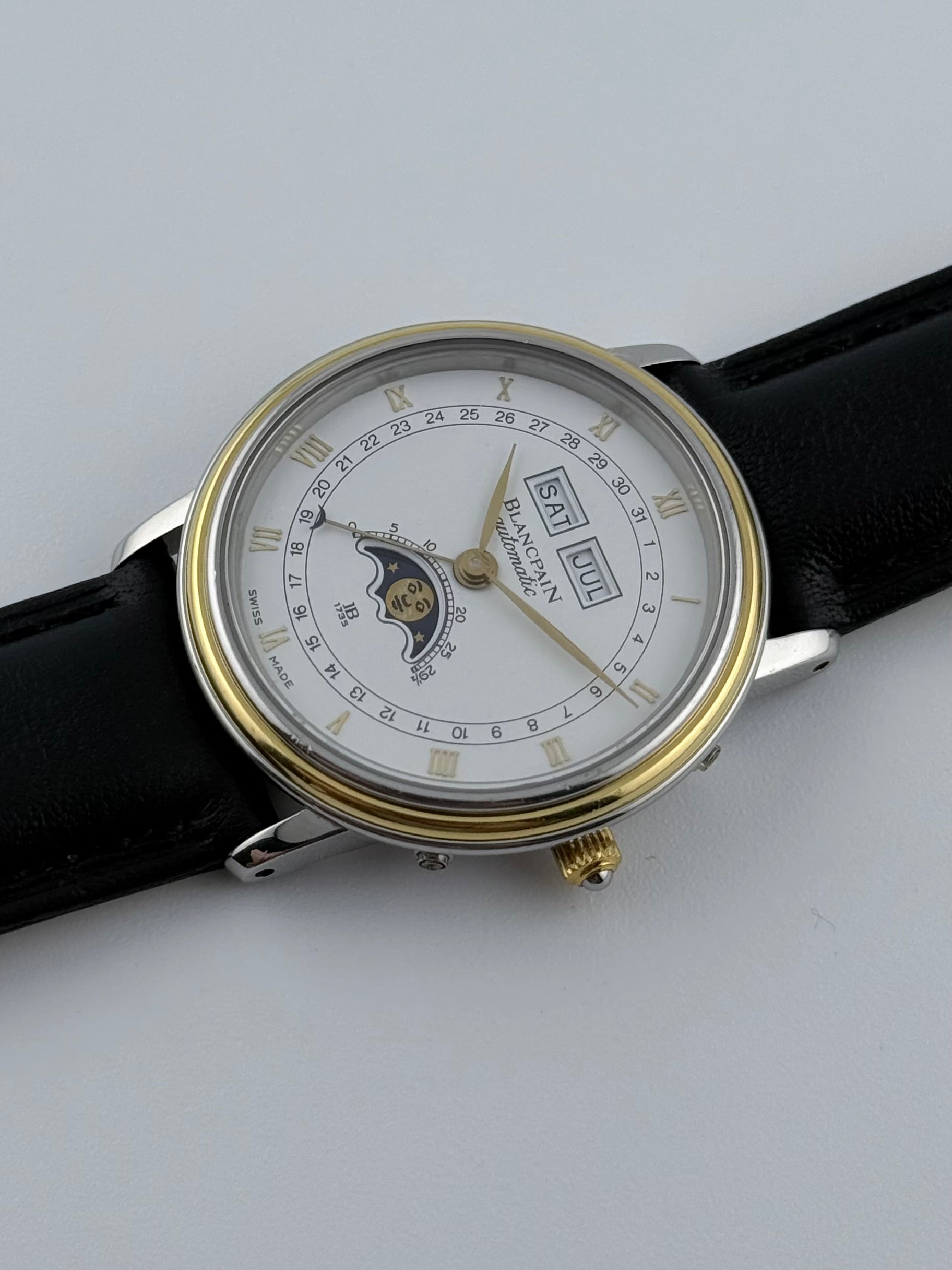 This is an absolutely fabulous vintage Blancpain Villeret from the 1980s. This piece features a two tone case with white dial complemented by a triple date and a moon-phase complications which are in excellent working order and are easily adjusted with the four correctors on the sides of the case. The watch is in superb condition for its age and its original automatic 6511 movement is working perfectly and keeping excellent time. This is definitely a unisex watch which would suit a lady the same as it would a man.
