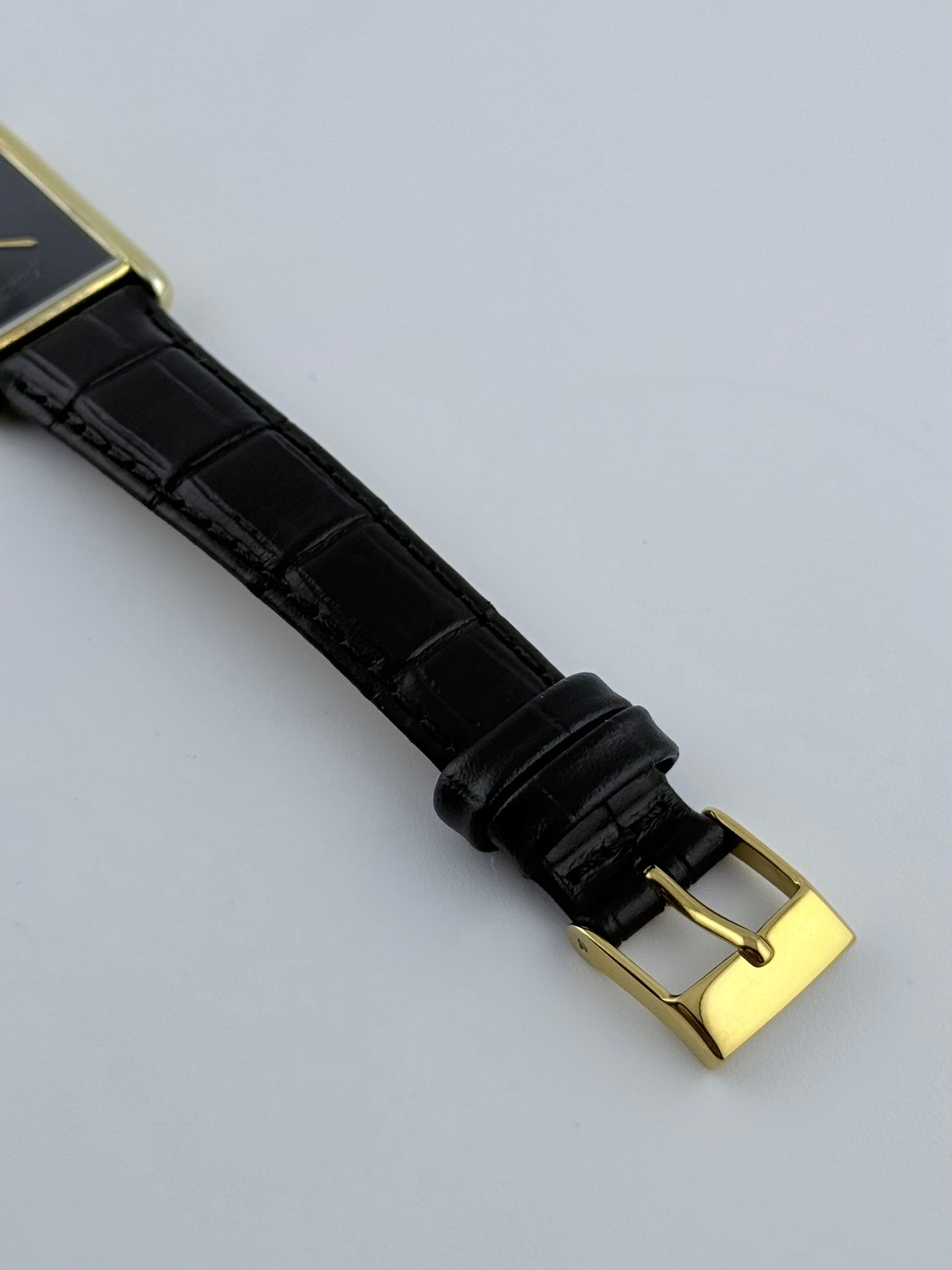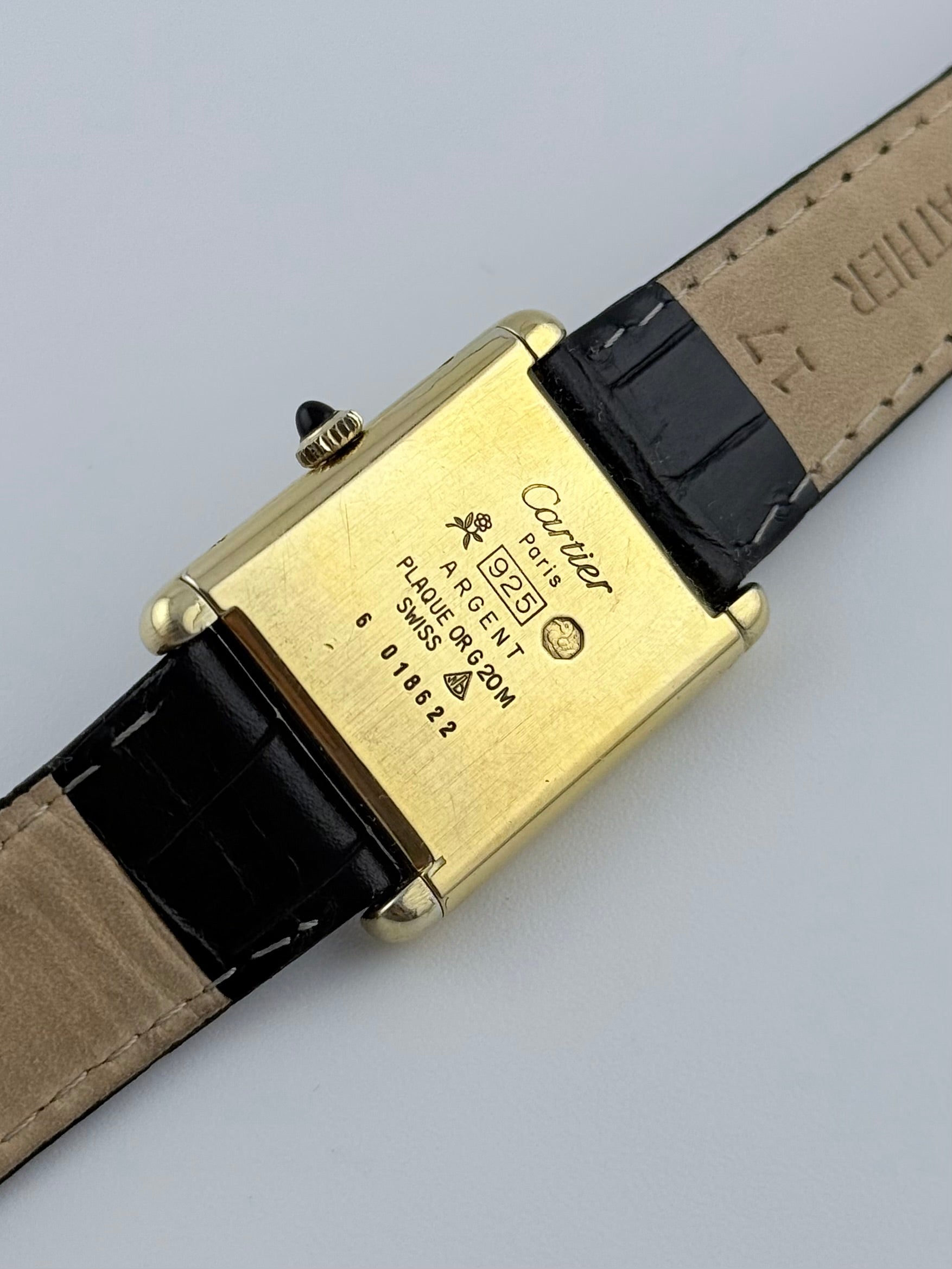 This is an absolutely stunning and classy vintage Must De Cartier Tank which features the more desirable manual movement which, following a recent service, is working perfectly and keeping excellent time. This piece features a solid 925 silver case which is gold plated. The black dial with spidering effect is complemented nicely with a matching black strap. This is definitely a unisex watch which would suit a lady the same as it would a gentleman.