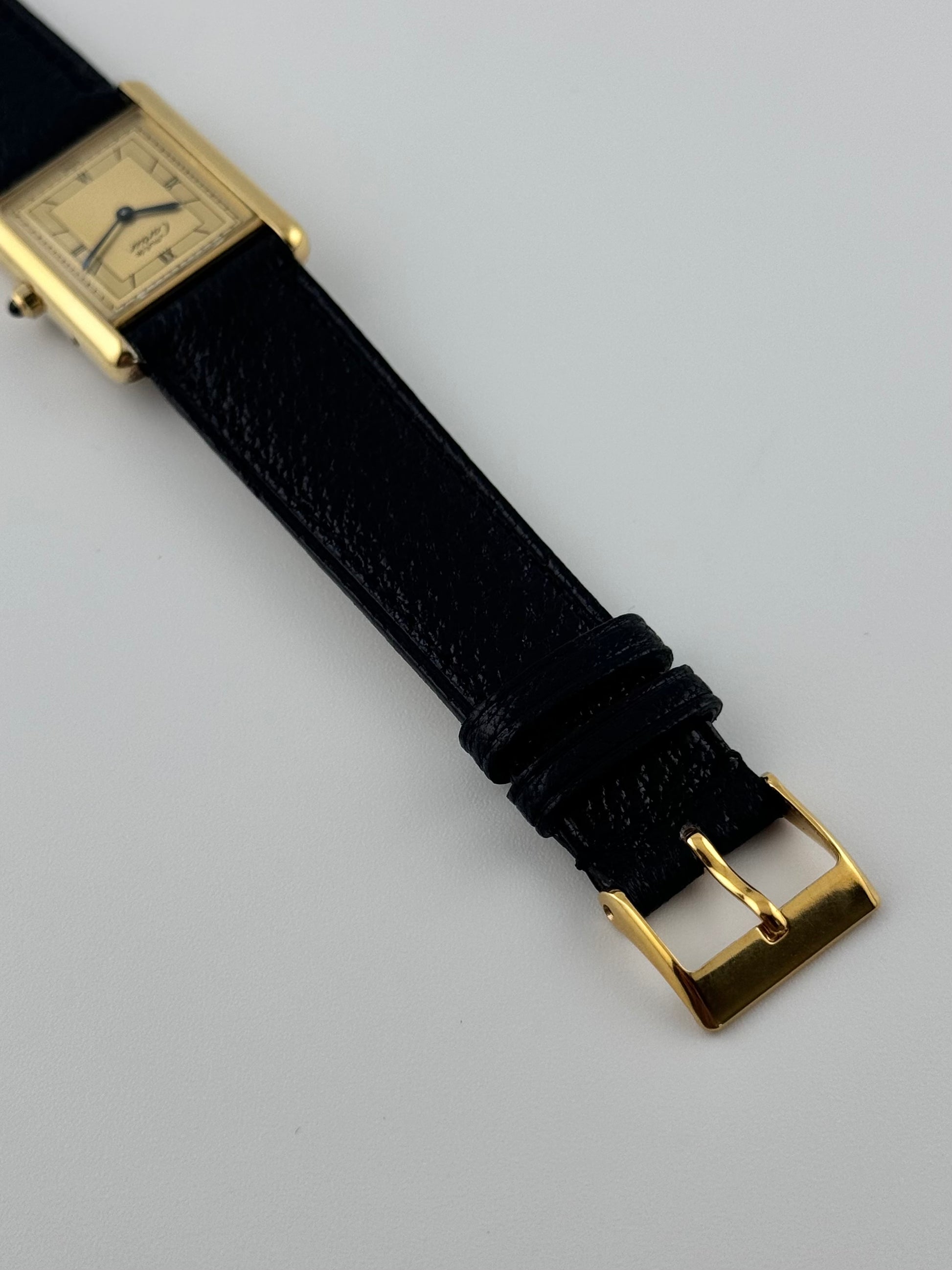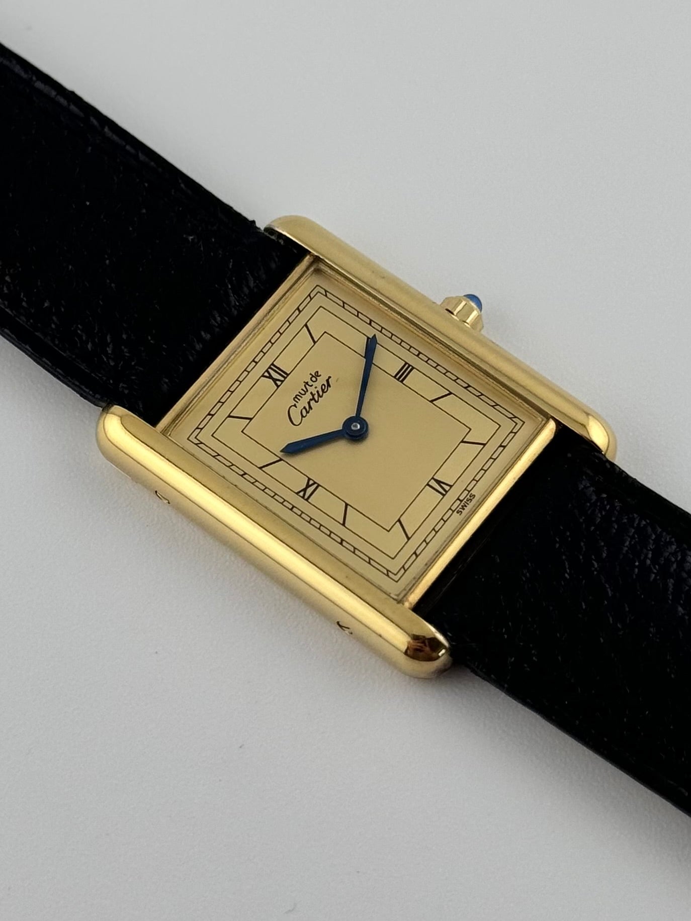 This is an absolutely stunning and classy vintage Must De Cartier Tank which features a quartz movement which is working perfectly and keeping excellent time. This piece features a gold vermeil plated 925 silver case. This watch features a very desirable champagne dial which hosts black markers and stunning blue hands. This Cartier is in incredible condition showing little signs of wear whatsoever.