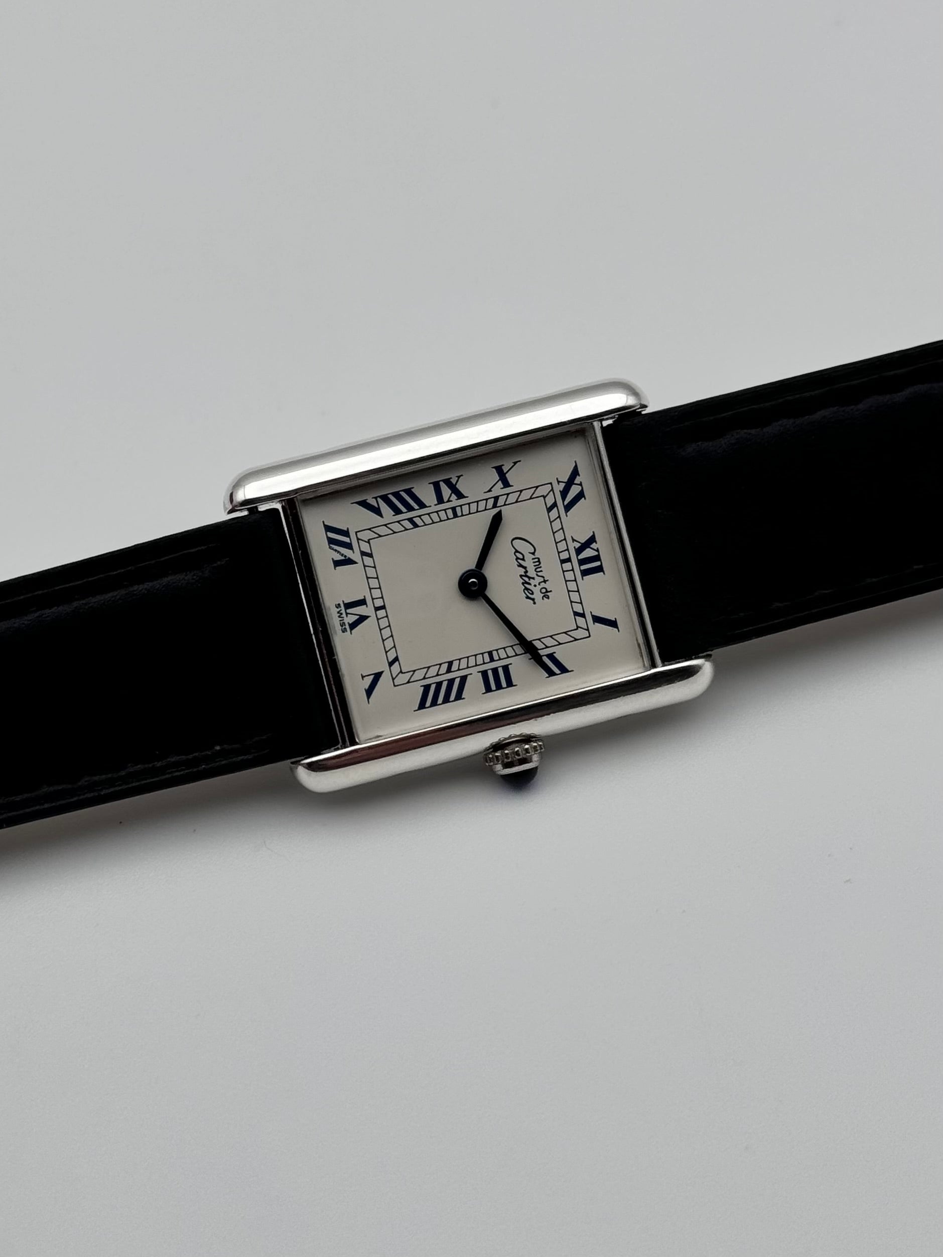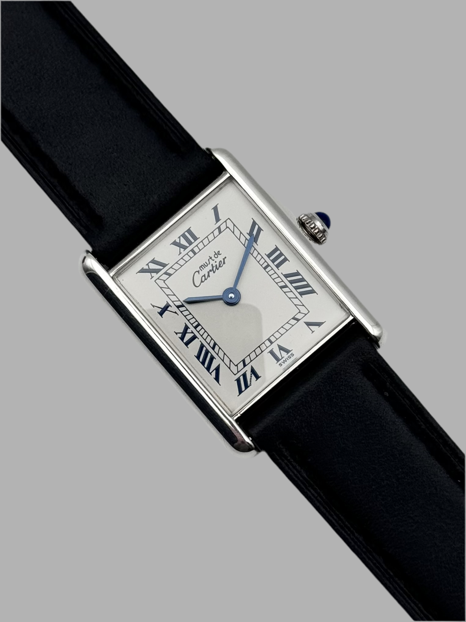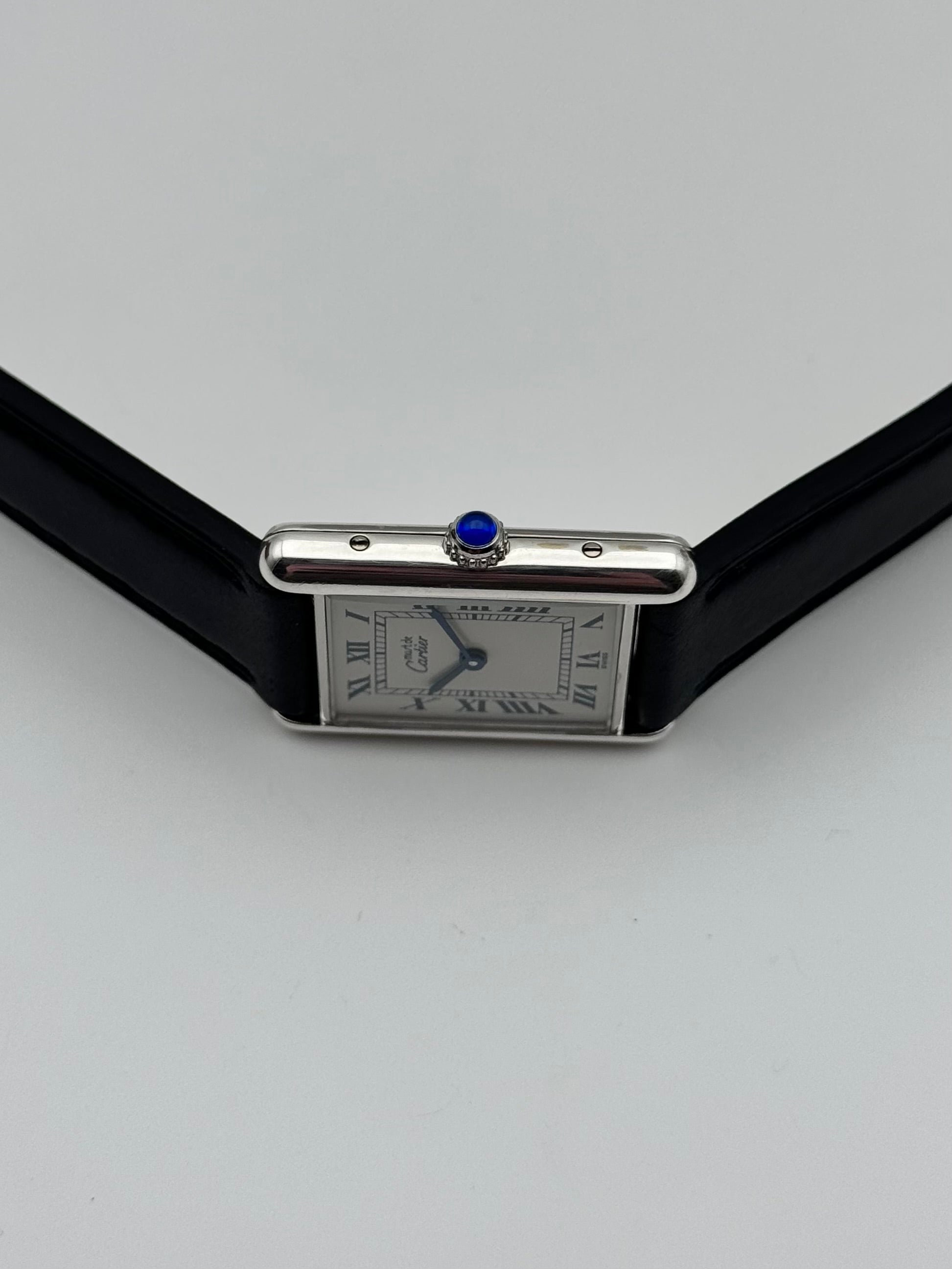 This is an absolutely stunning and classy vintage Must De Cartier Tank which features a quartz movement which is working perfectly and keeping excellent time. This piece features a solid 925 silver case. This watch features a very desirable silver dial which hosts blue markers and stunning blue hands. This Cartier is in incredible condition and is complete with its original: