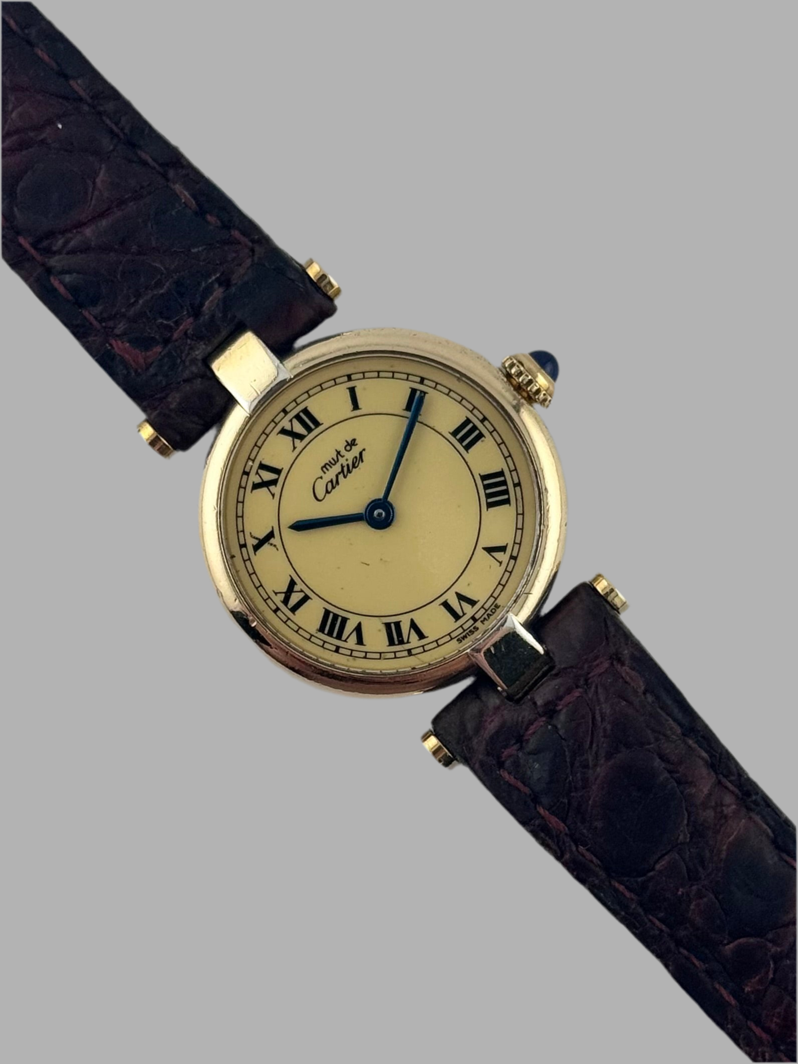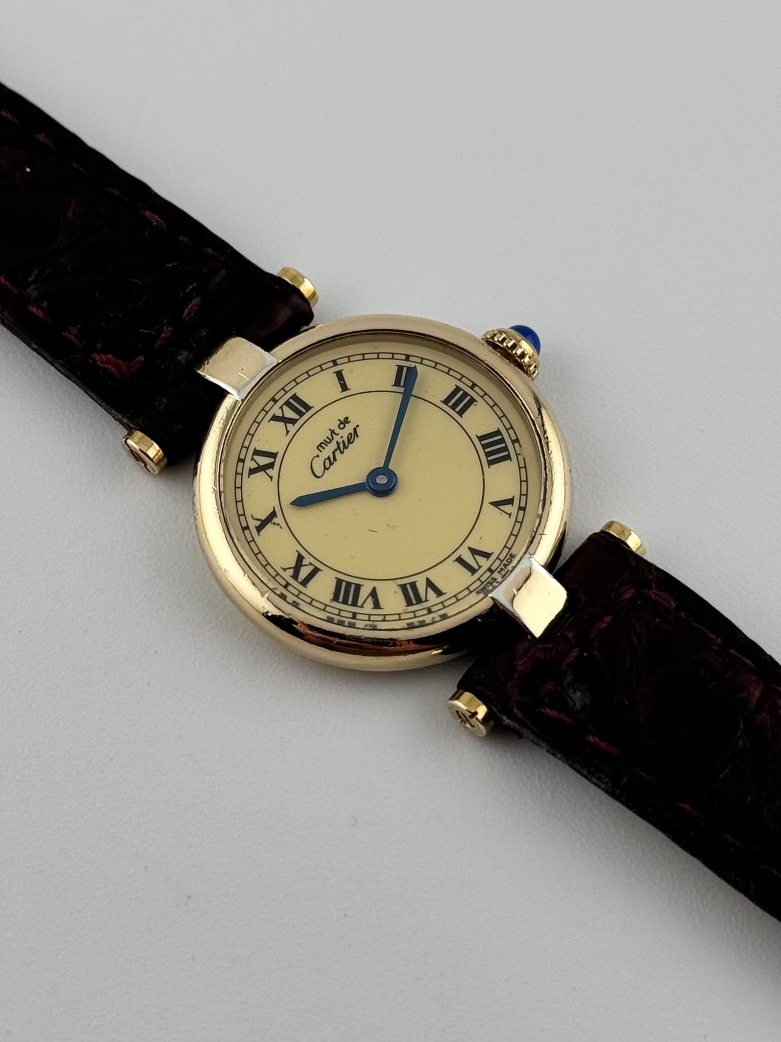 This is a beautiful vintage Must De Cartier Vermeil which features a lovely champagne dial in a gold vermeil plated 925 silver case. In addition, this watch is not short on other iconic features such as the Cartier rail track, sword blued hands and a secret signature within the Roman numerals. This Cartier is in nice vintage condition showing some common signs of wear and age. The Cartier quartz movement is working perfectly and keeping excellent time.
