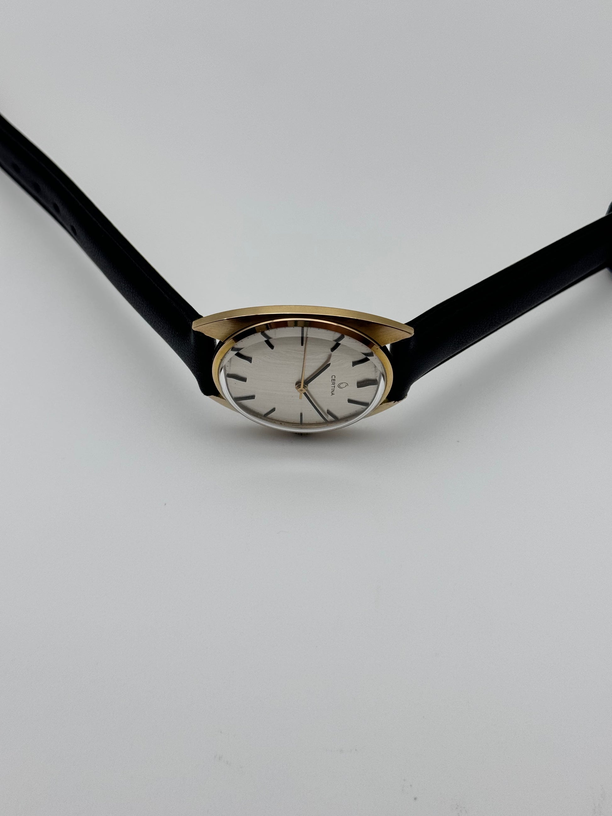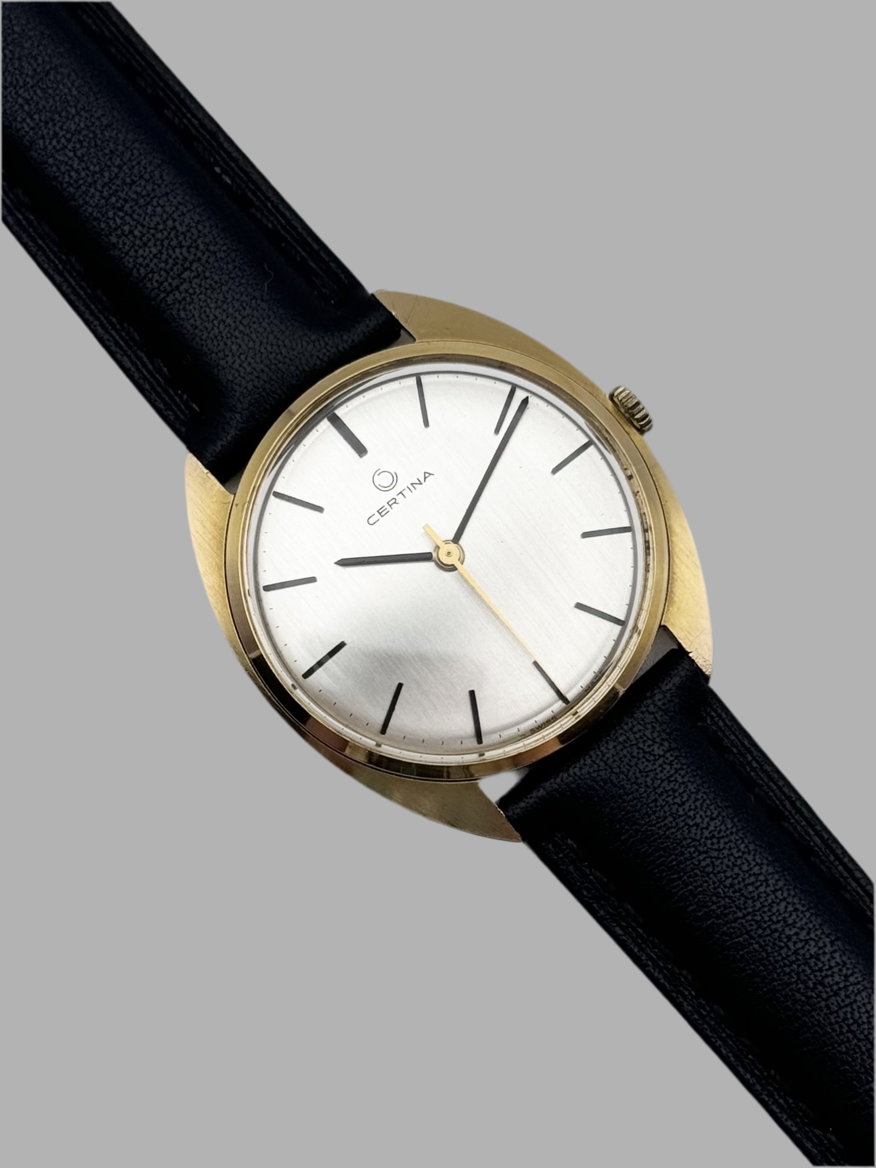 This is an absolutely spectacular vintage manual wind Certina. This model features a lovely brushed sunburst silver dial that is complemented by gold bar markers. The watch is in excellent condition for its age and is showing just light wear. Mechanically the watch is working perfectly and keeping time within vintage specification. These vintage Certinas provide Swiss luxury and status for very little money!