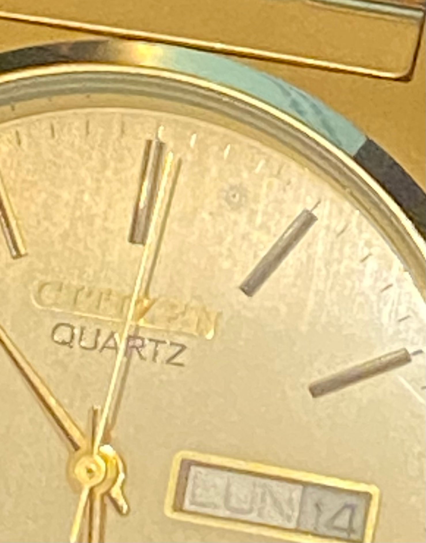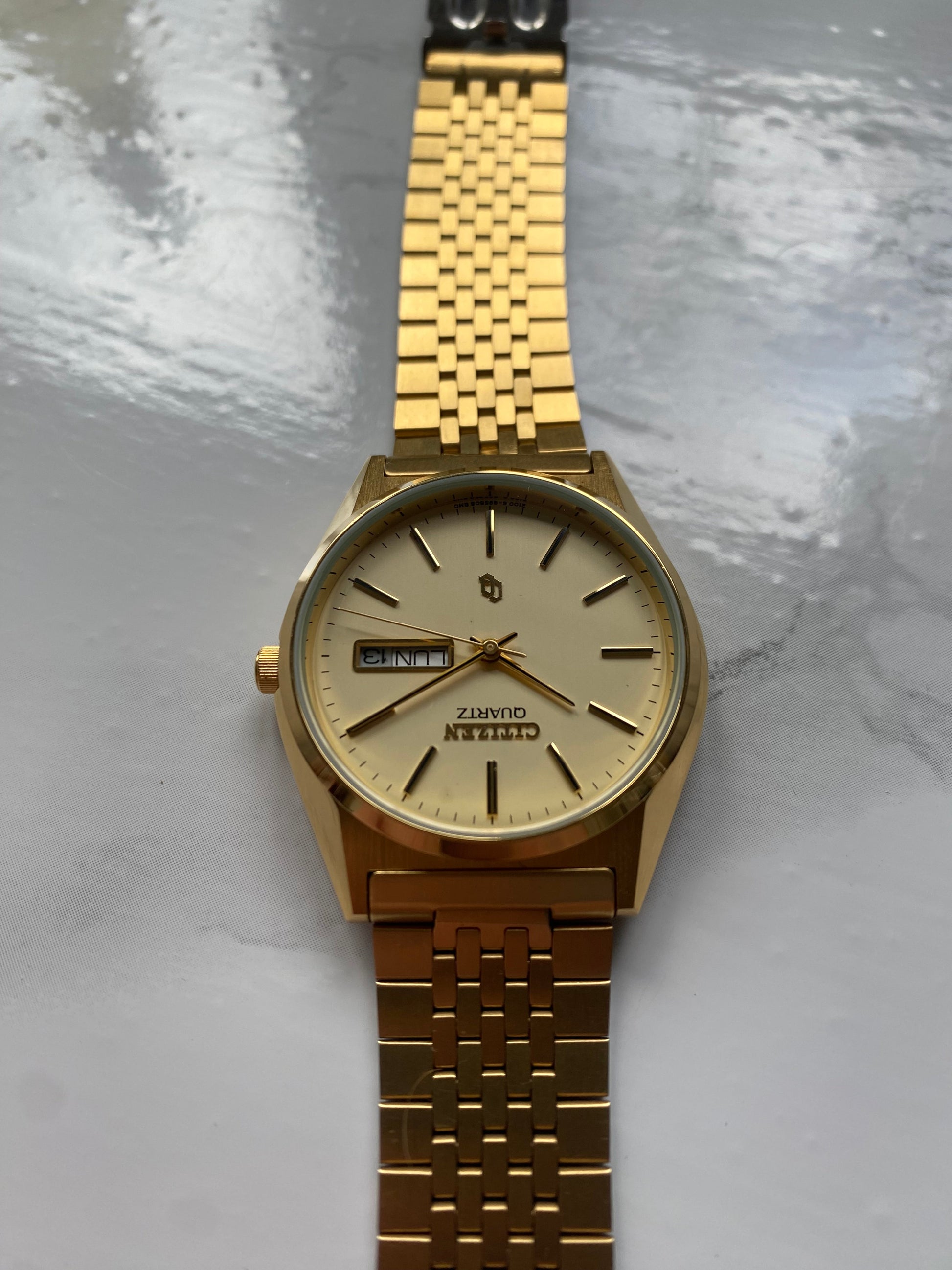 This beautiful Citizen is in nearly brand new condition. The watch features a lovely champagne dial that displays an English/ French day-date. This piece comes with its original box. There is a very small spot on the dial which is only visible in very specific lighting.