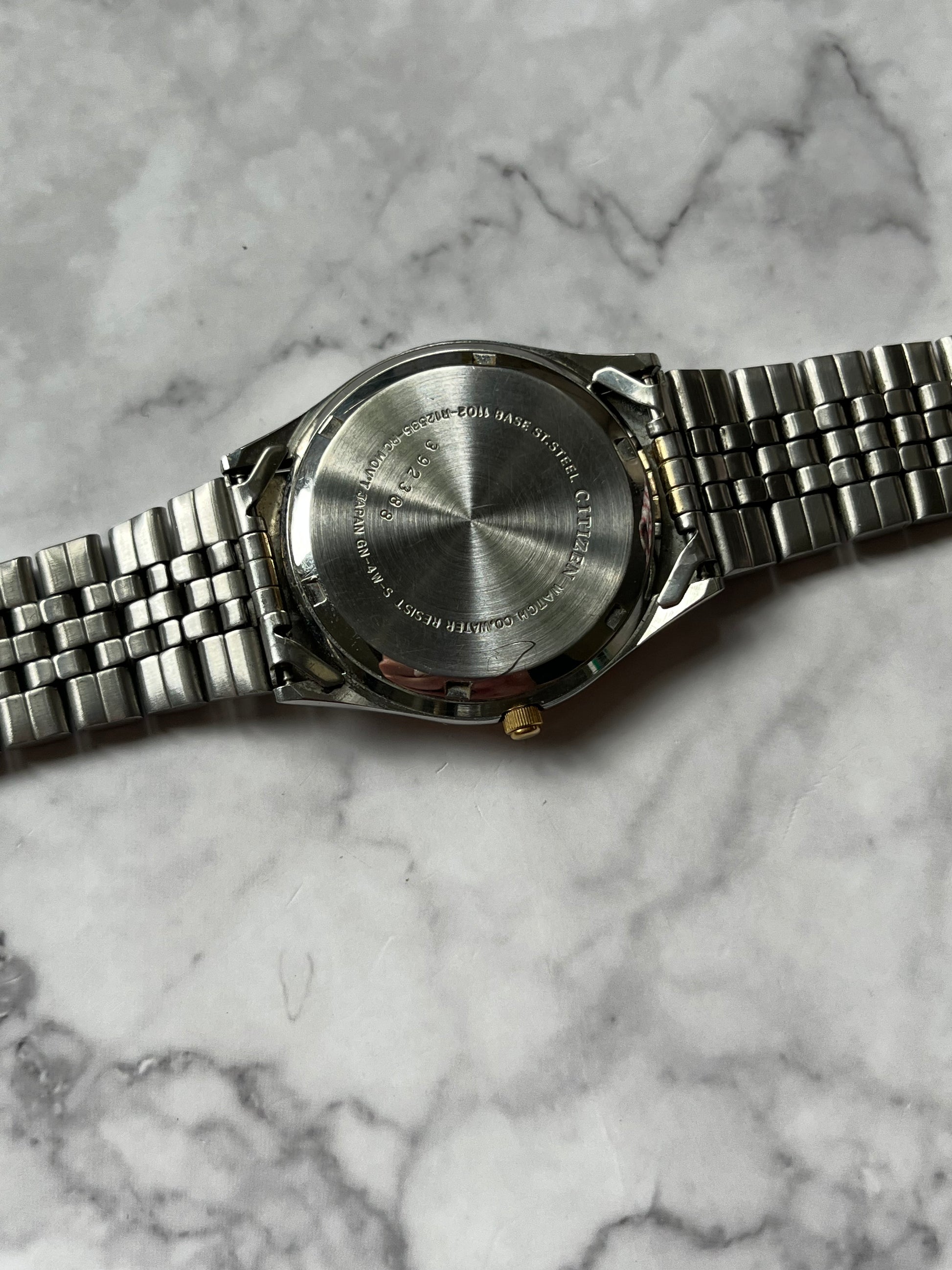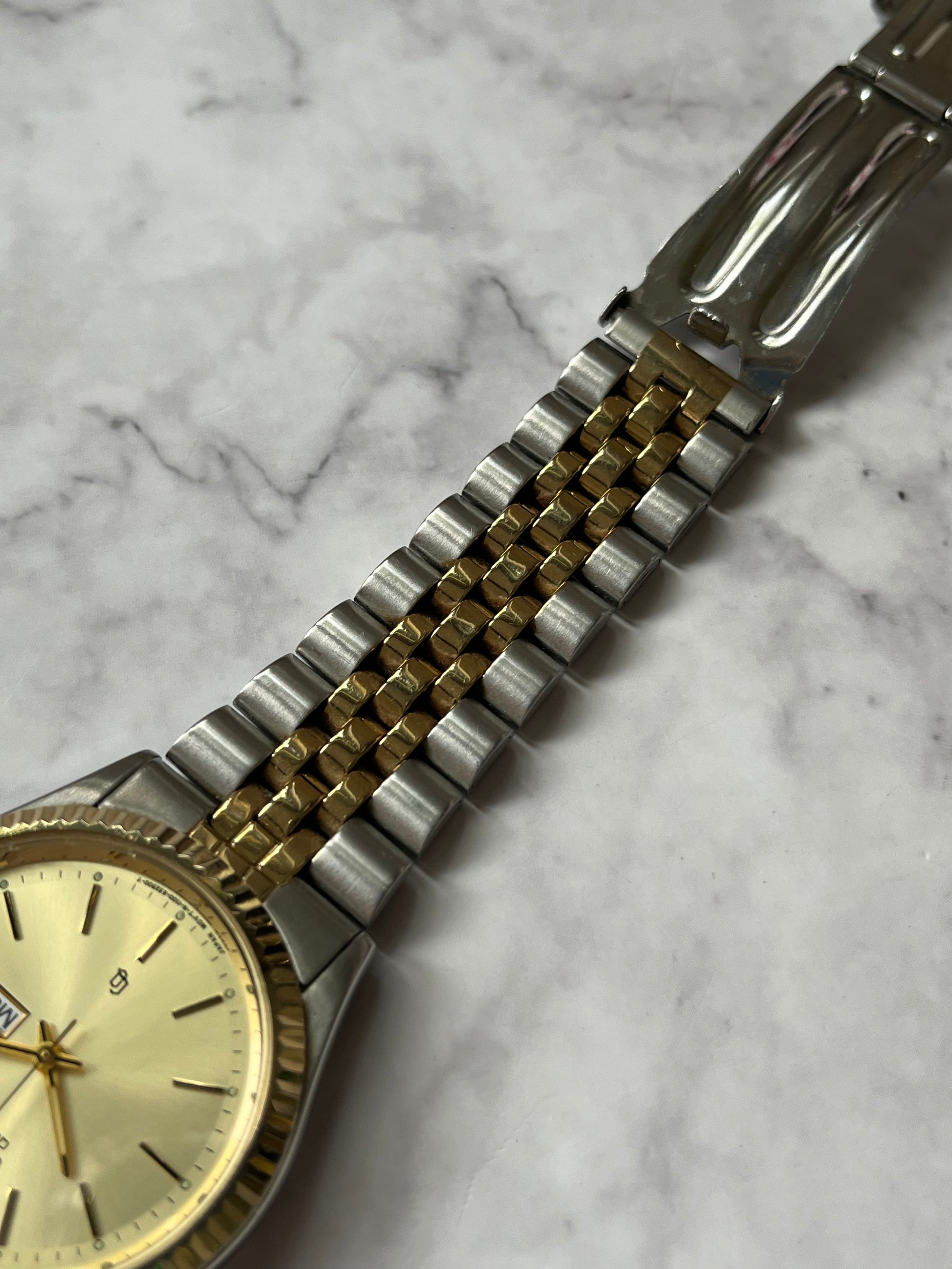 This Citizen Quartz is in spectacular condition for its age showing little signs of wear. This piece features a two tone jubilee bracelet, champagne sunburst dial, and a fully functional English/Spanish day-date. The watch is fully working and keeping time.