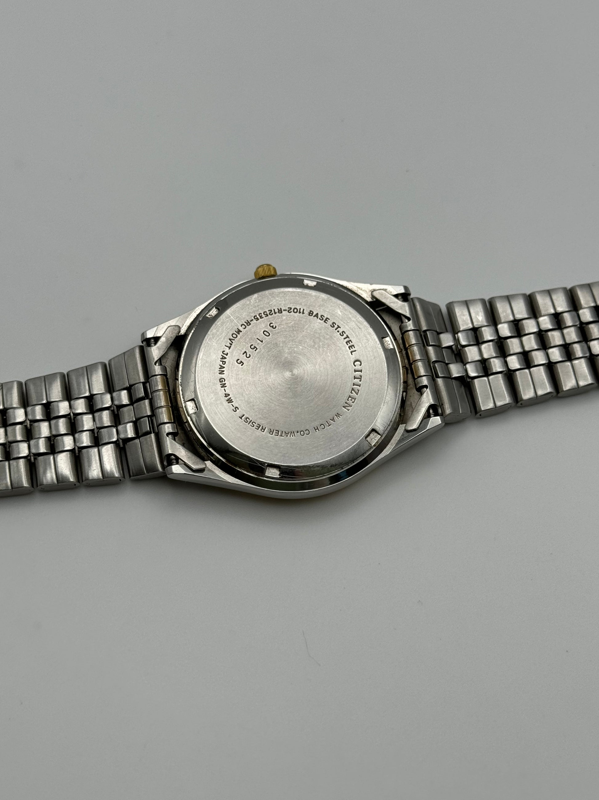 This Citizen Quartz is in nice condition for its age showing only light wear. This piece features a two tone jubilee bracelet, champagne sunburst dial, and a fully functional English/Spanish day-date. The watch is fully working and keeping time. There are just one or two small scratches to the crystal.