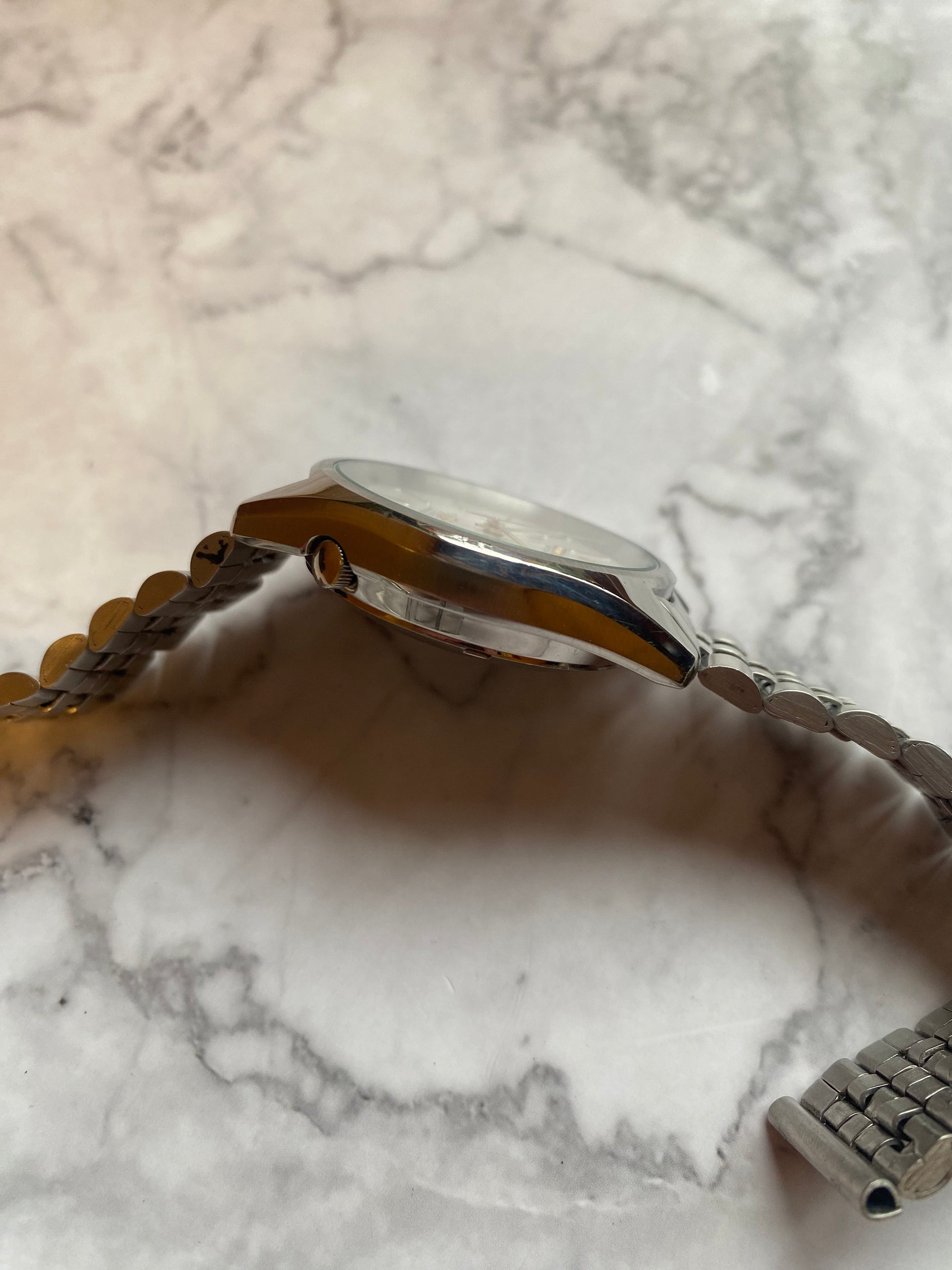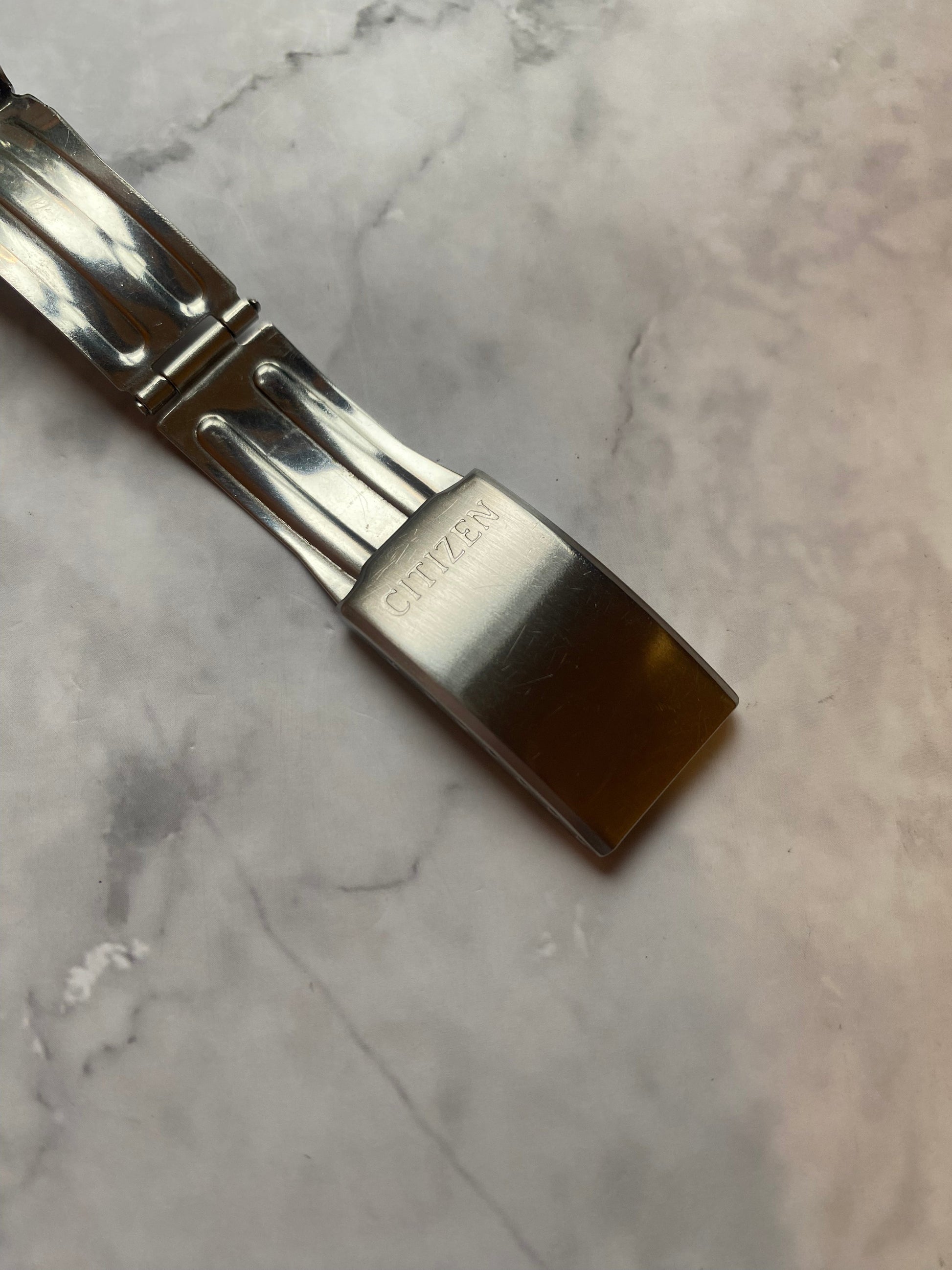 This vintage Citizen Eagle 7 is in great condition for its age. The only noticeable wear on the watch is the few scratches it has on the crystal which are only seen in specific lighting. The watch comes complete with its original box and features a beautiful brushed silver dial which displays a fully functional English/French day-date. Please note changing the day can be a little fiddly however this is completely normal on these watches. When you get the hang of how it works it’s not difficult at all! The case back also has its original protective sticker.