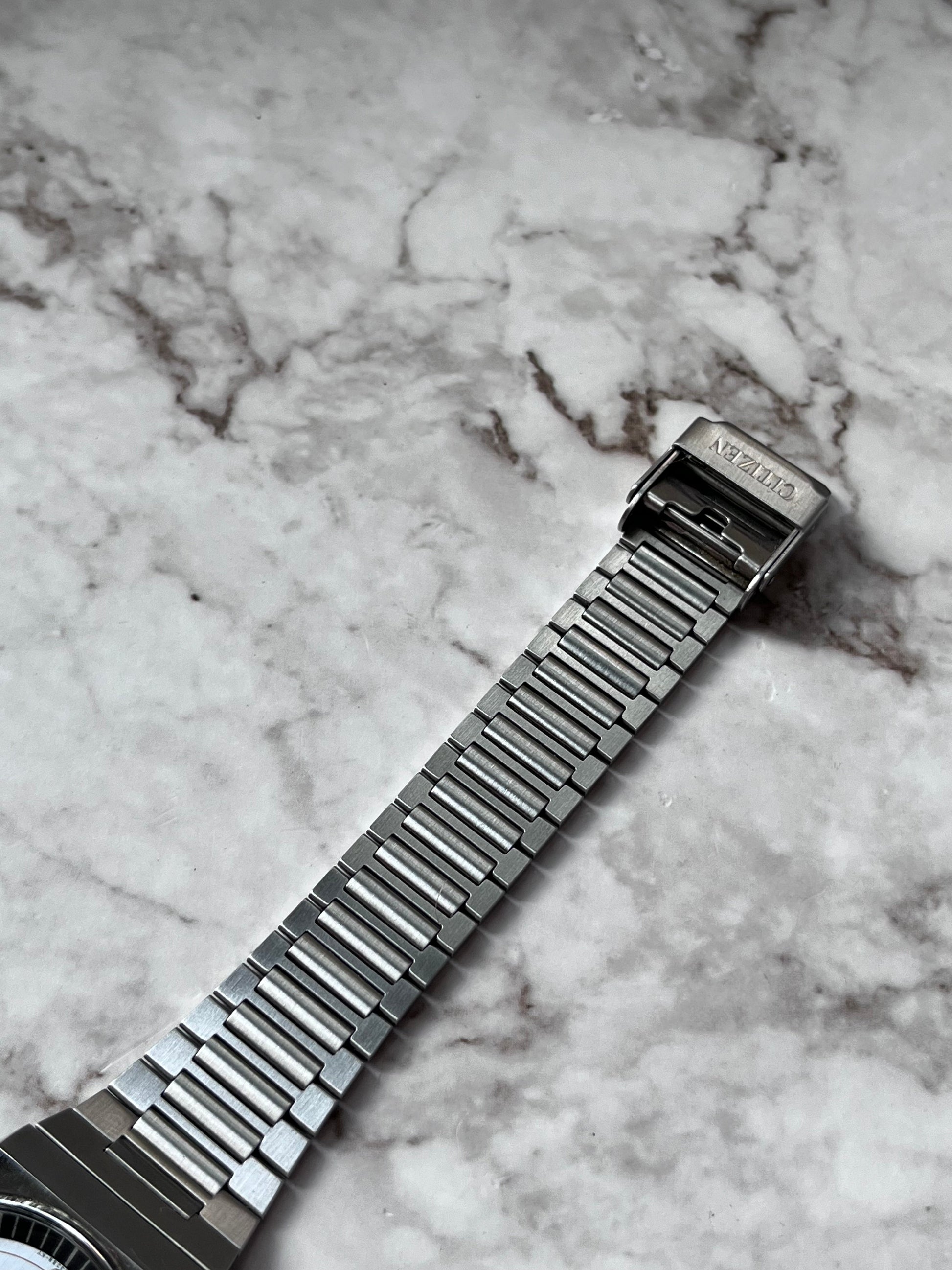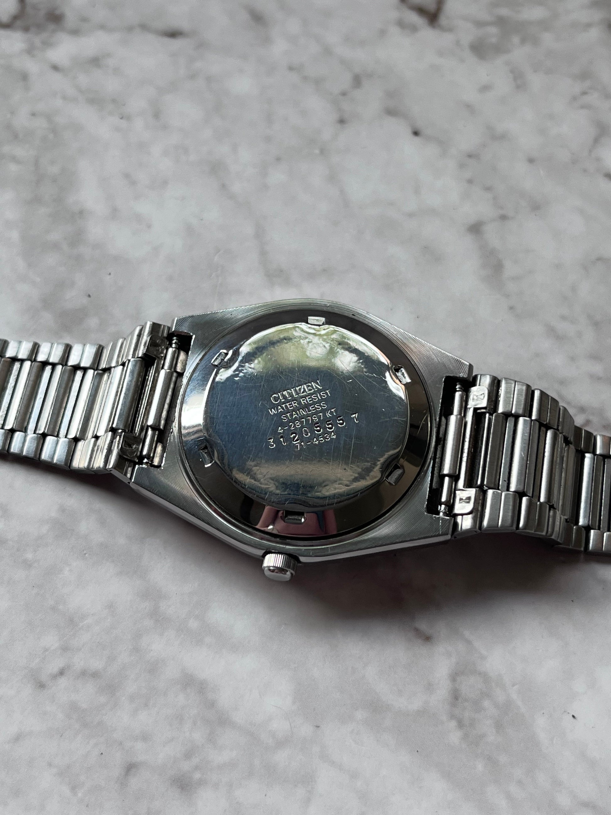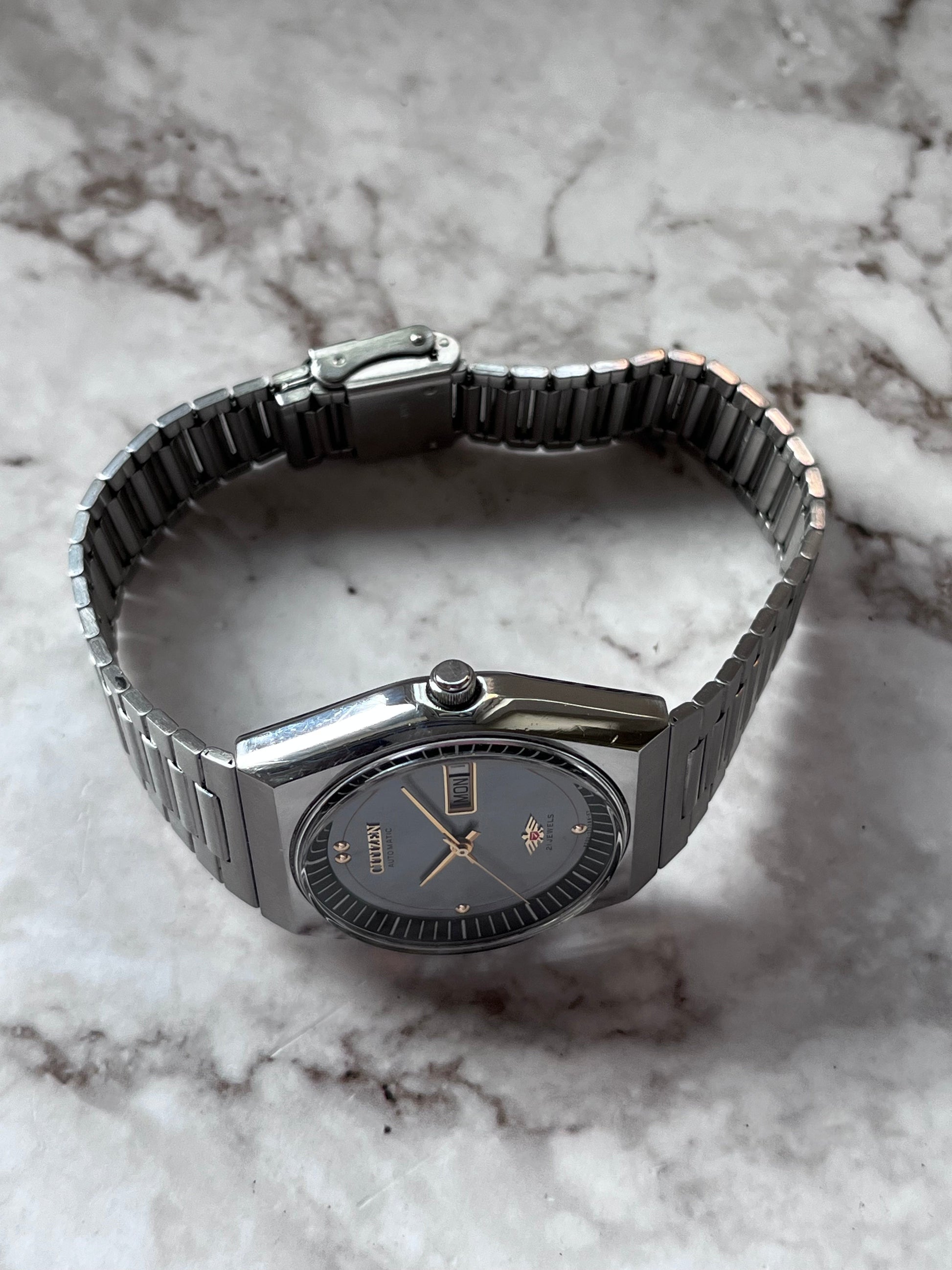 This is a stunning vintage Citizen automatic which is in excellent condition for its age showing light signs of wear. The watch features a brushed grey dial which displays a black inner bezel and a fully functional English/Spanish day-date. This piece is in perfect working order and keeping time.