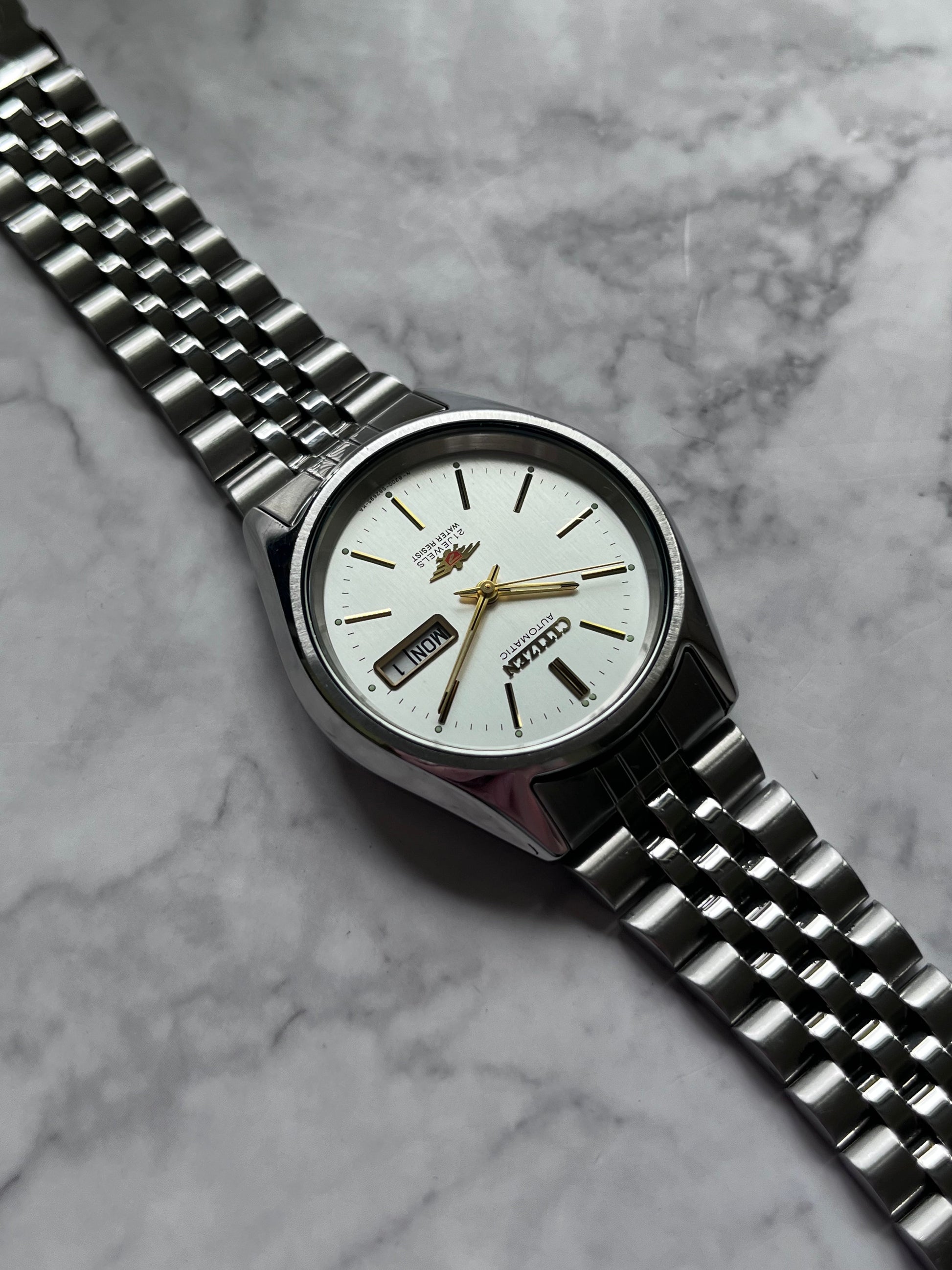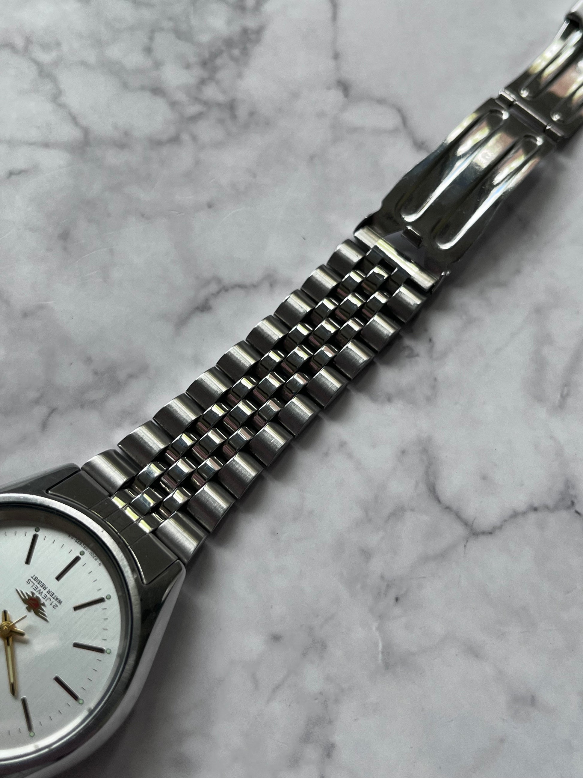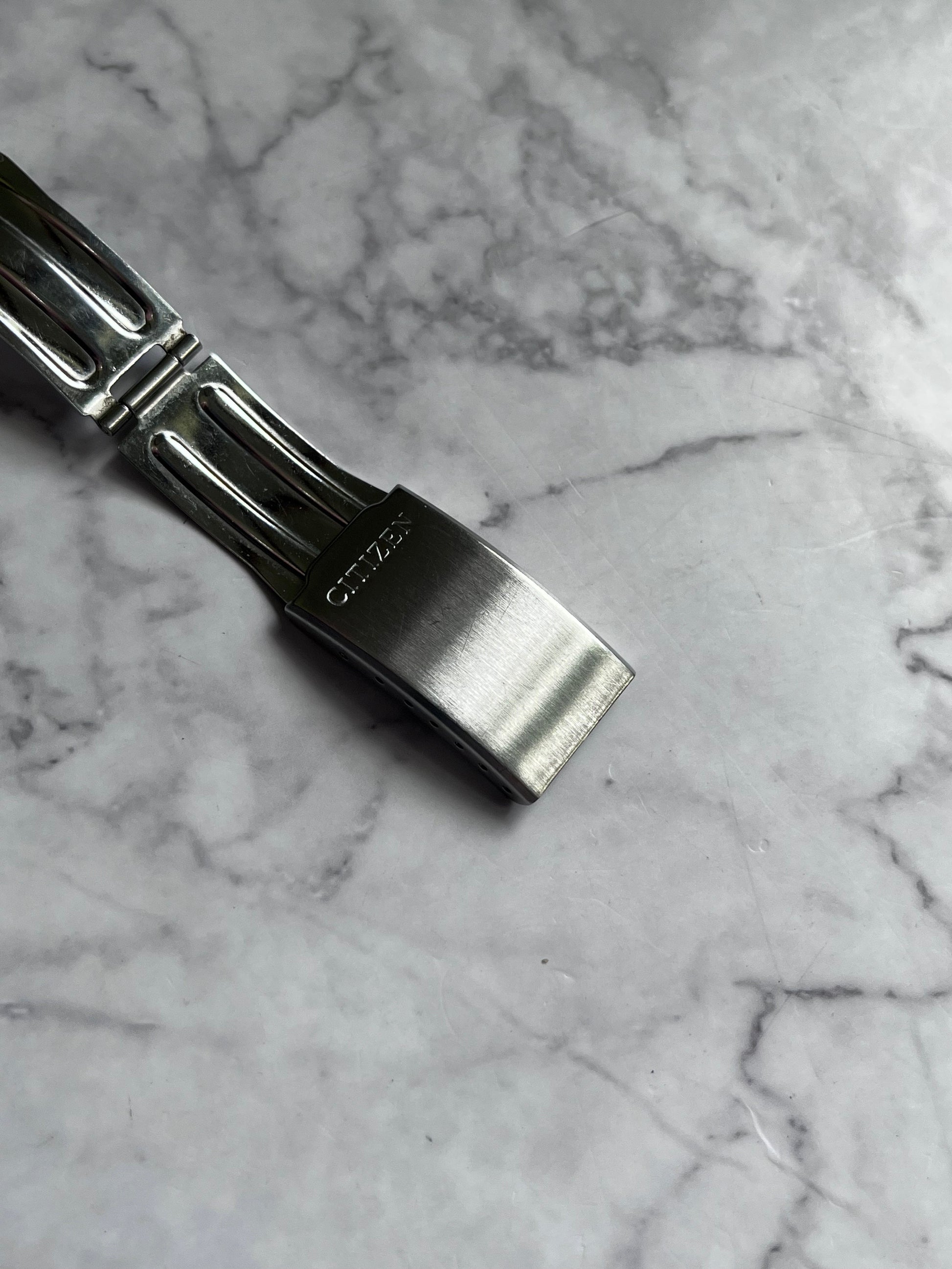 This vintage Citizen is in excellent condition for its age and is showing little signs of wear. This model features a lovely brushed silver dial which displays a fully functional English/German day-date. The watch is fully working and keeping time.
