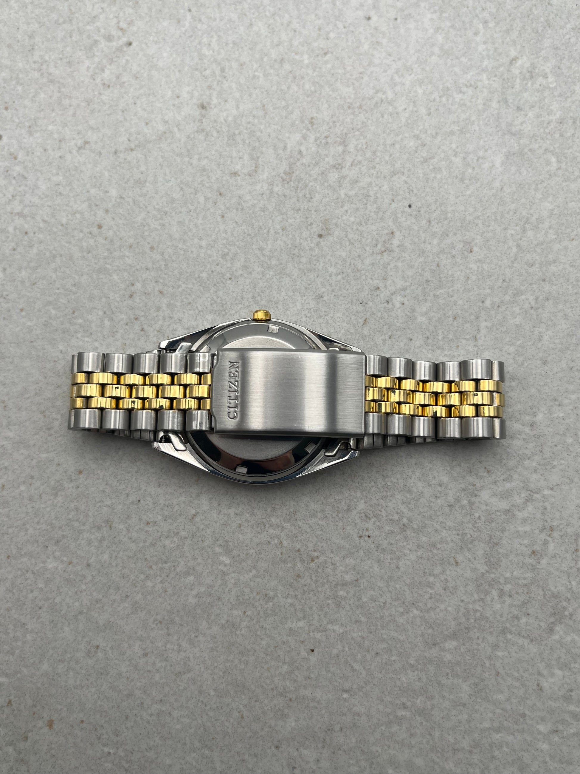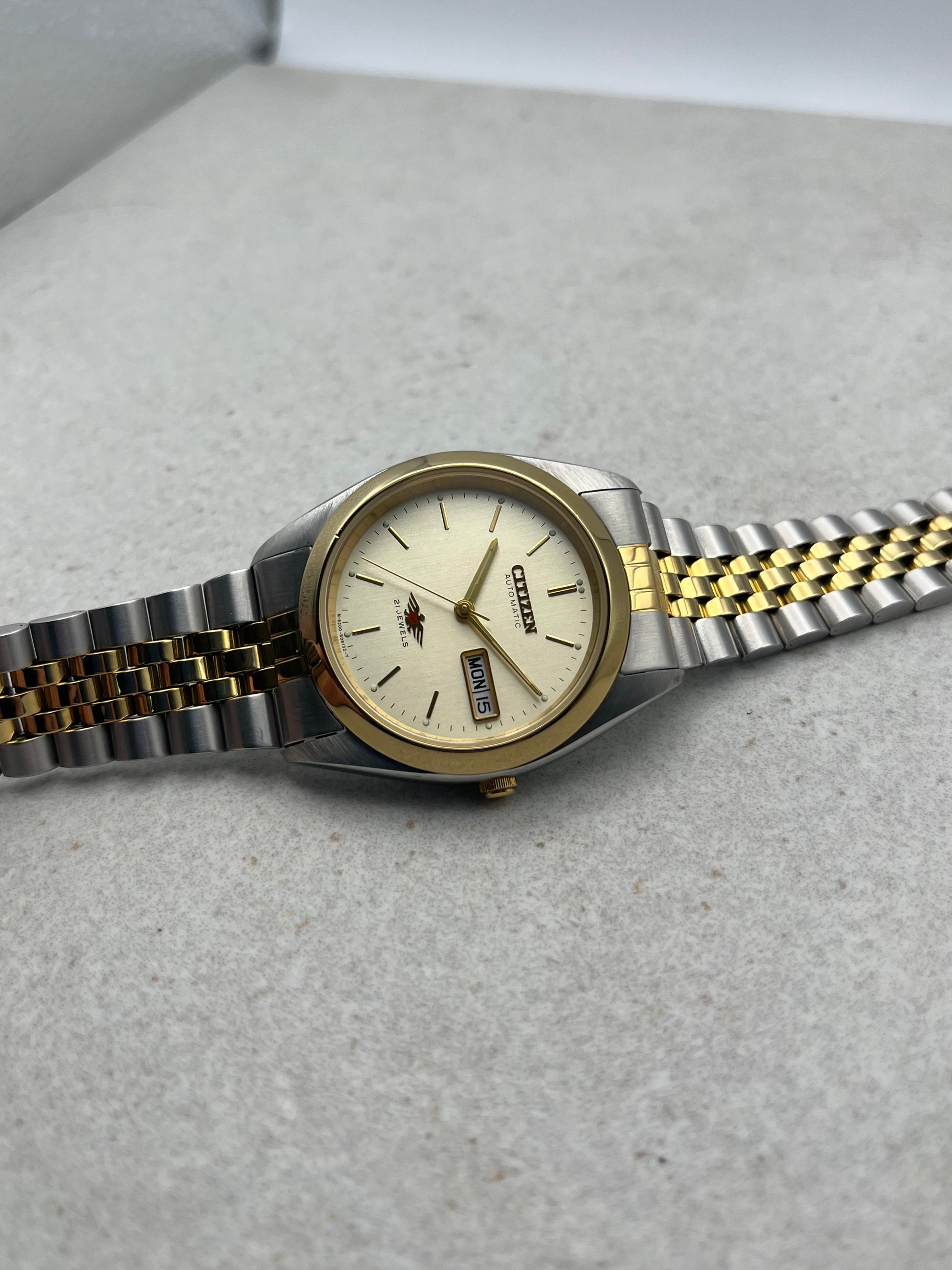 This is a lovely two tone Citizen Eagle 7 Automatic which features a brushed champagne dial that displays a fully functional English/German day-date. The watch is fully functional and keeping time. This example is also in great condition showing only light wear.