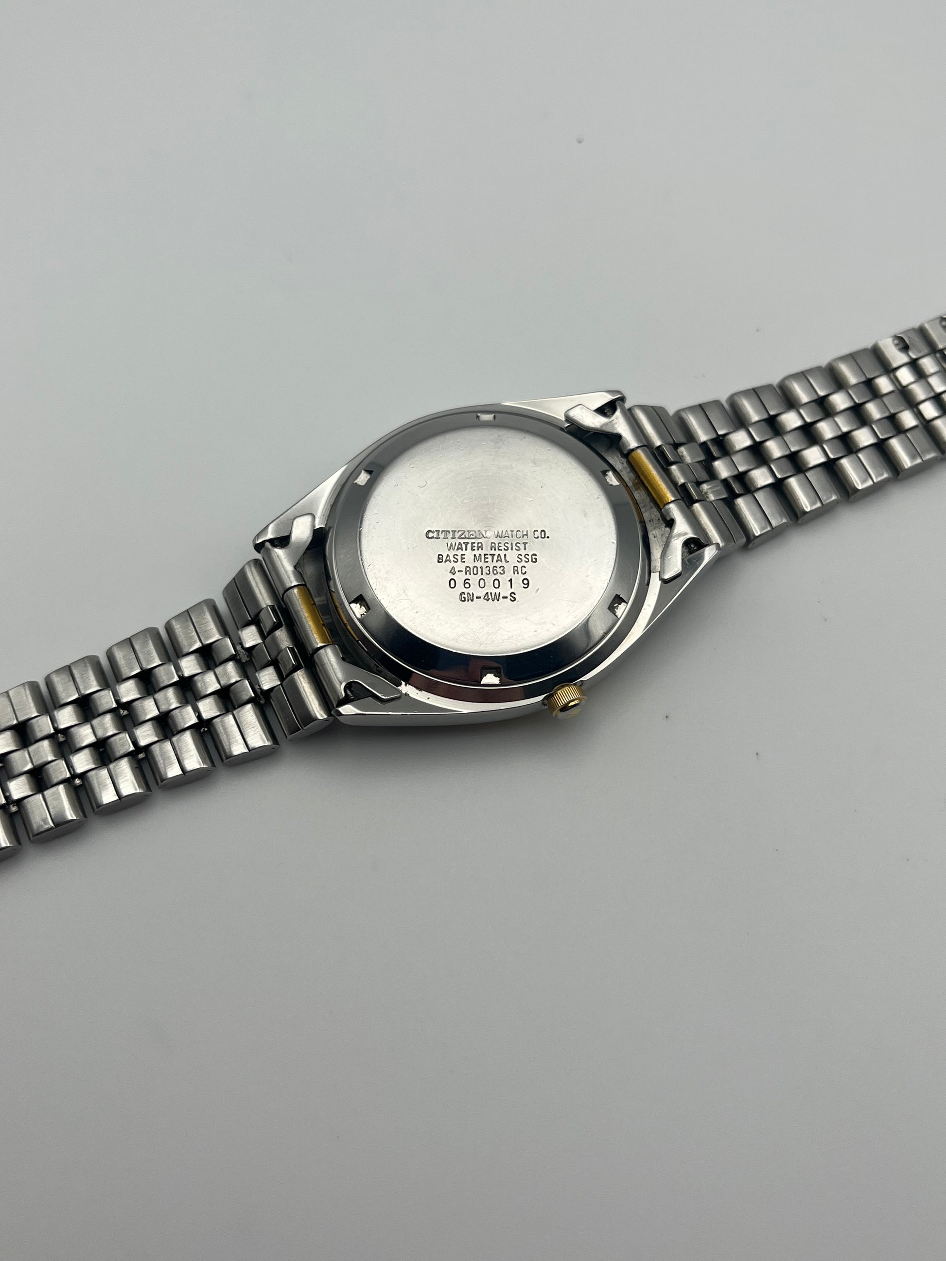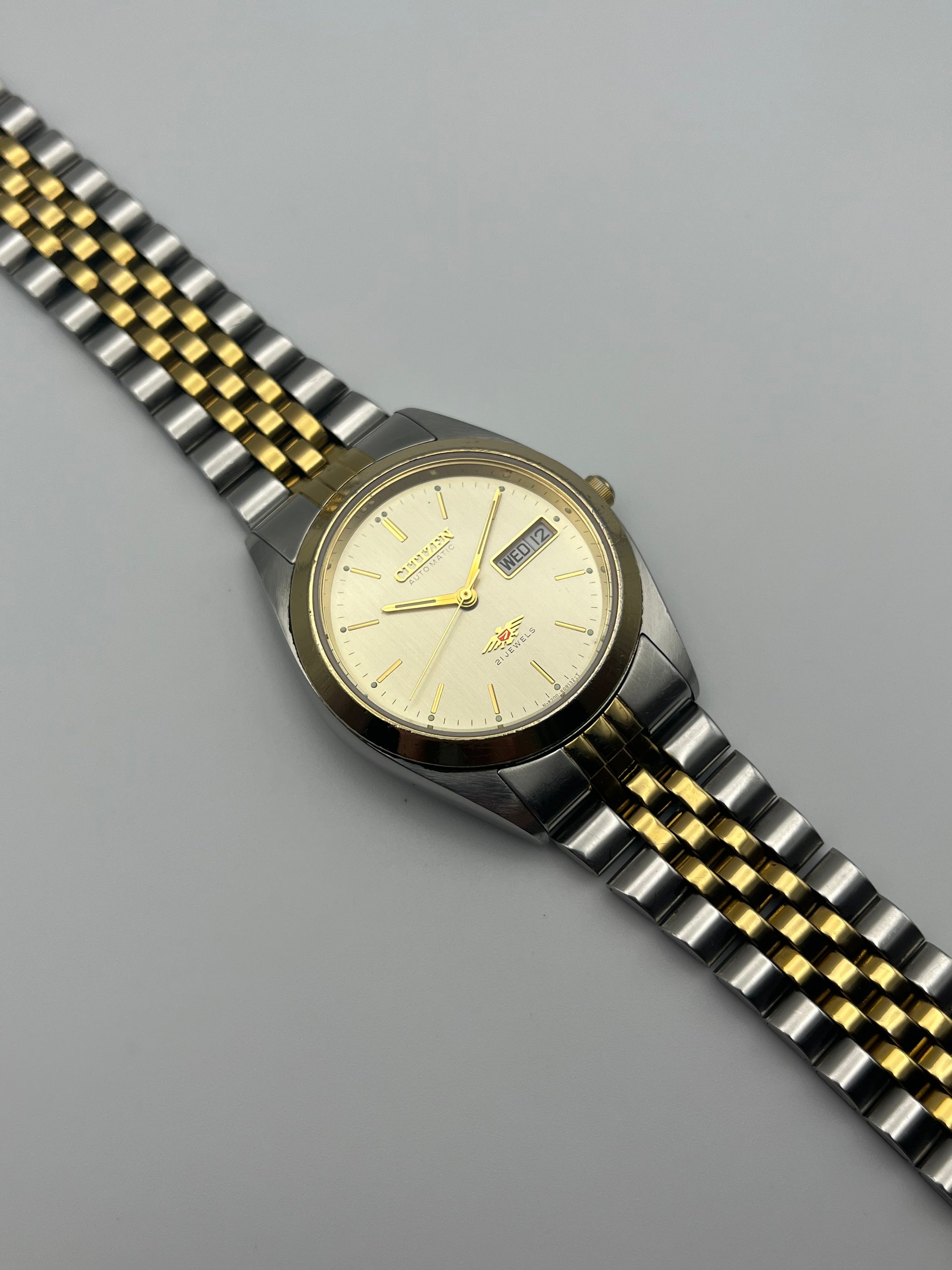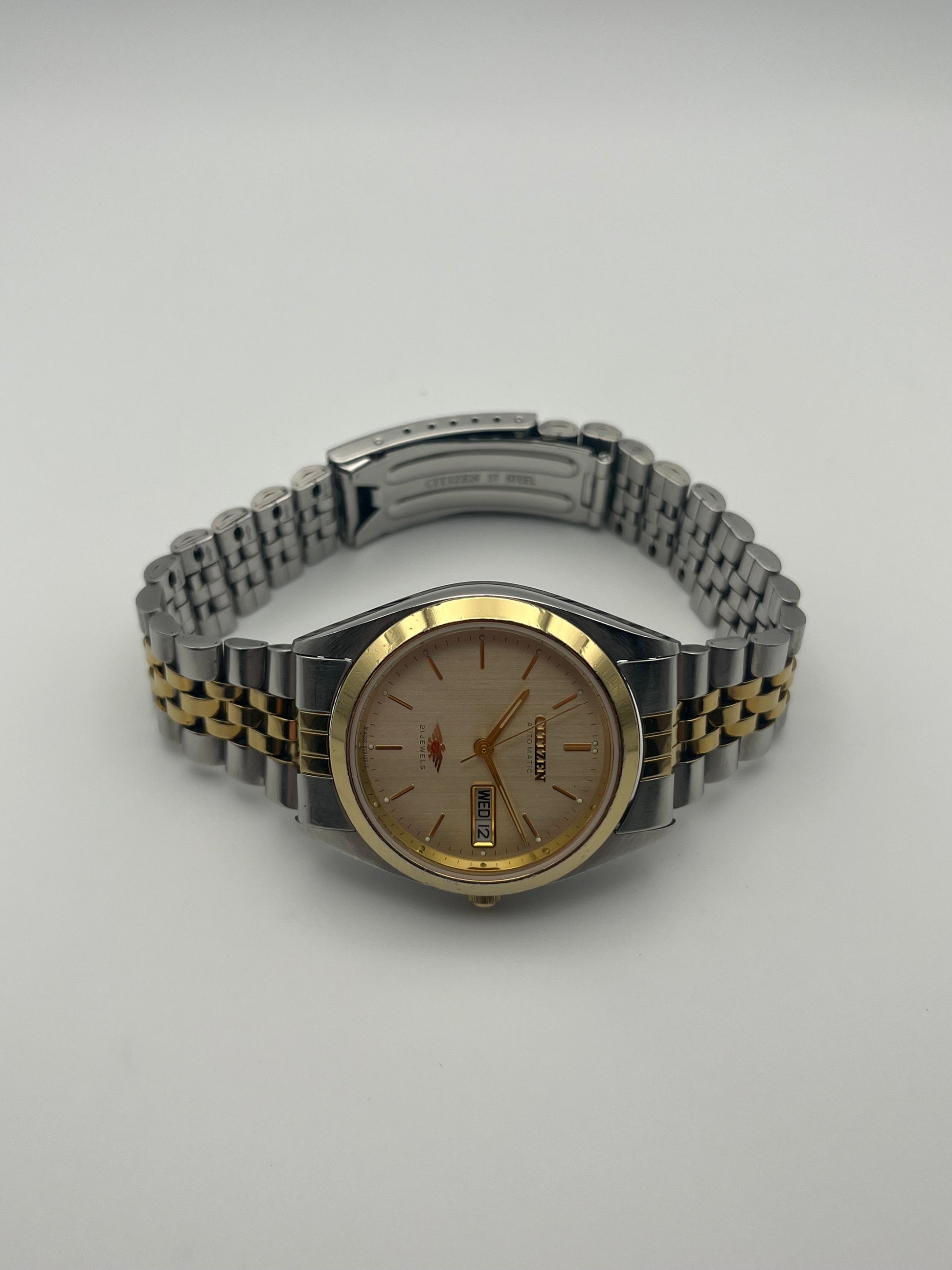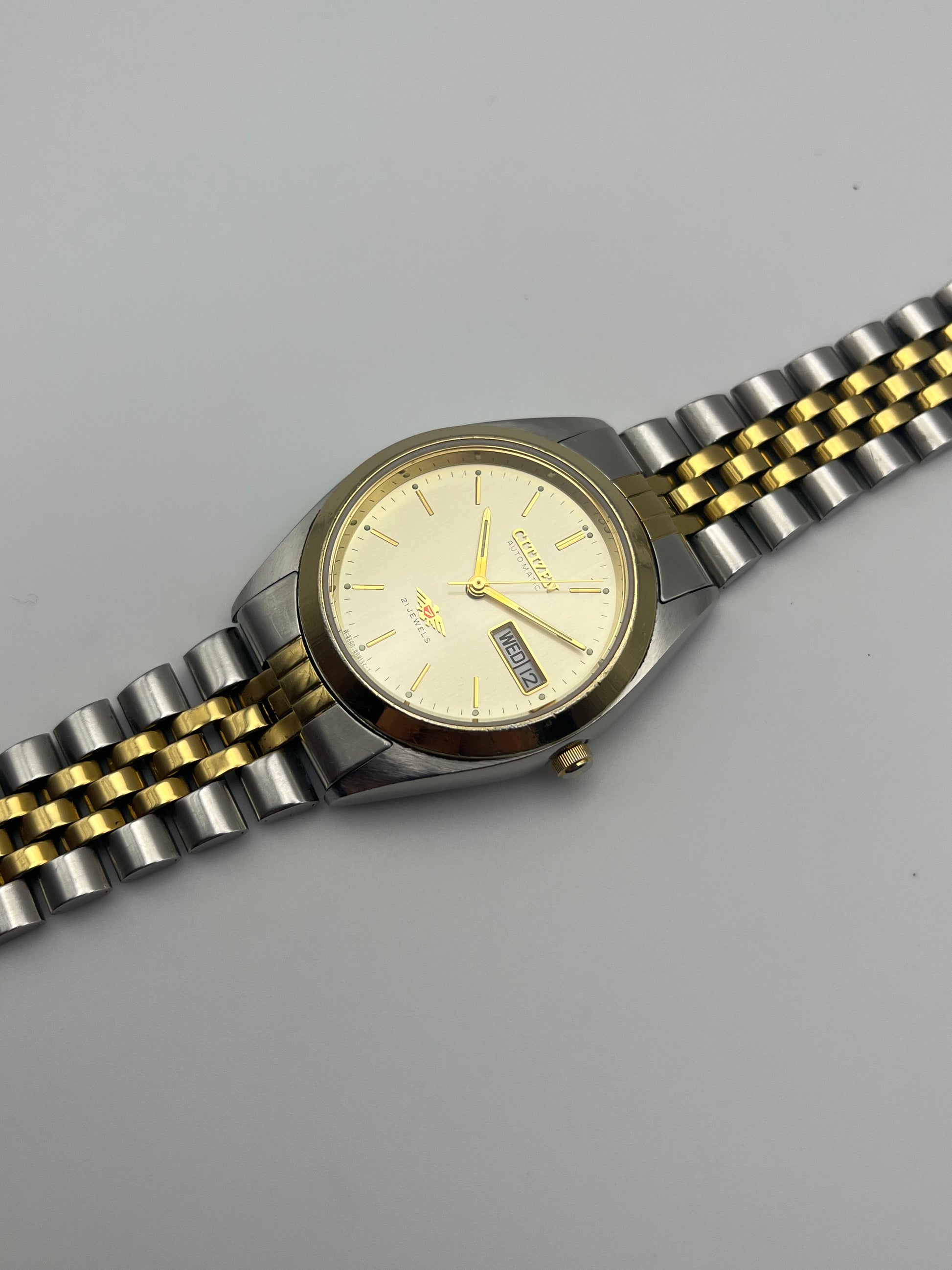 This is a lovely two tone Citizen Eagle 7 Automatic which features a brushed champagne dial that displays a fully functional English/German day-date. The watch is fully functional and keeping time. This example is also in good condition for its age.