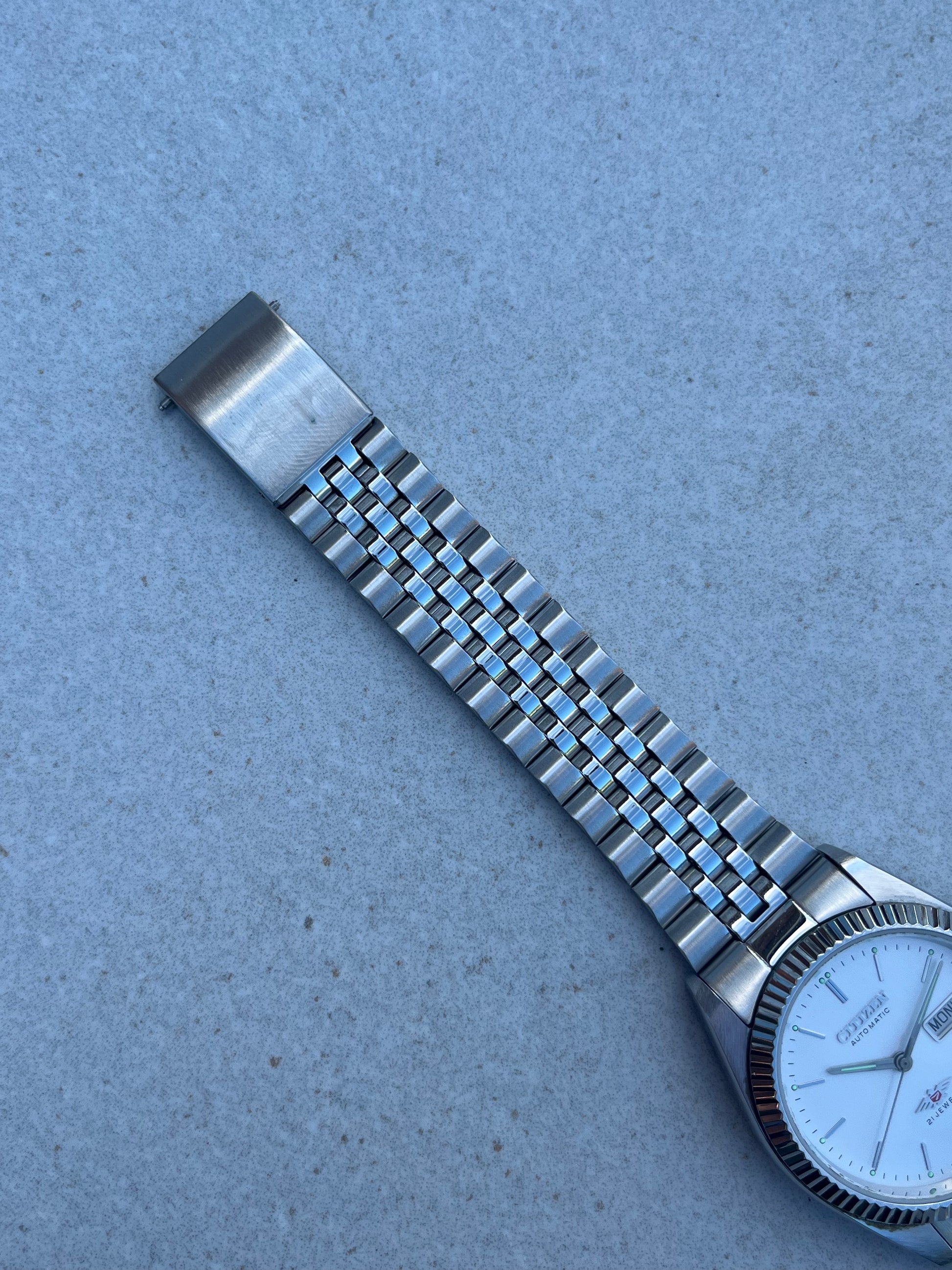 This is a lovely Citizen Eagle 7 Automatic which features a brushed white that displays a fully functional English/French day-date. The watch is fully functional and keeping time. This example is also in great condition showing very little wear. This watch is a perfect alternative to a Rolex Datejust! It also comes with box and papers!