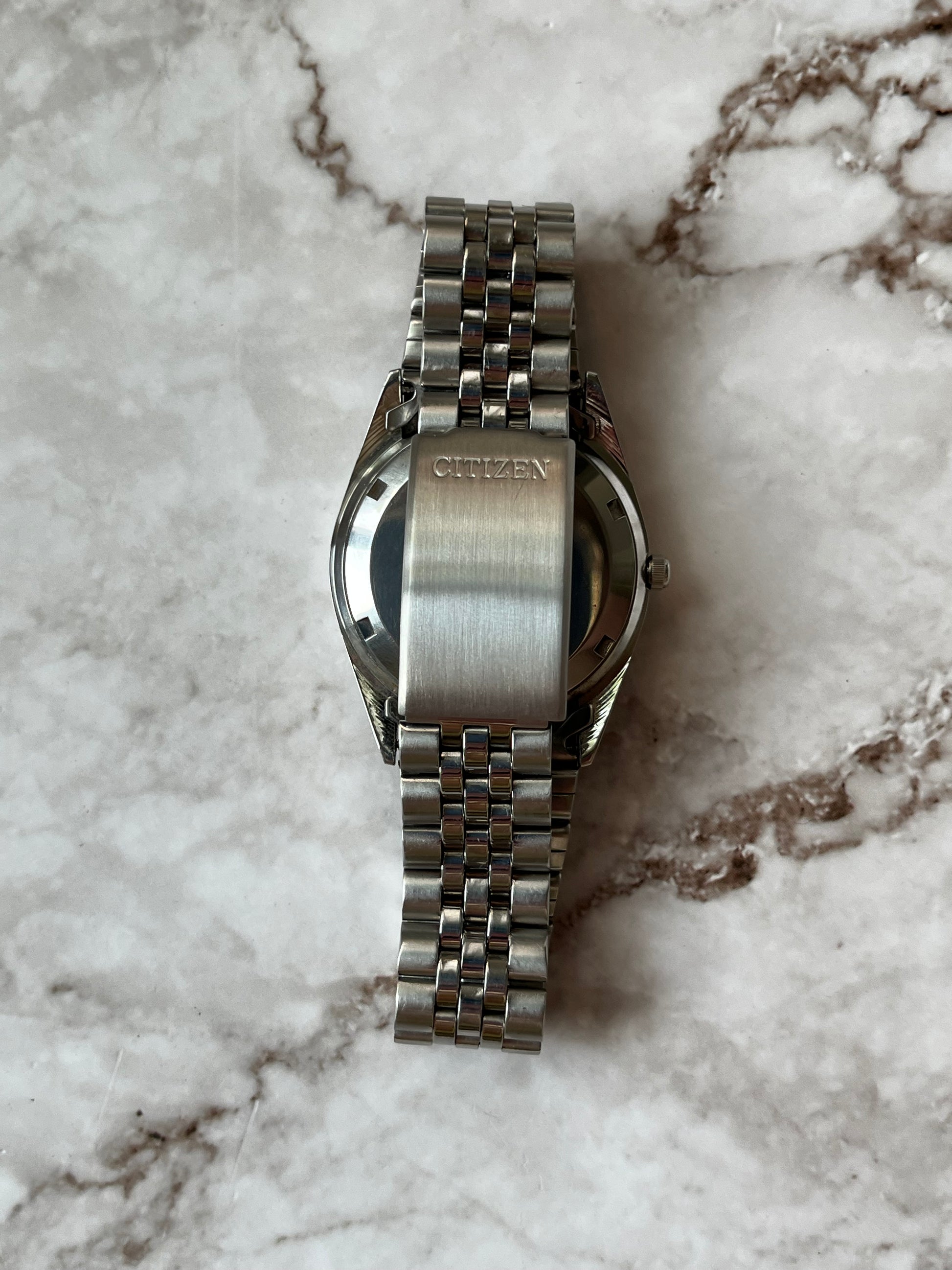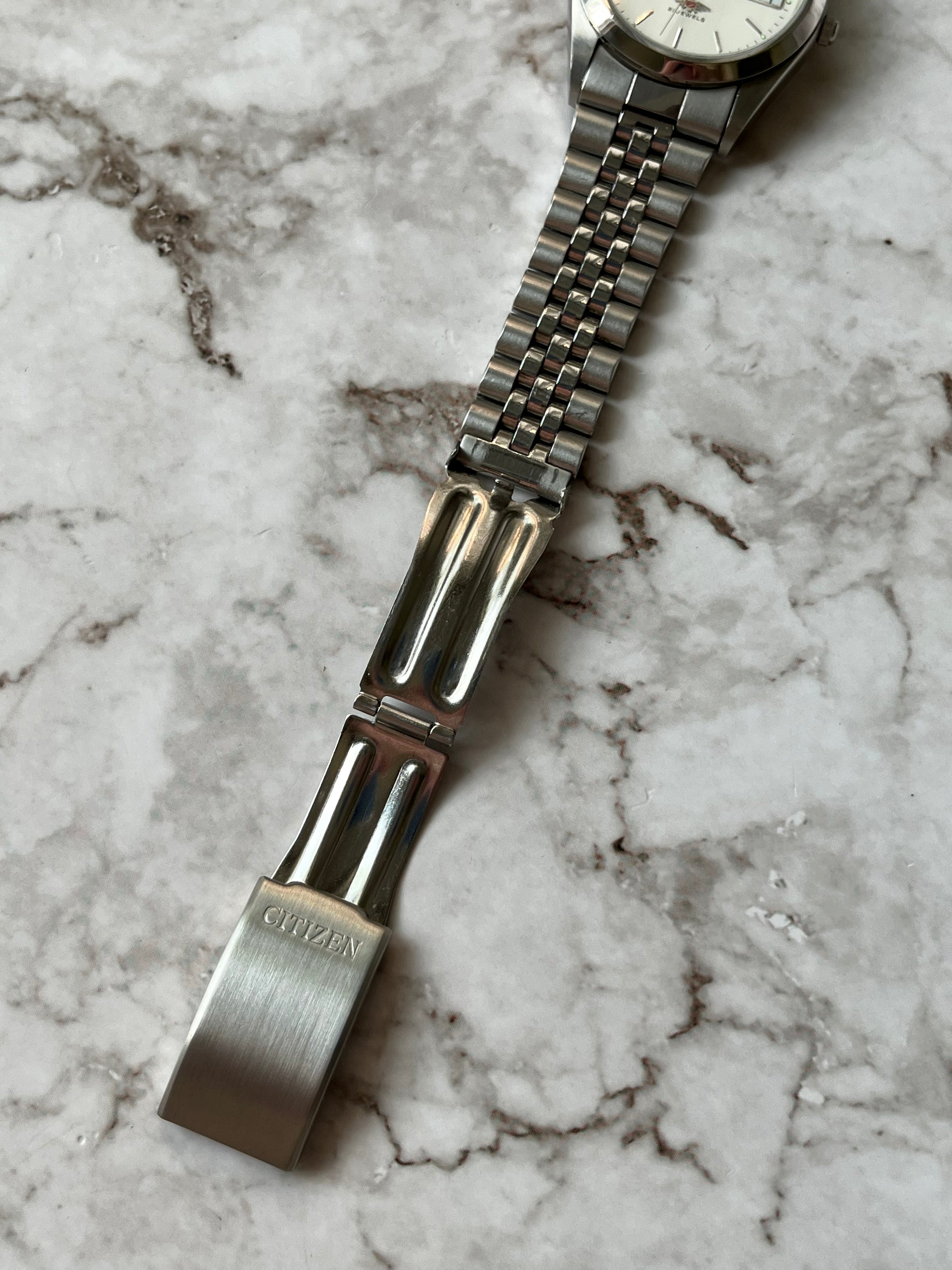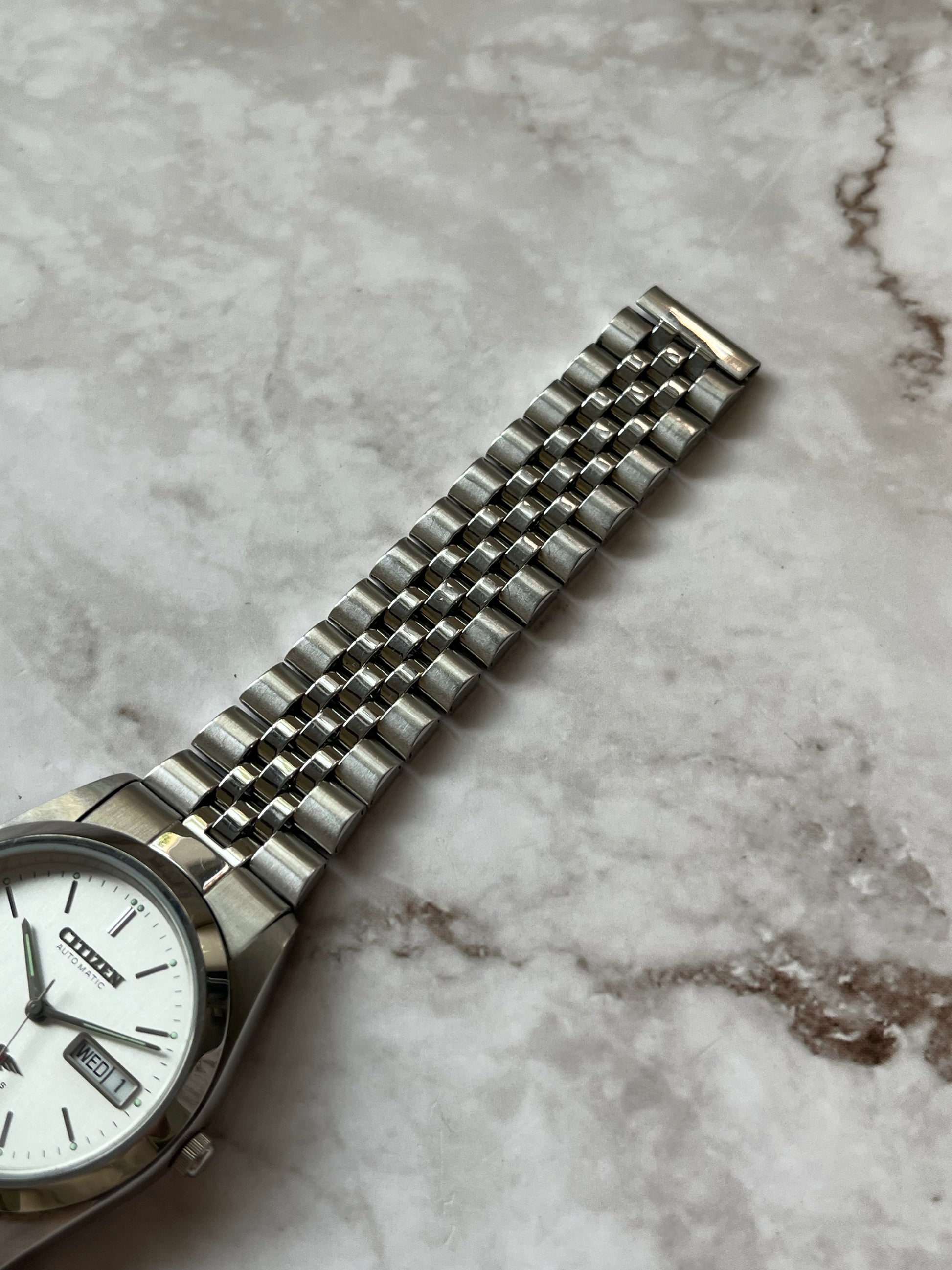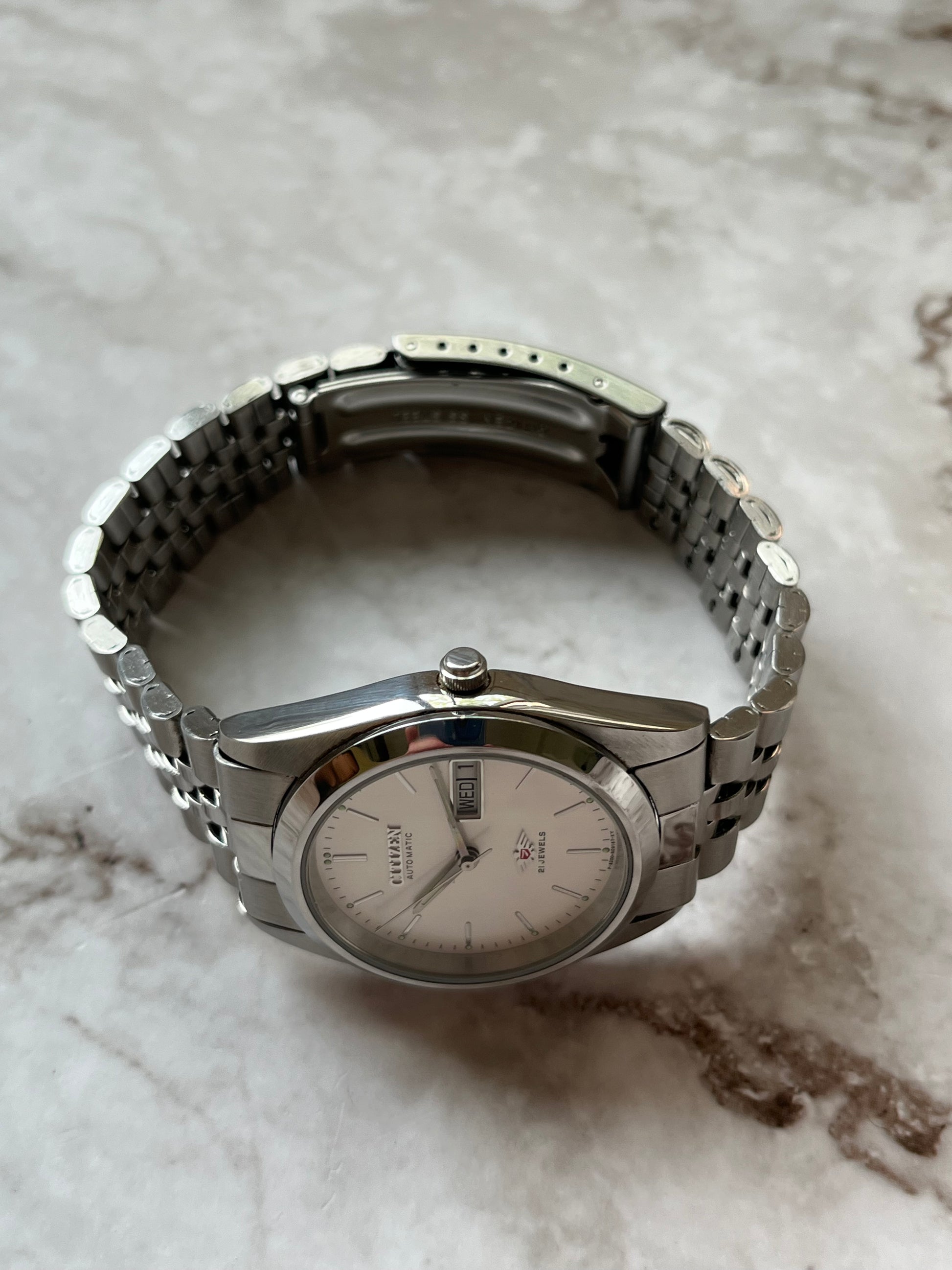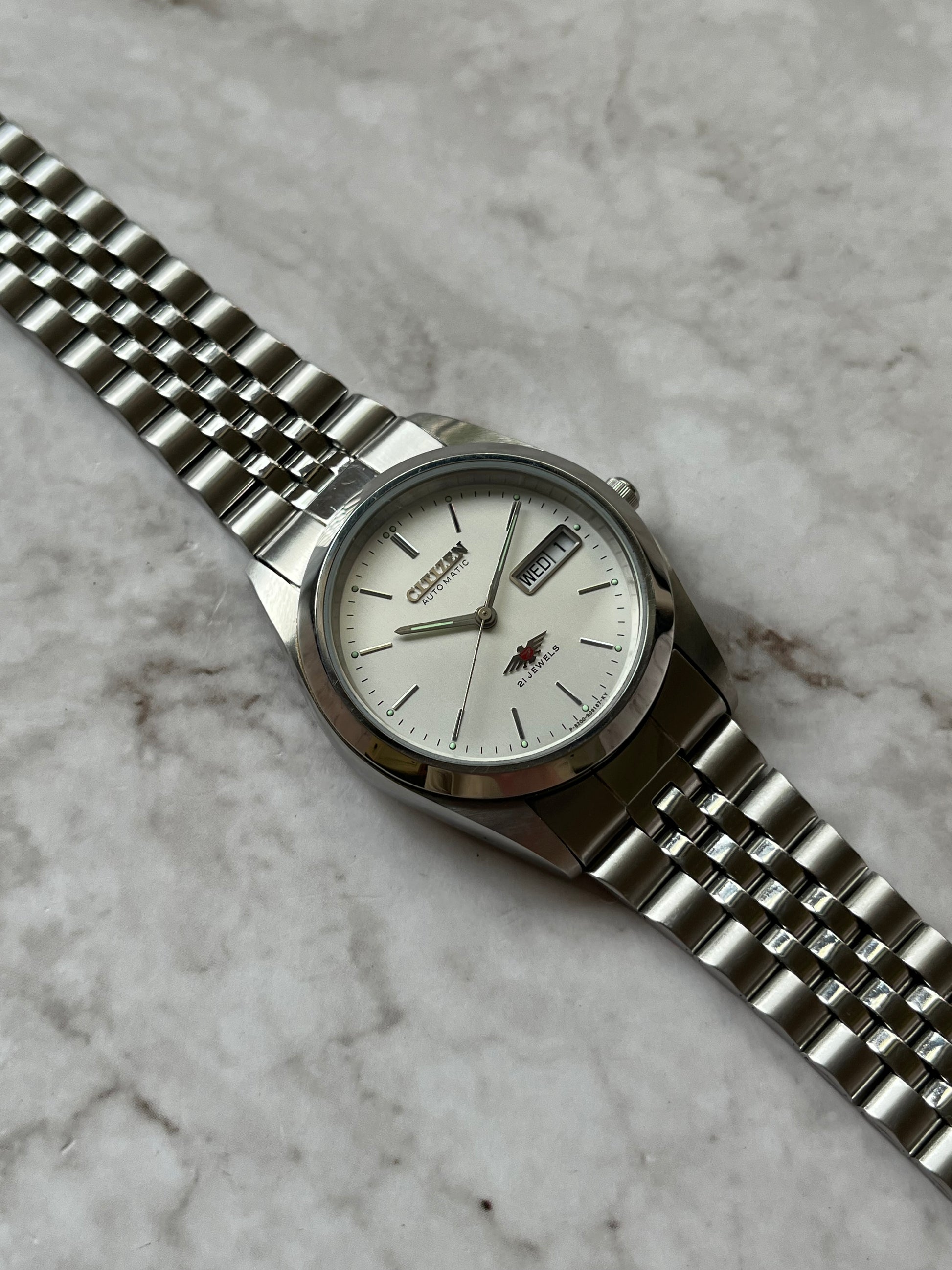 This is a lovely Citizen Eagle 7 Automatic which features a brushed white that displays a fully functional English/French day-date. The watch is fully functional and keeping time. This example is also in great condition showing very light wear. This watch is a perfect alternative to a Rolex Datejust!