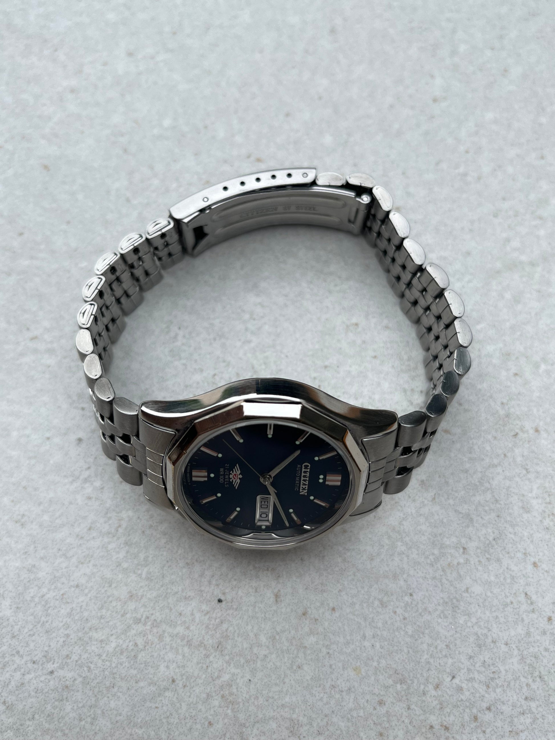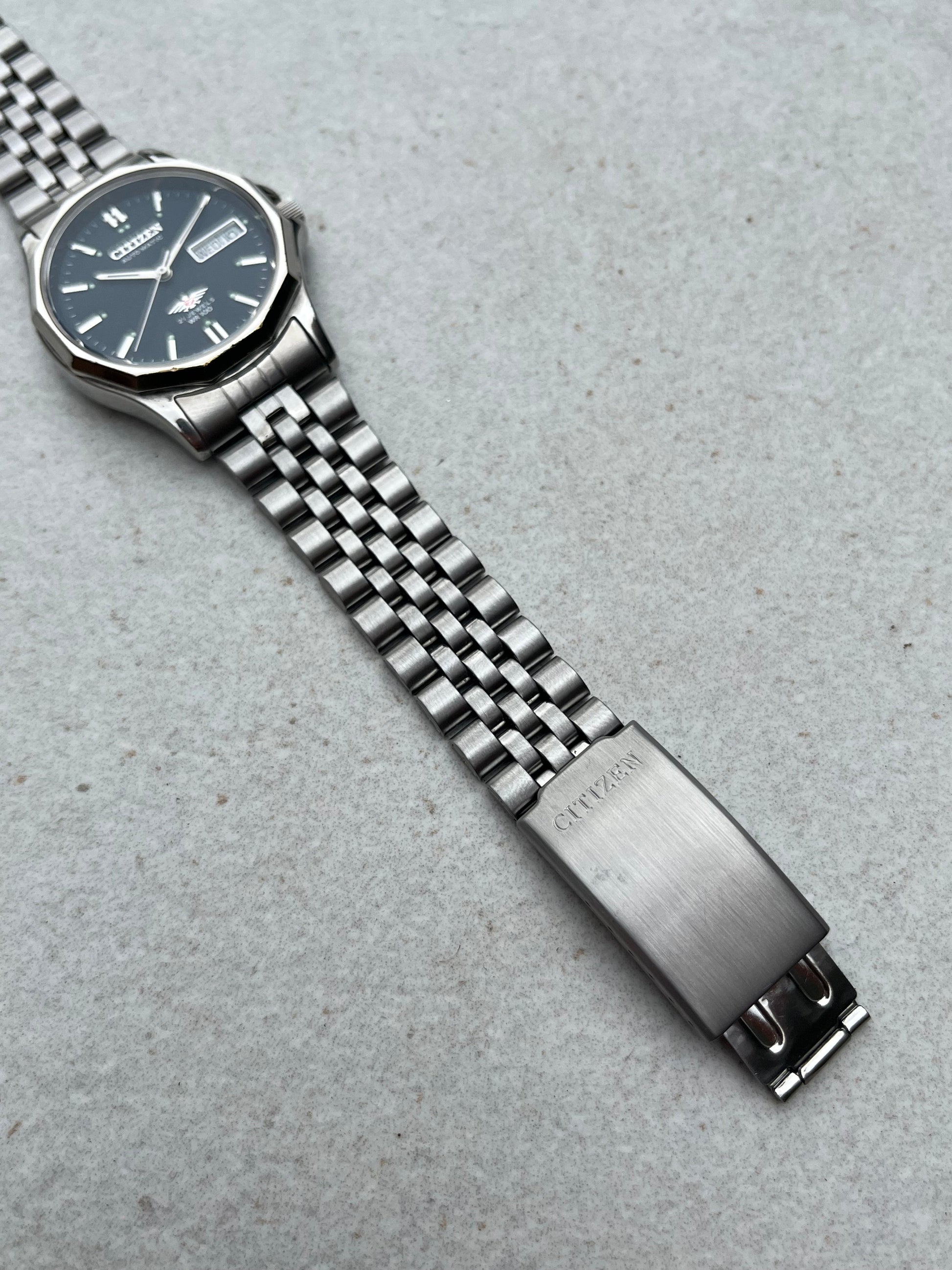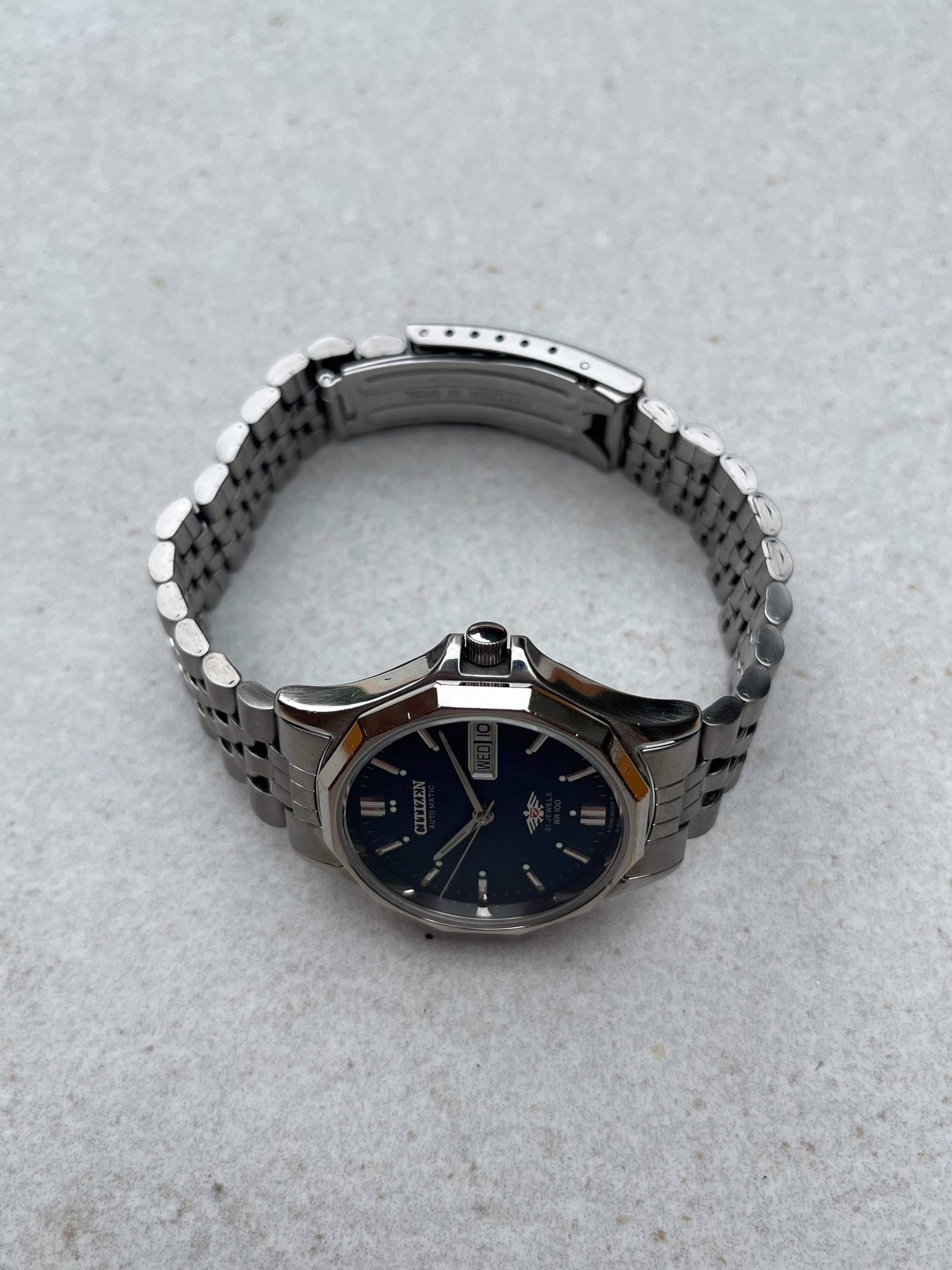 This Citizen is in great condition showing minimal signs of wear. This model features a blue dial and a fully functional English/Spanish day-date complication. The watch is fully functional and keeping time.