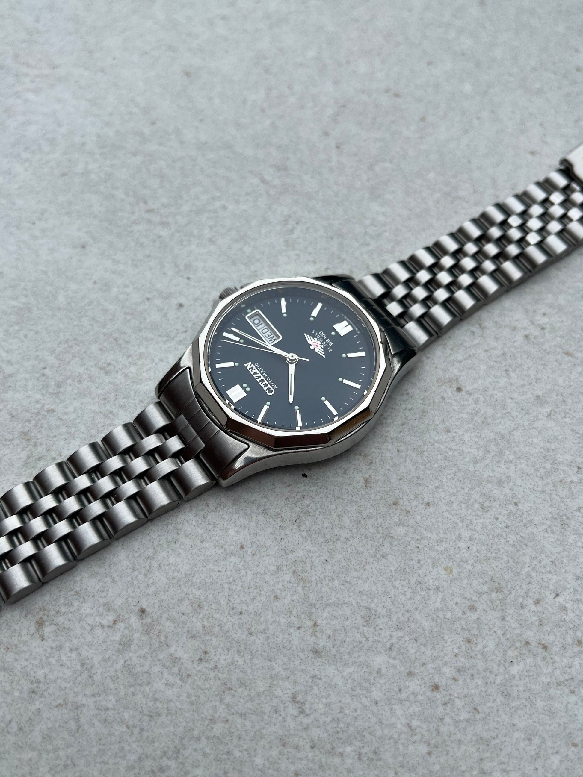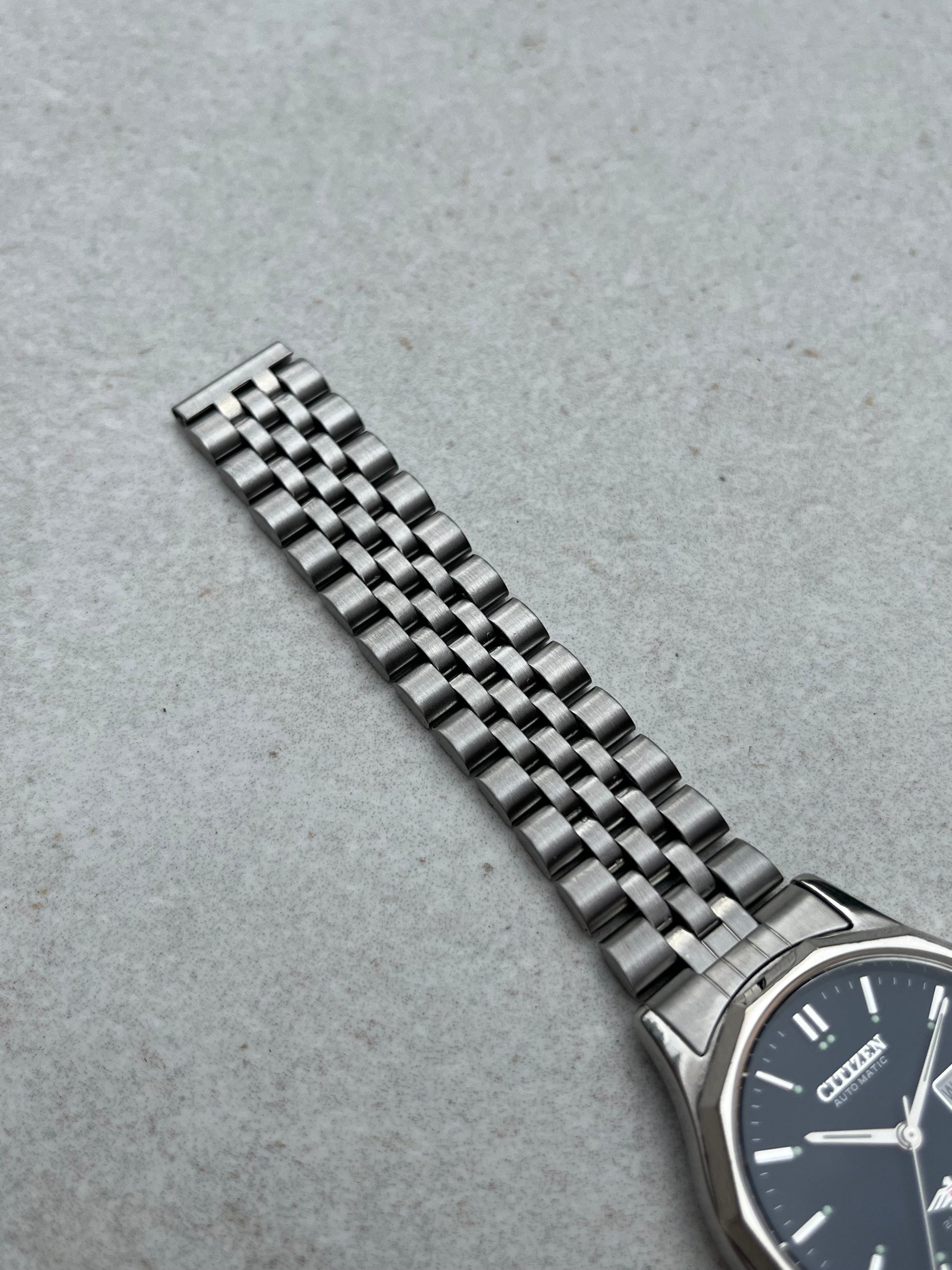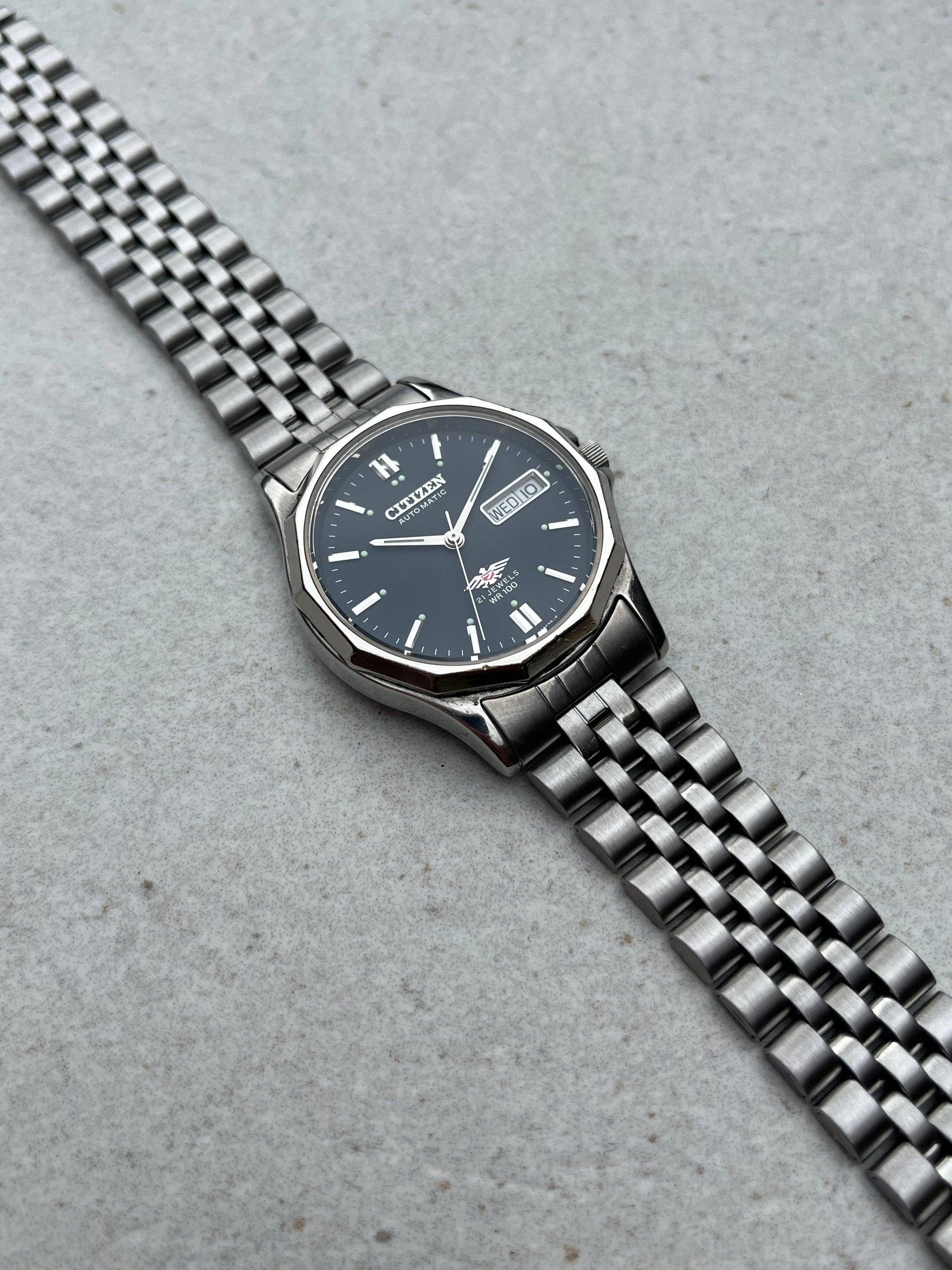 This Citizen is in great condition showing minimal signs of wear. This model features a blue dial and a fully functional English/Spanish day-date complication. The watch is fully functional and keeping time.