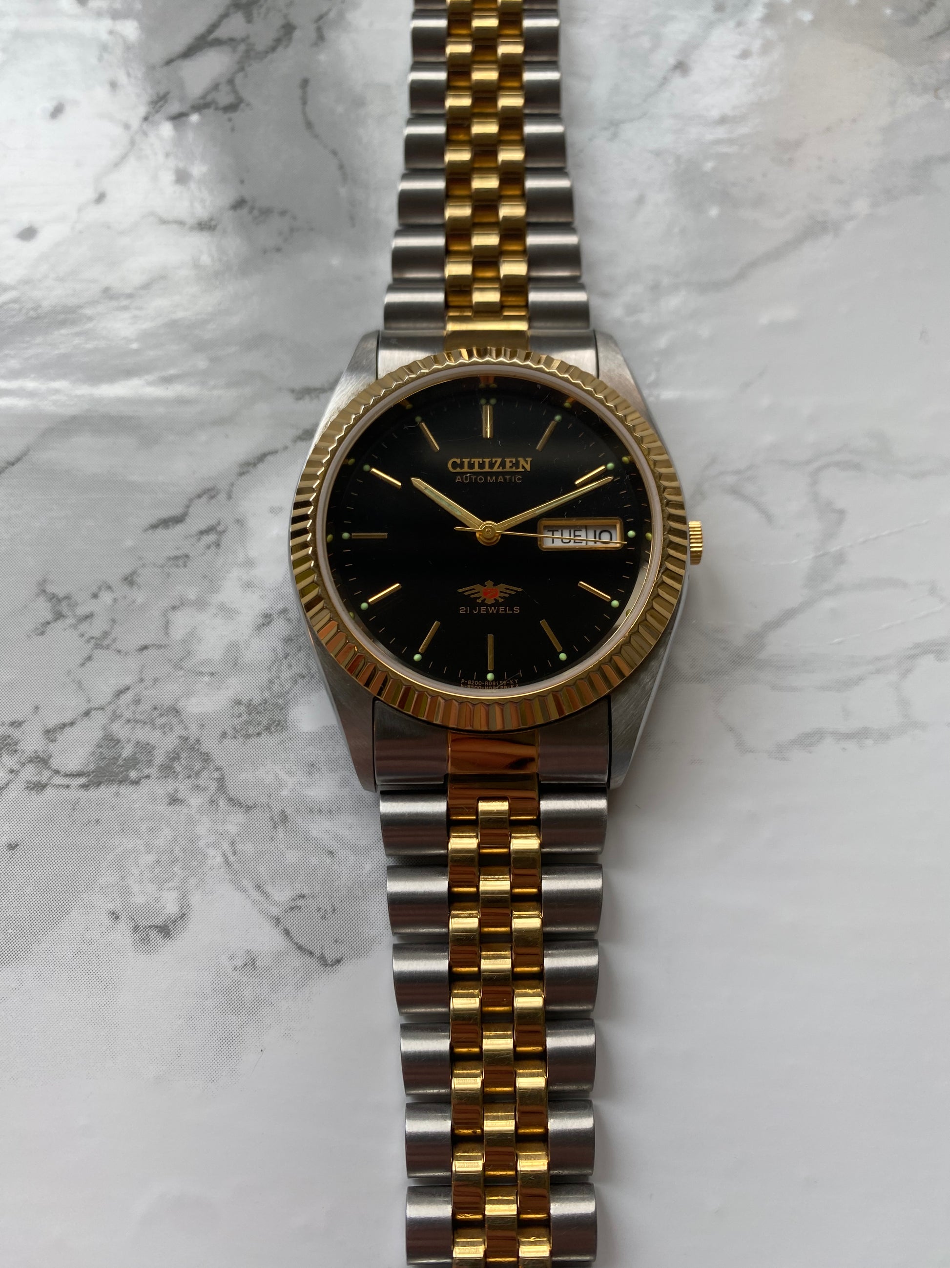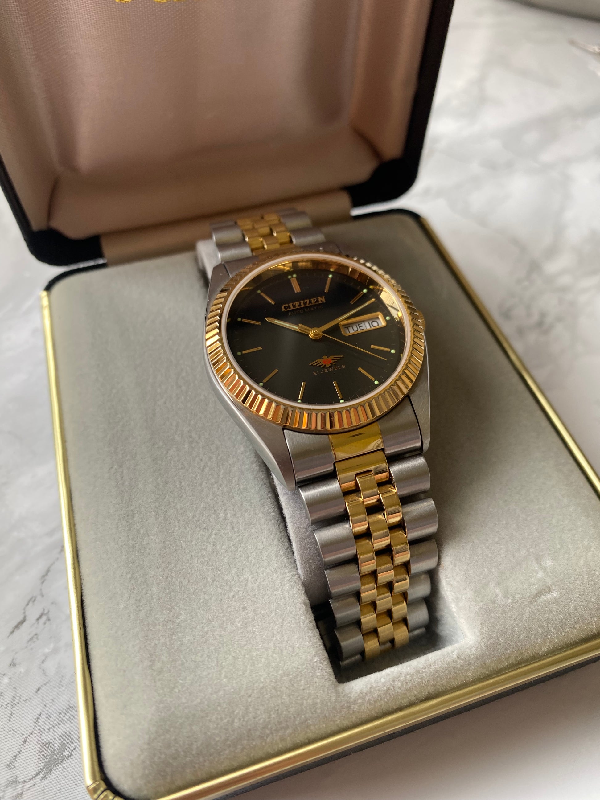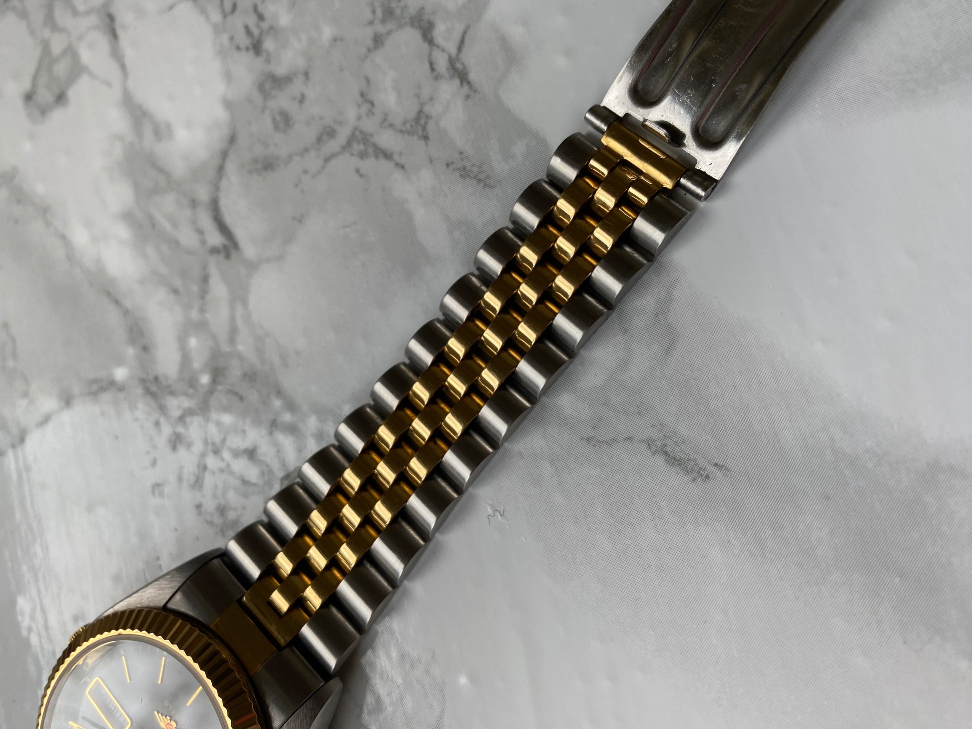This watch is in near mint condition. It features a stunning two tone jubilee bracelet. It’s black dial features a fully functional English/French day-date function. The watch is an excellent timekeeper. It is also supplied with box and papers!