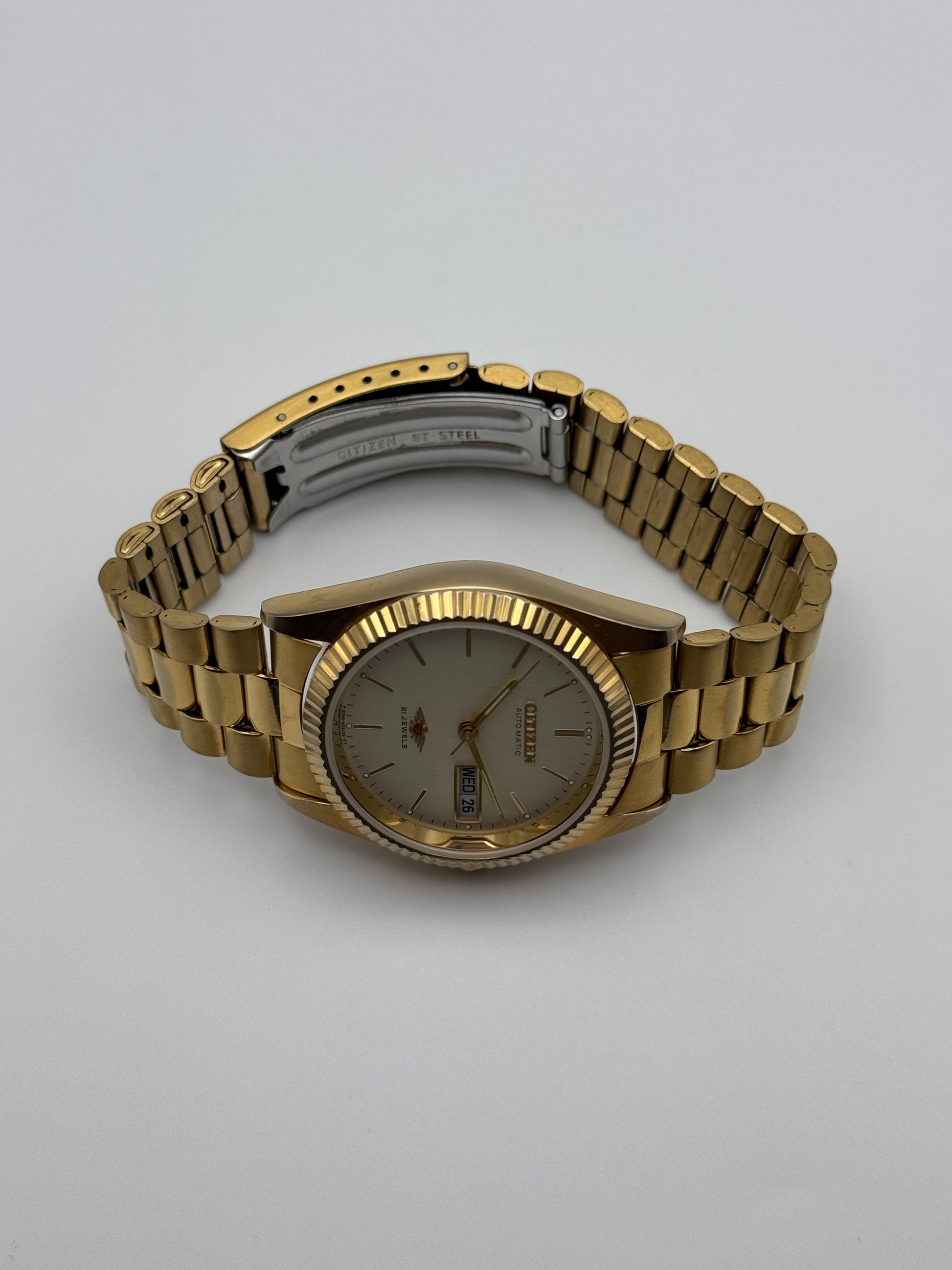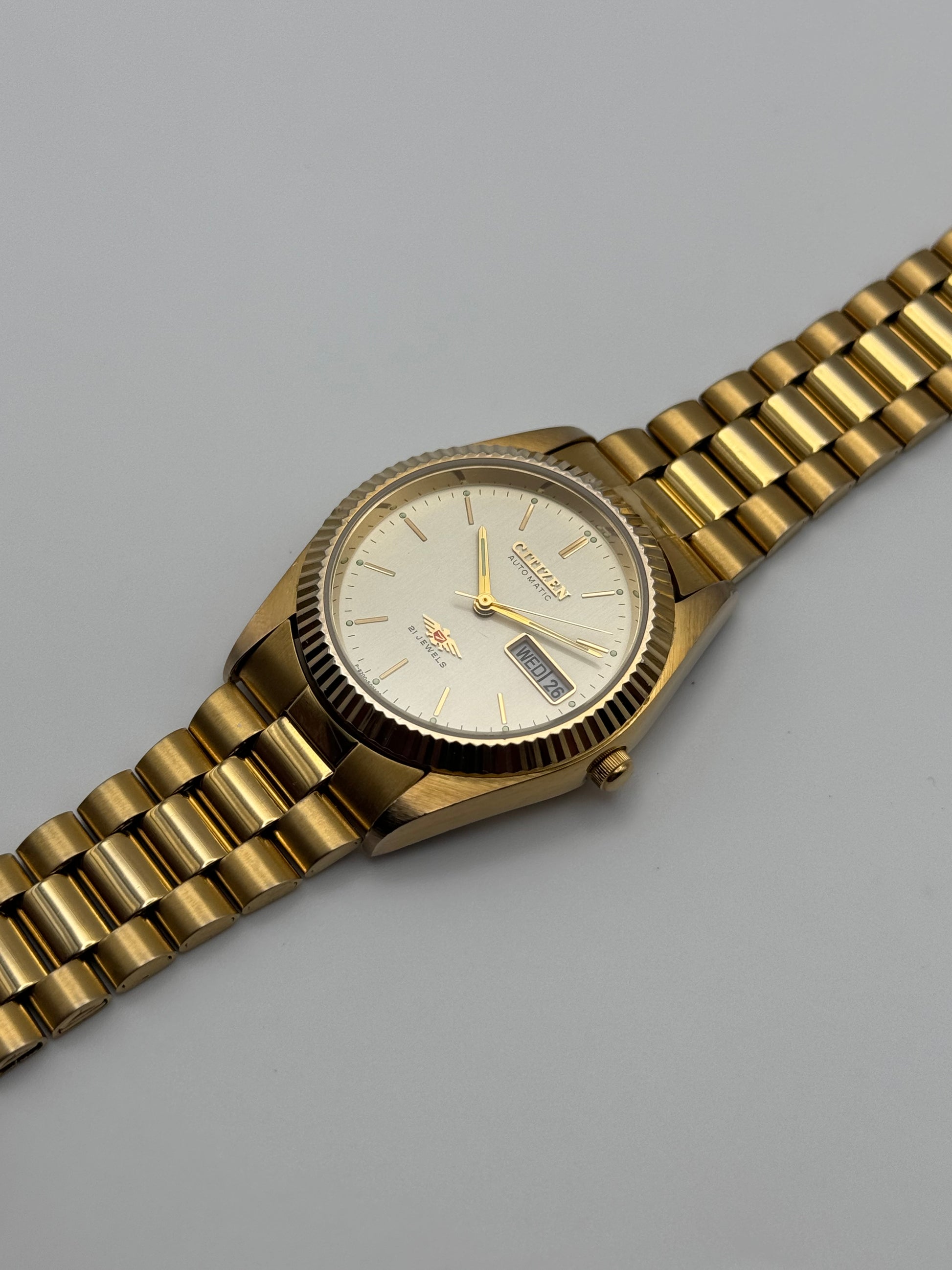 This stunning Citizen is in excellent condition. It features a stunning champagne dial which displays the striking Eagle 7 logo and a fully functional English/French day-date window. This is an excellent timekeeper.