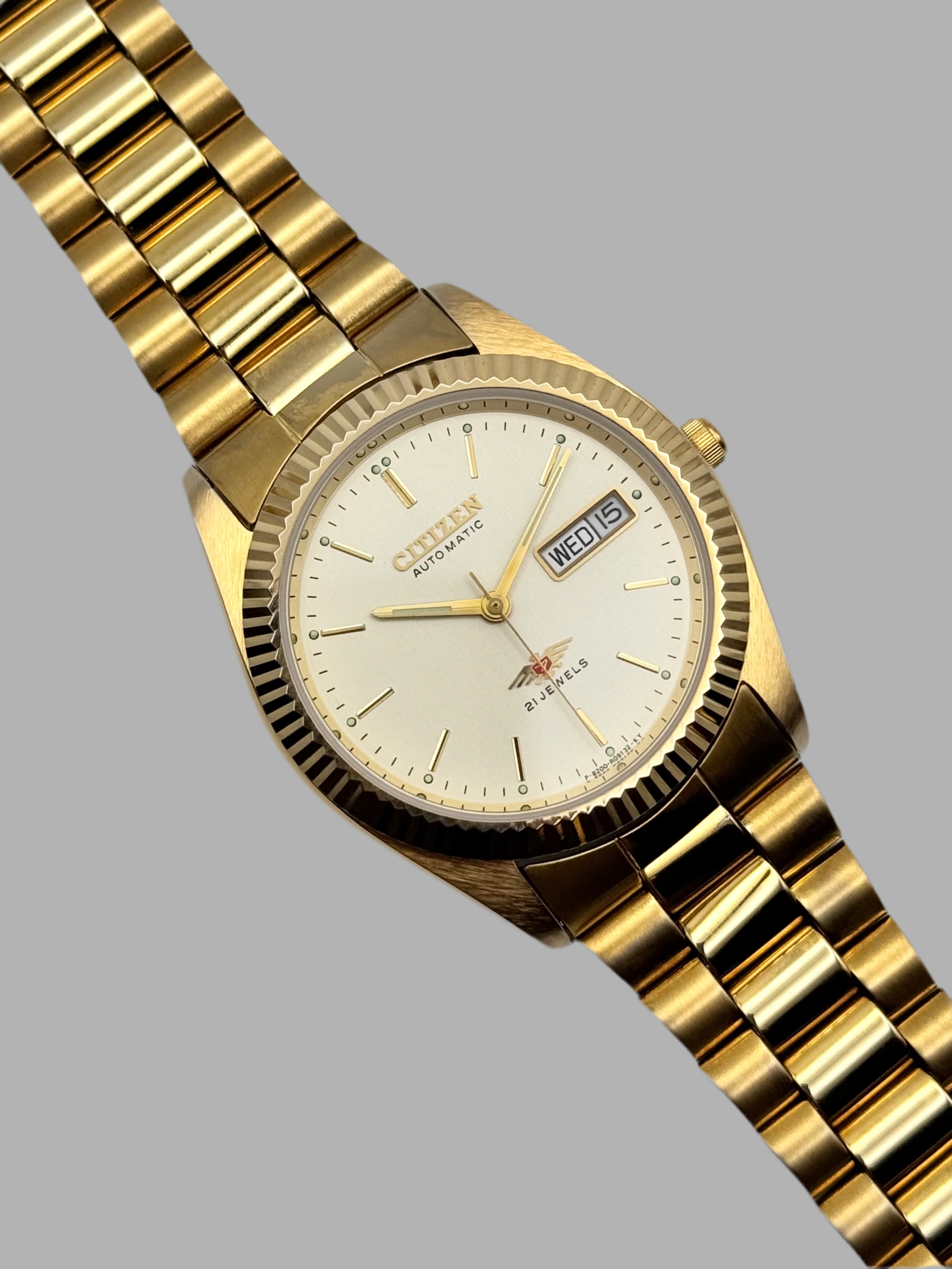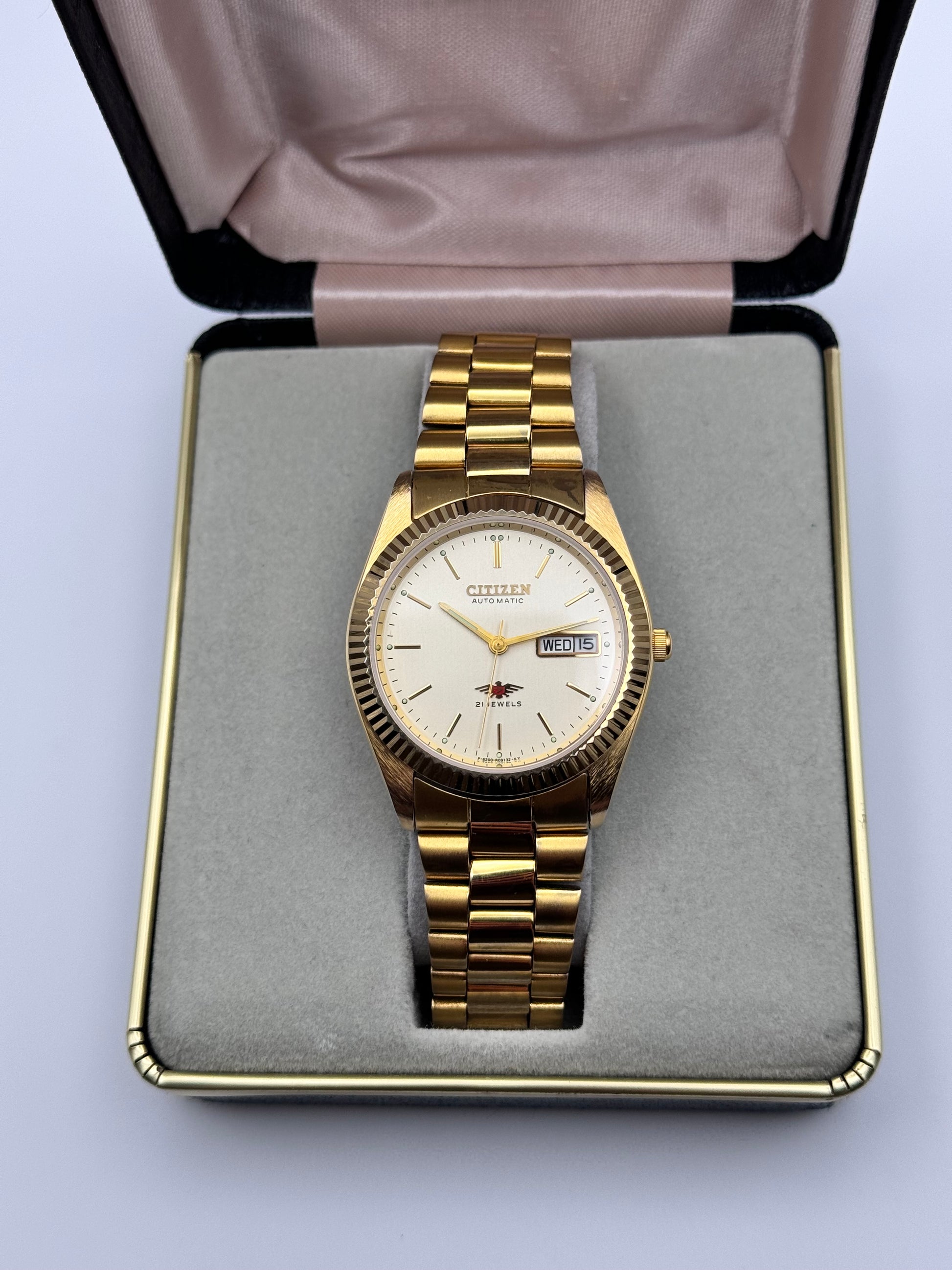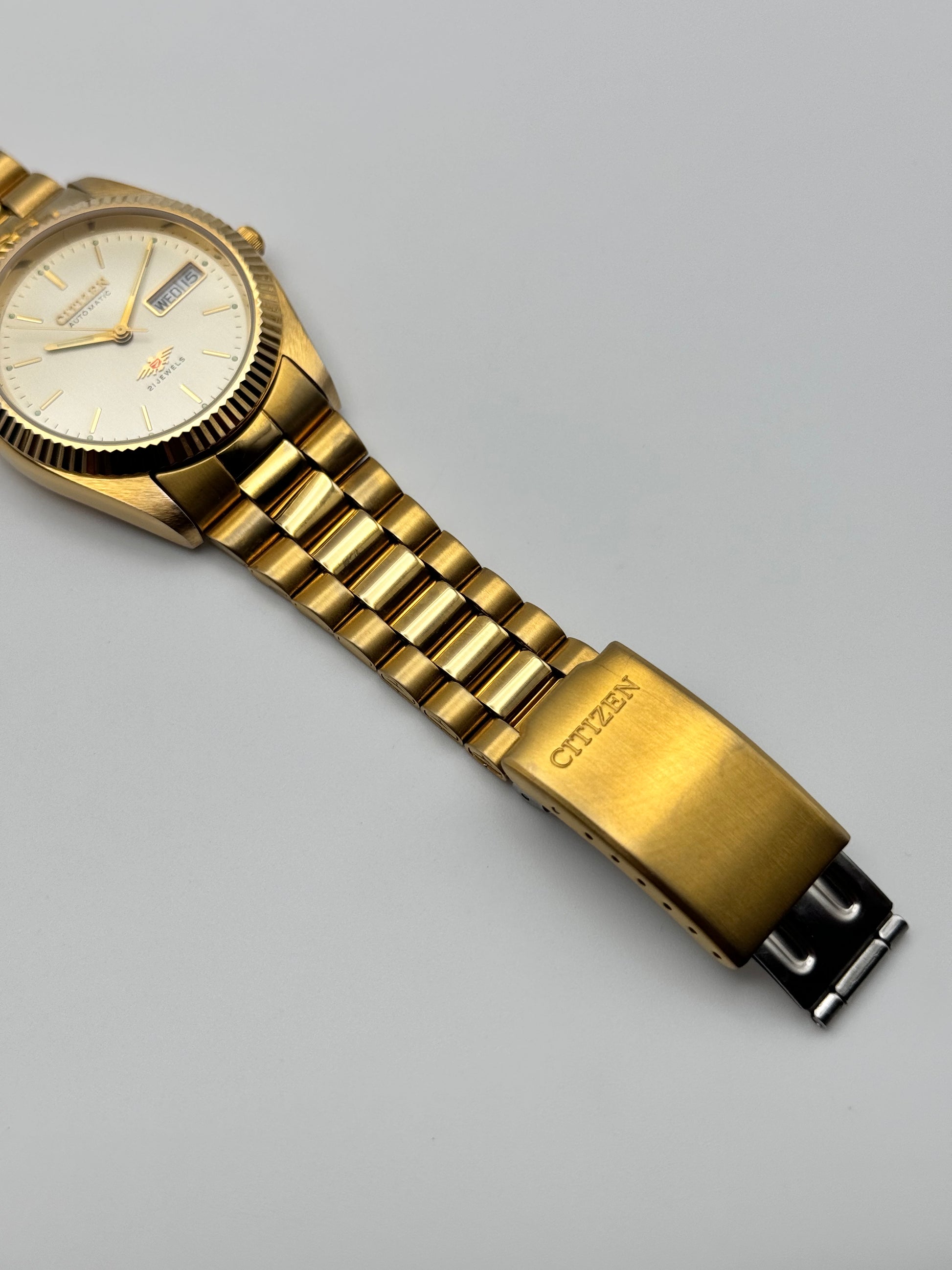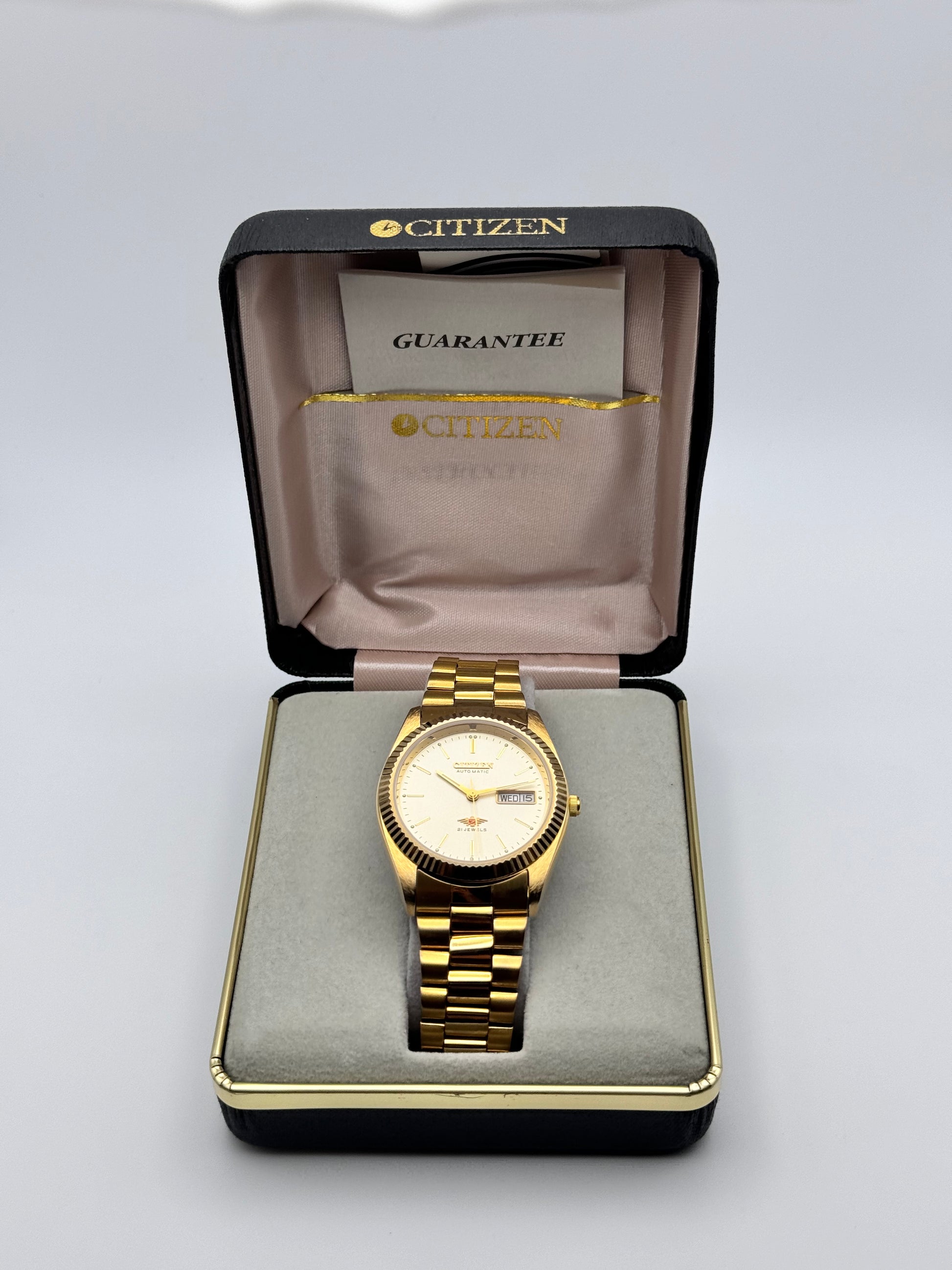 This stunning Citizen is in excellent condition. It features a stunning champagne dial which displays the striking Eagle 7 logo and a fully functional English/French day-date window. This is an excellent timekeeper. The watch is also presented with its original box and paperwork.