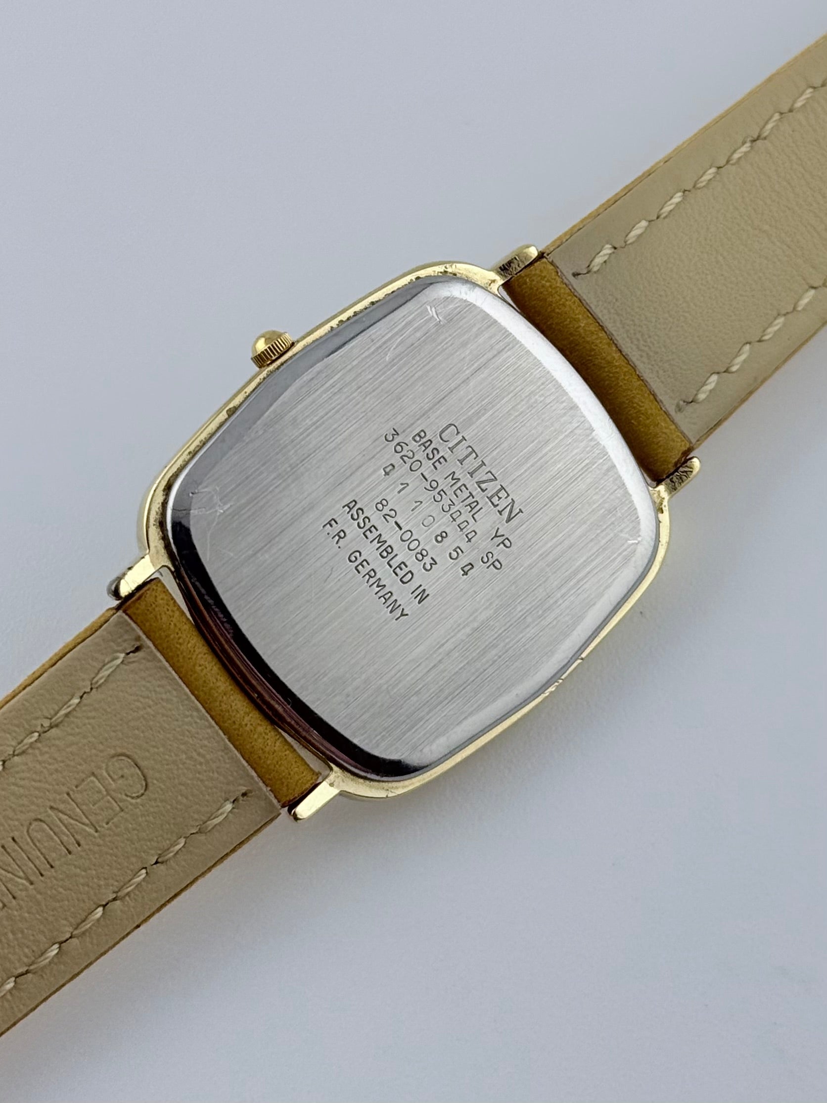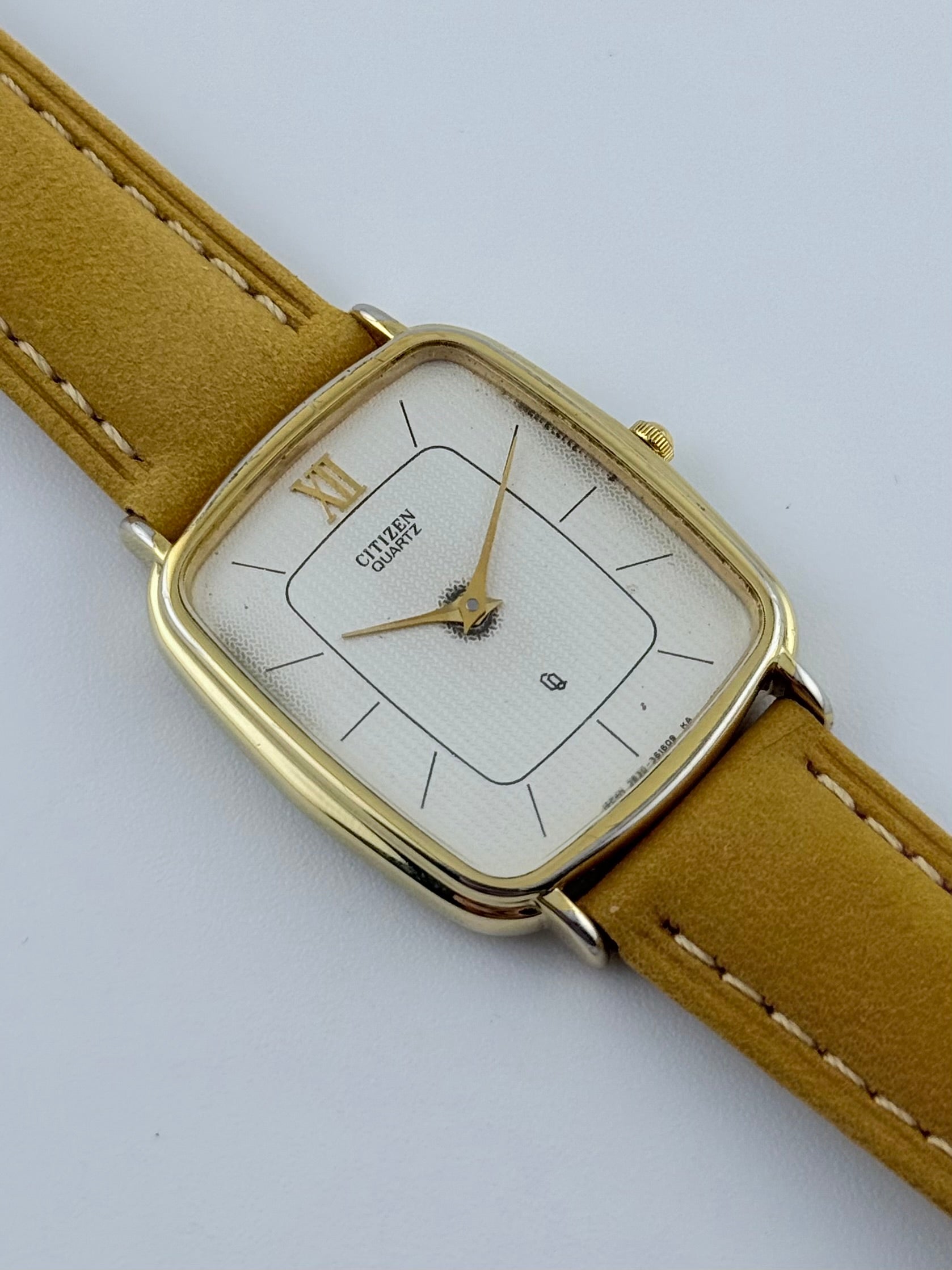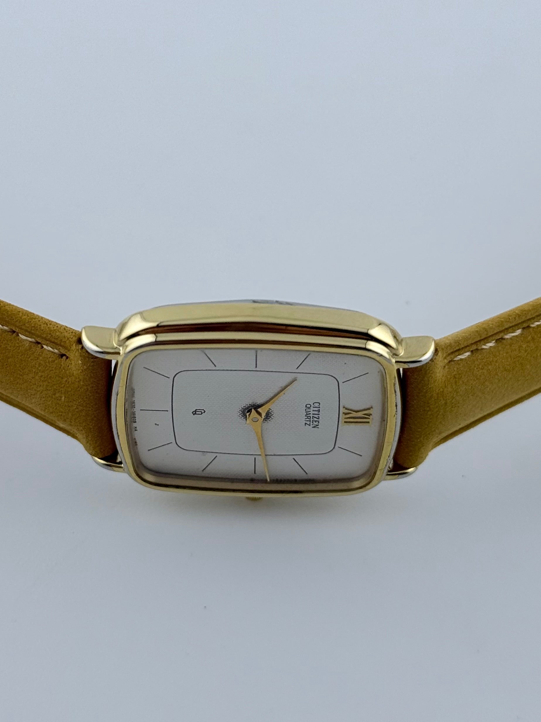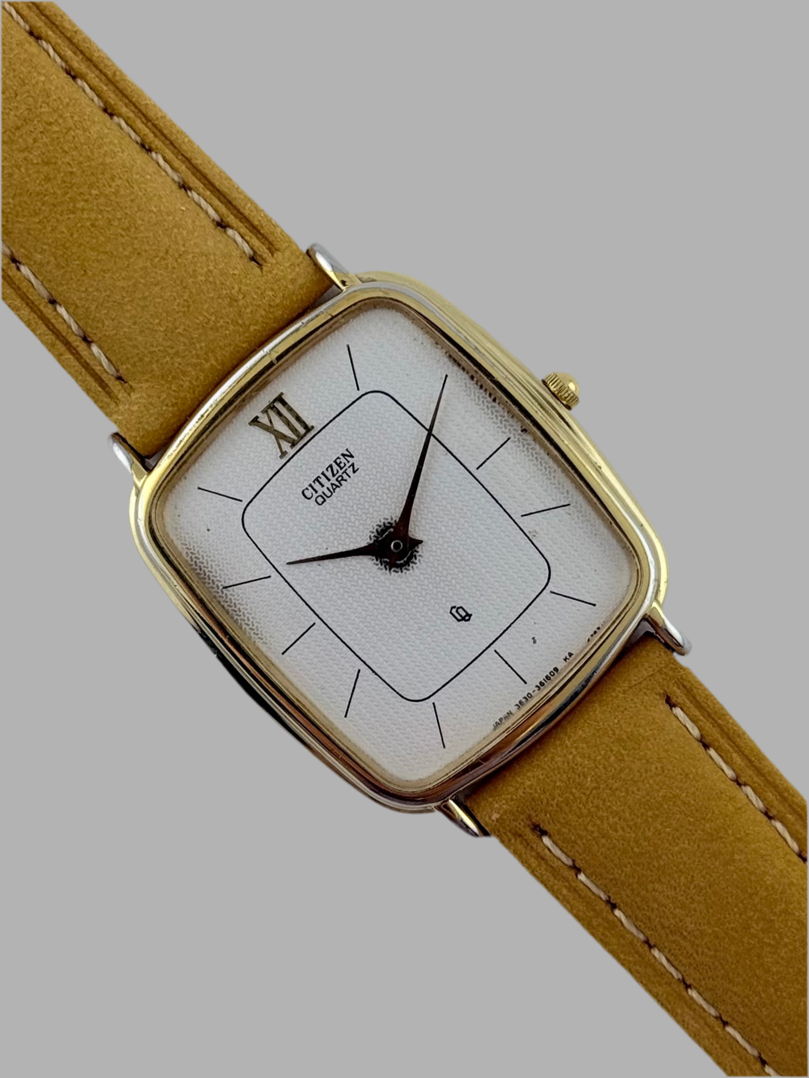This Citizen is in lovely vintage condition showing some signs of wear. The watch features a lovely off white patterned dial with black baton markers. This piece is in full working order and keeping time. The dial at the edge has some discolouration between the 9 and 11 baton markets and also at the centre of the dial. The watch also comes with its original presentation box. We have also fitted a brand new luxurious leather strap.
