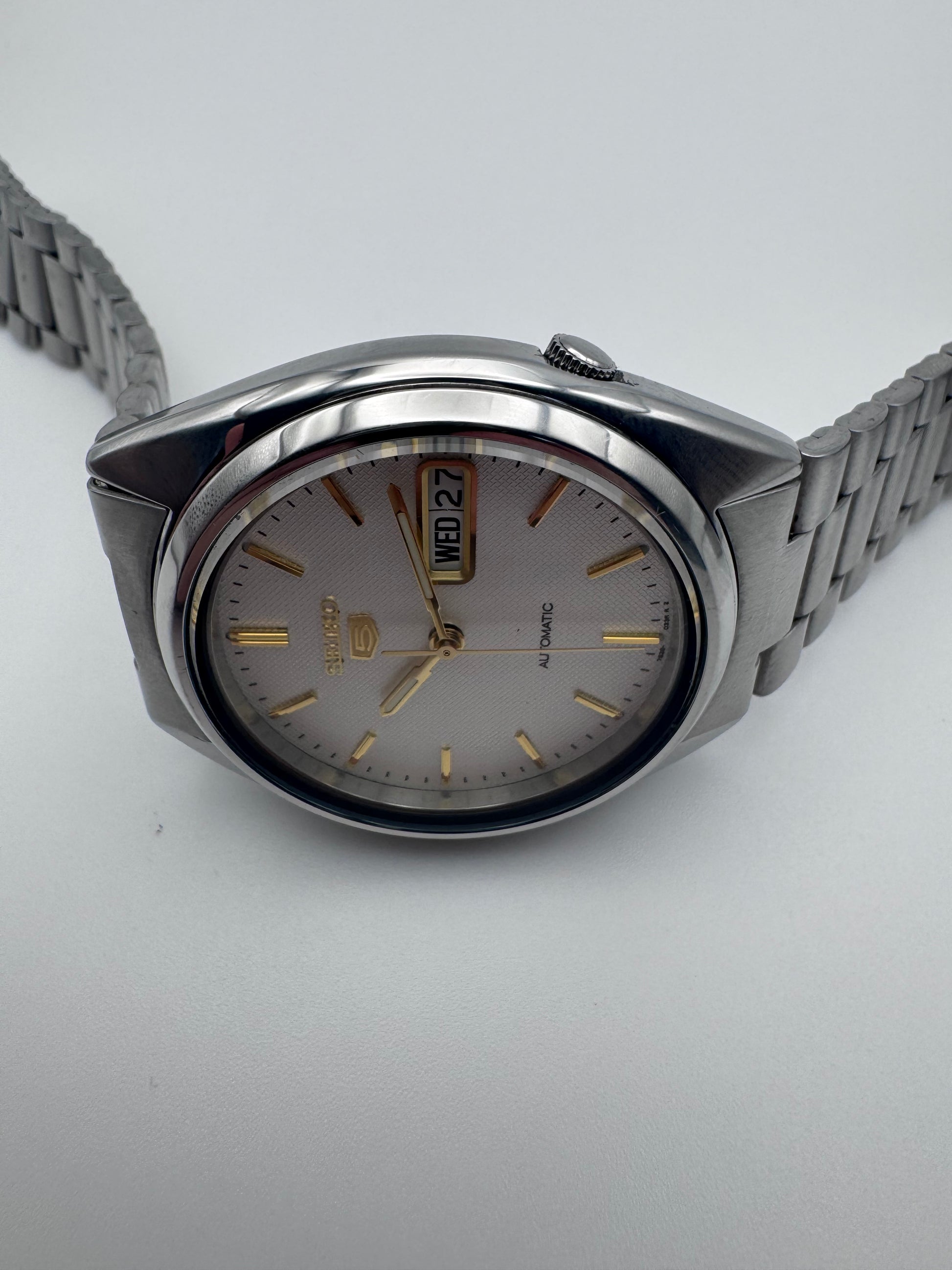 This is a stunning Seiko 5 Day-Date which features a fantastic, patterned dial with an English/French day-date complication and a clear crystal on the back case, clearly displaying its movement. This piece is in extremely good condition showing only very little signs of wear. It is in full working order and keeping time and comes with its own original Seiko bracelet.