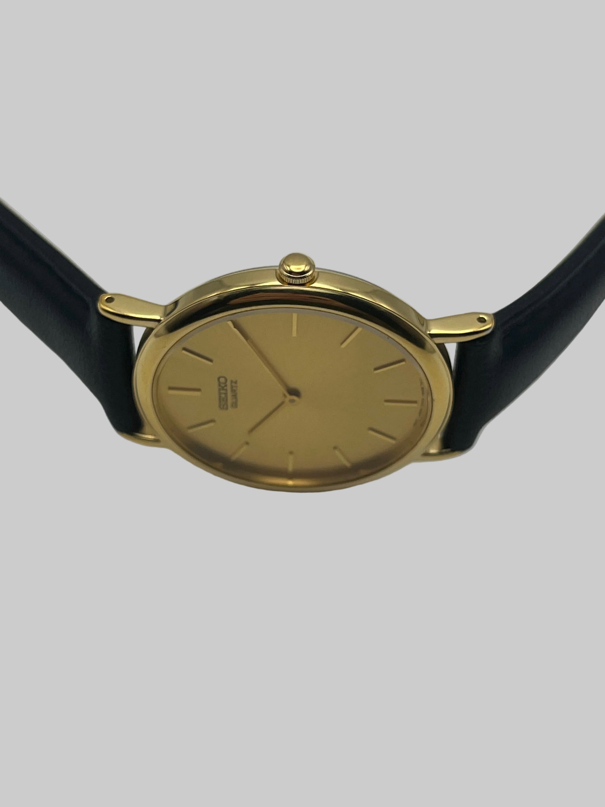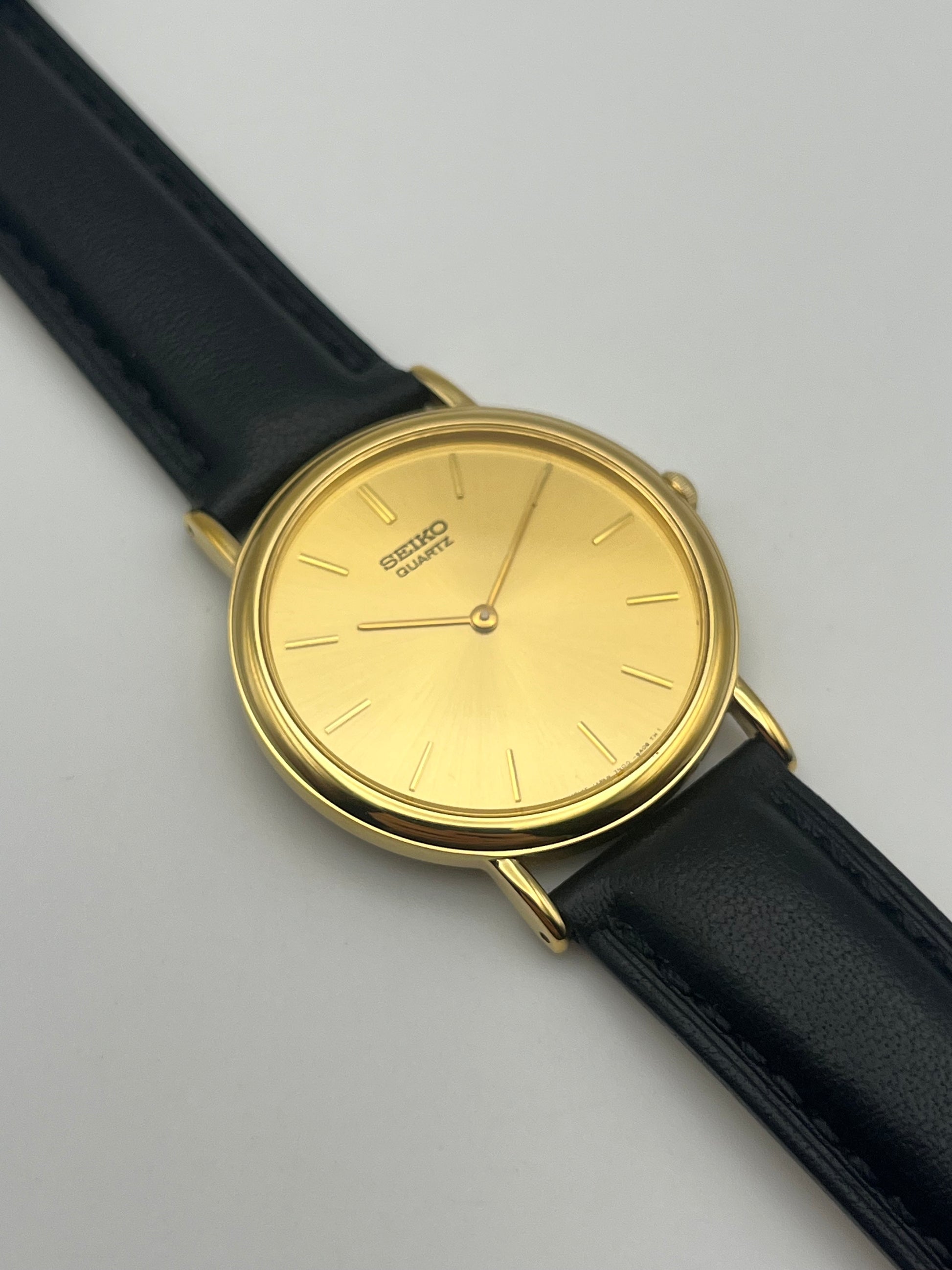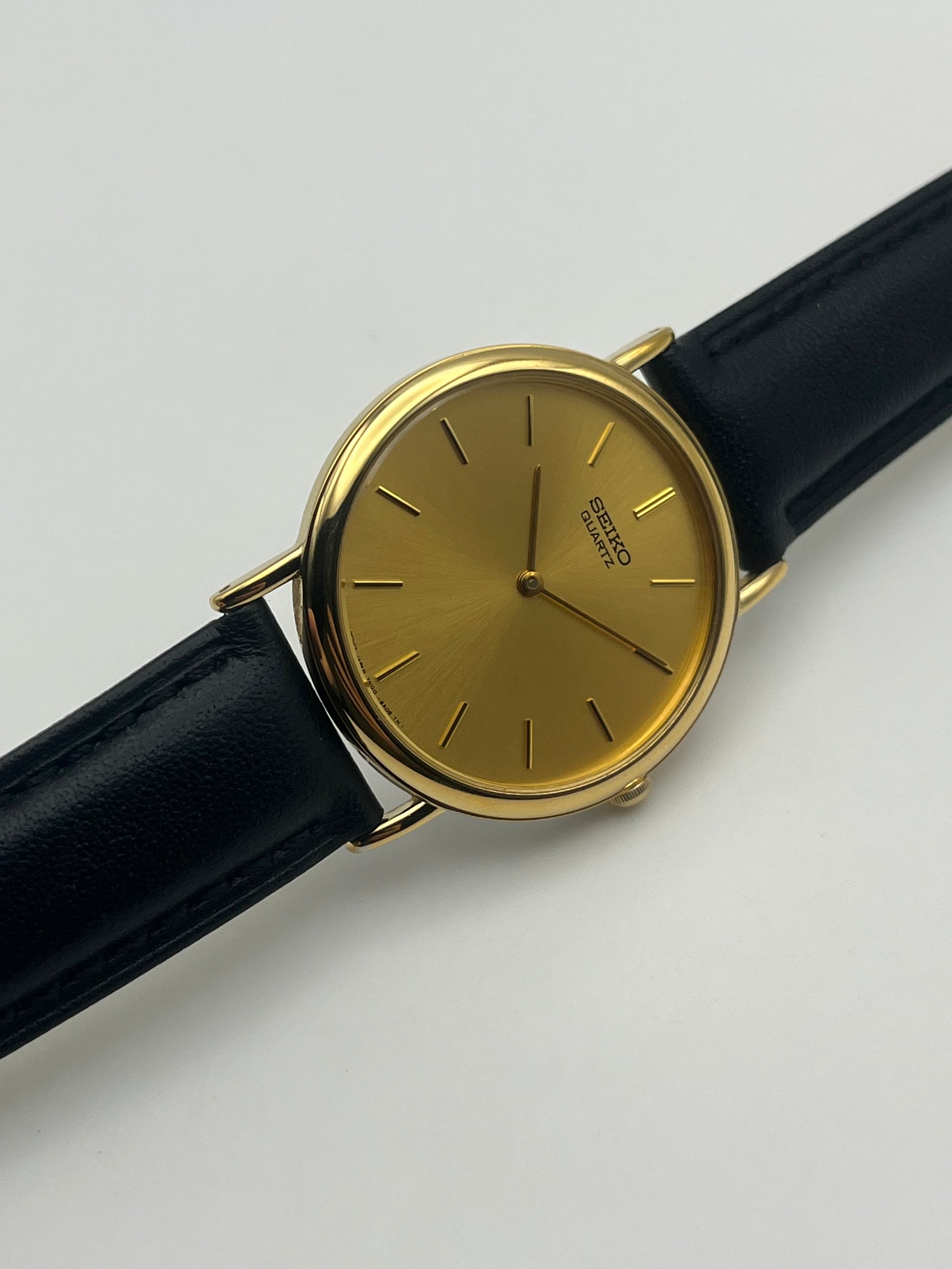 This is a lovely and simple vintage dress watch from Seiko. This piece is very thin and fits well with a suit. It features a gold dial. The watch is fully functional and keeping time.