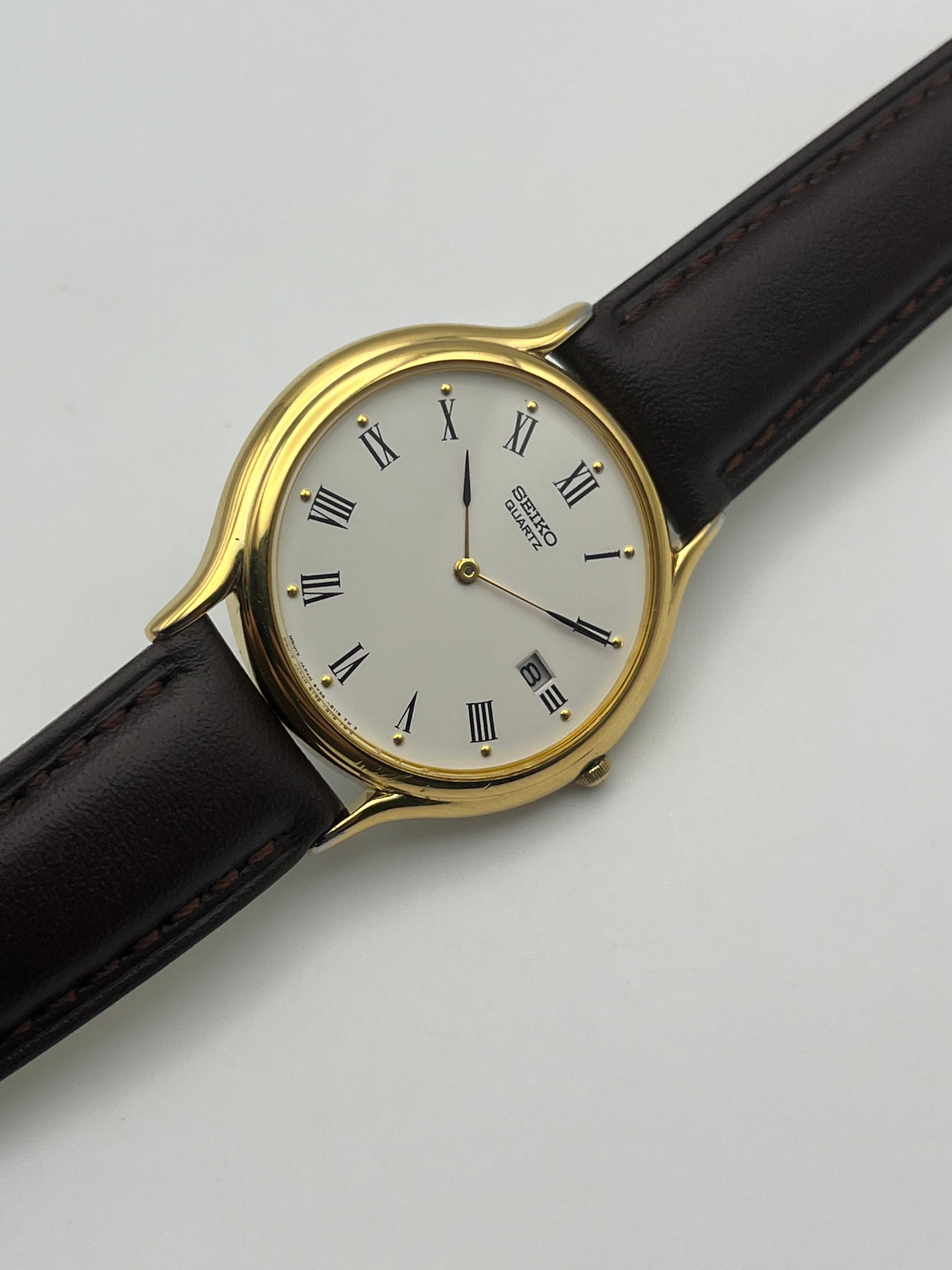 This vintage Seiko is in excellent condition. This piece features a white dial which displays Roman Numeral markers and a date window at 3 o clock. This example is in full working order and keeping time.