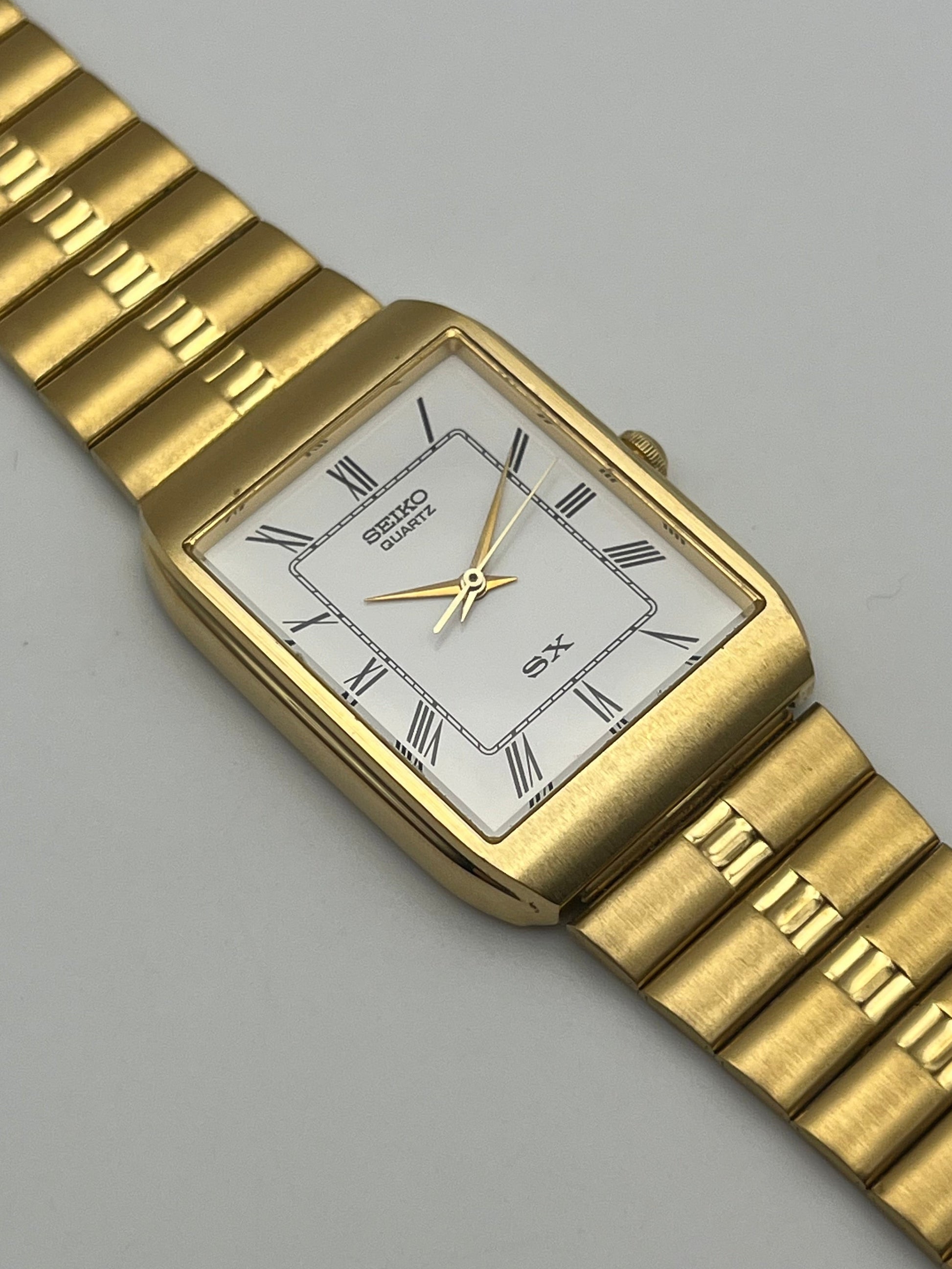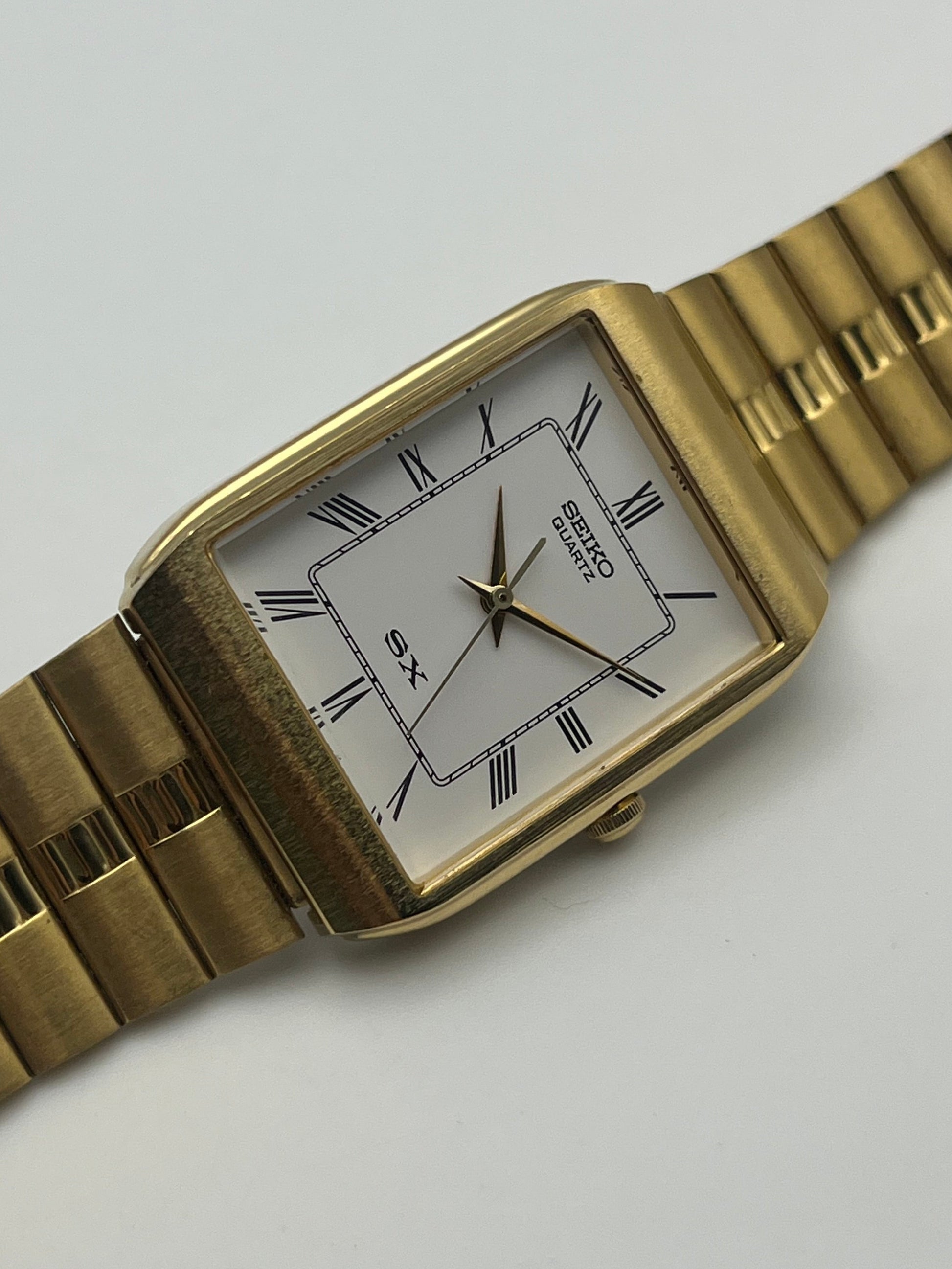This is a lovely little Seiko Tank which comes on its original bracelet. The watch features a lovely white dial which Roman Numeral markers. This is an ideal watch for formal dress or casual wear! This piece is fully functional and keeping good time.