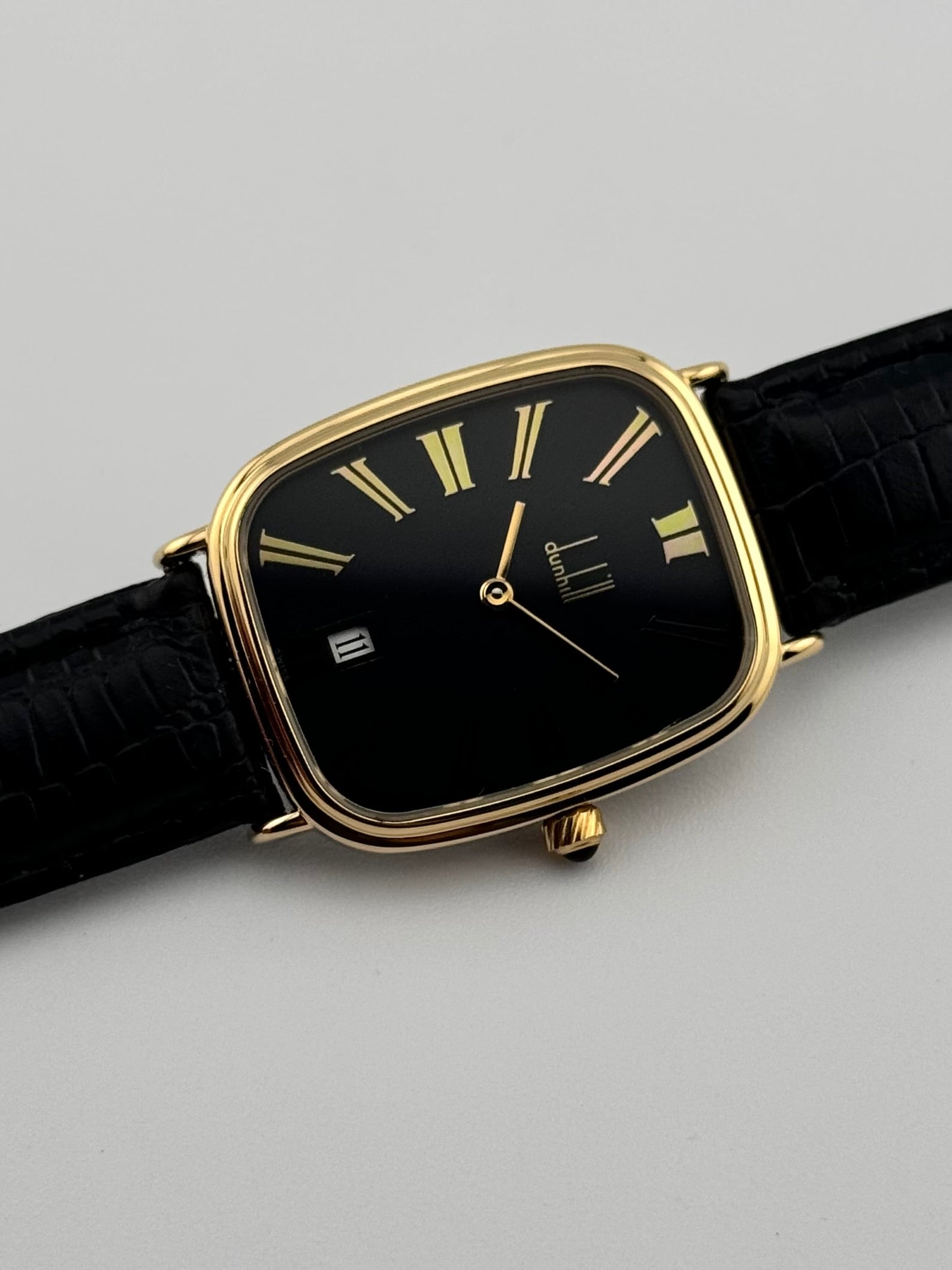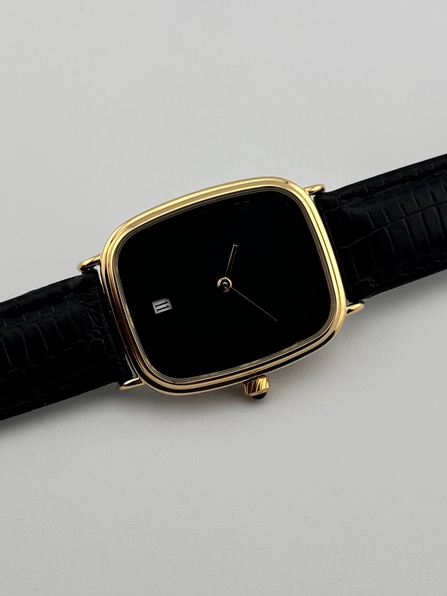 This is a stunning vintage Dunhill Quartz dress piece which emits class with its slim profile and black blackout dial. This piece provides a fantastic opportunity to pick up a luxury Swiss watch from a well renowned brand for very little money!