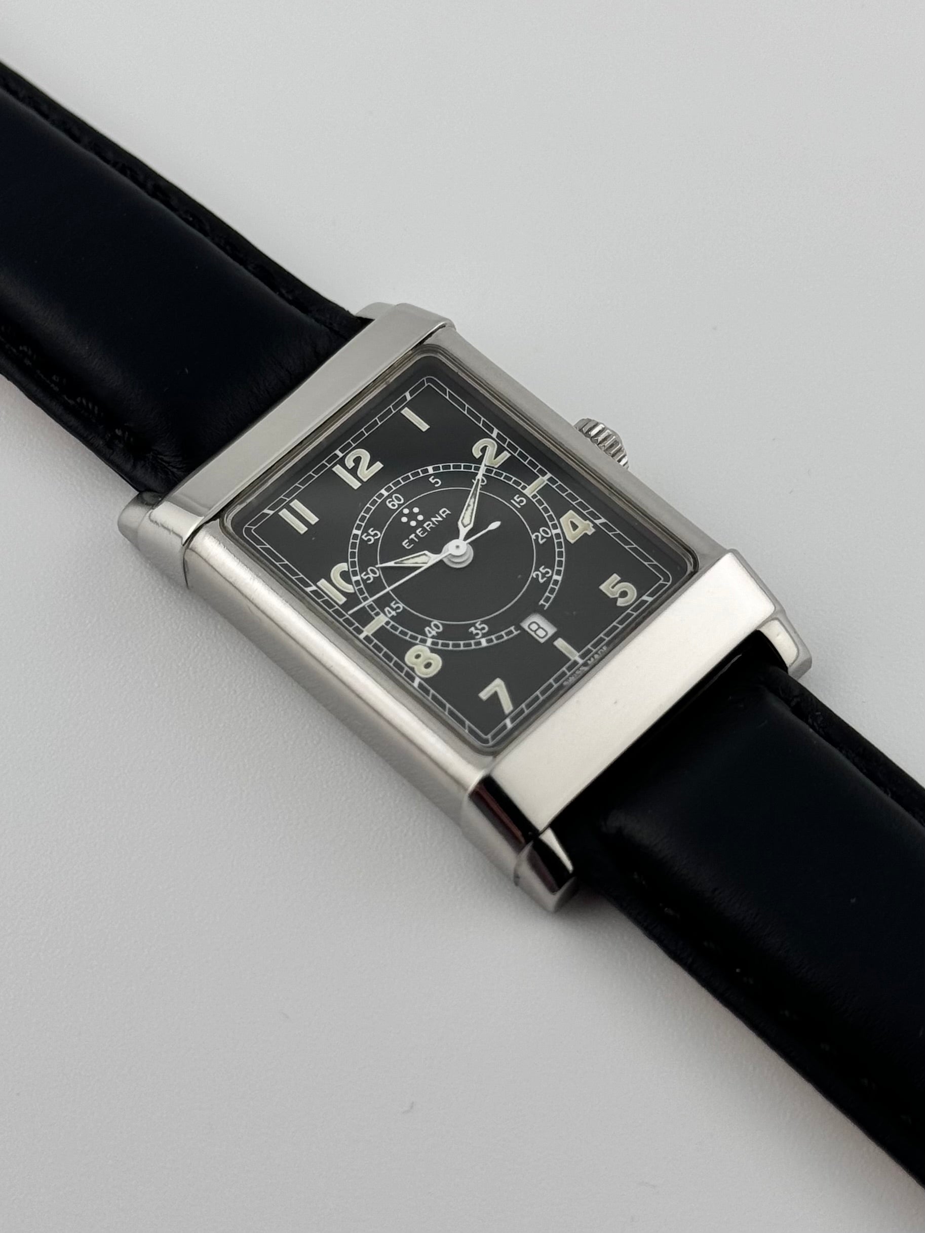 This is a very cool reissue Eterna Automatic in fantastic condition. The black dial is in great condition showing some signs of age. It has many features including a date window at 6 o'clock, tritium-coated Arabic dials and hands all sitting behind a sapphire crystal which is in near mint condition. The polished stainless steel case is also in excellent condition, with the back case showing only light scratches. The crown is fully functional, original and Eterna signed. The watch is working perfectly in all its functions and is keeping excellent time.