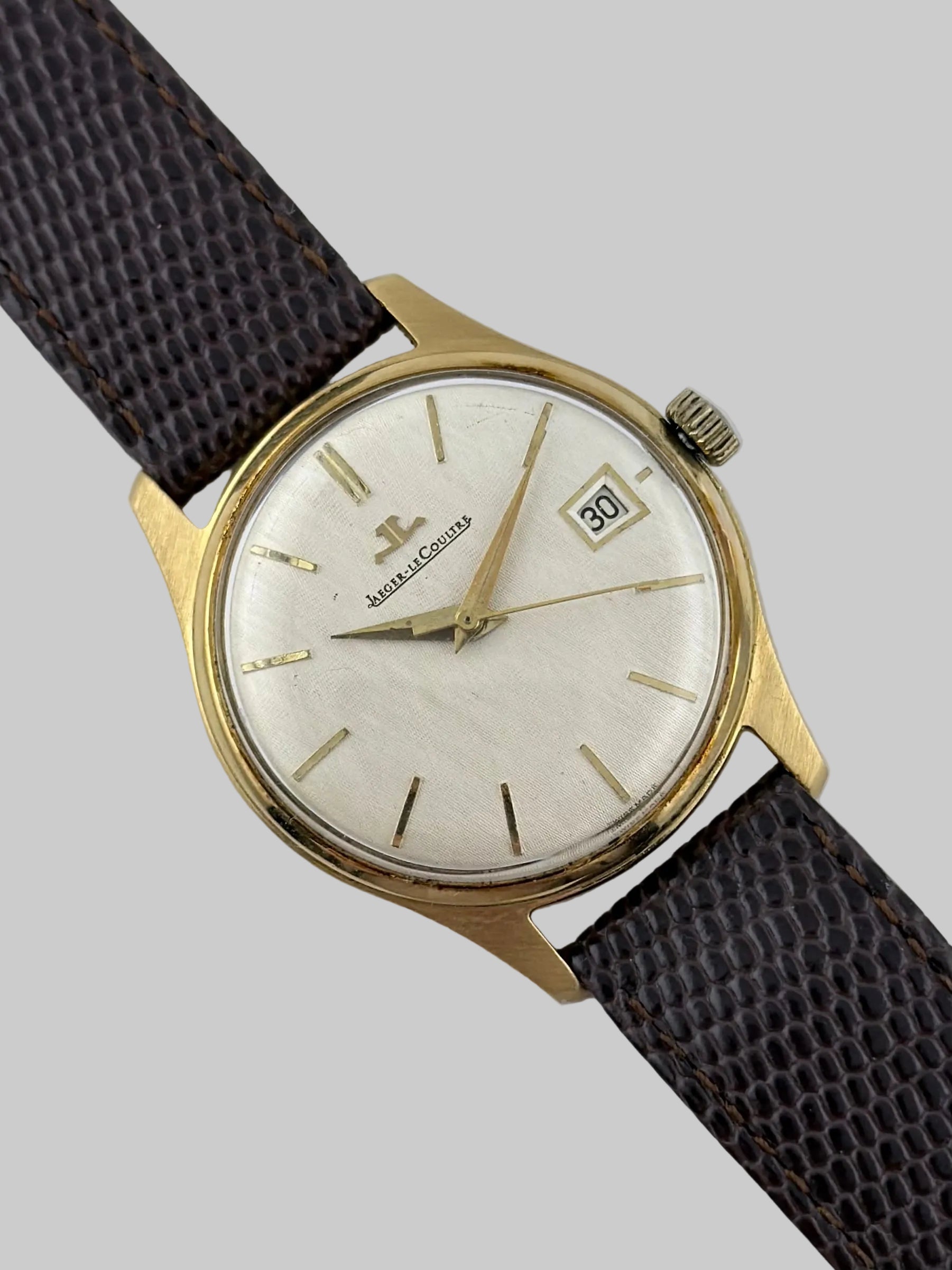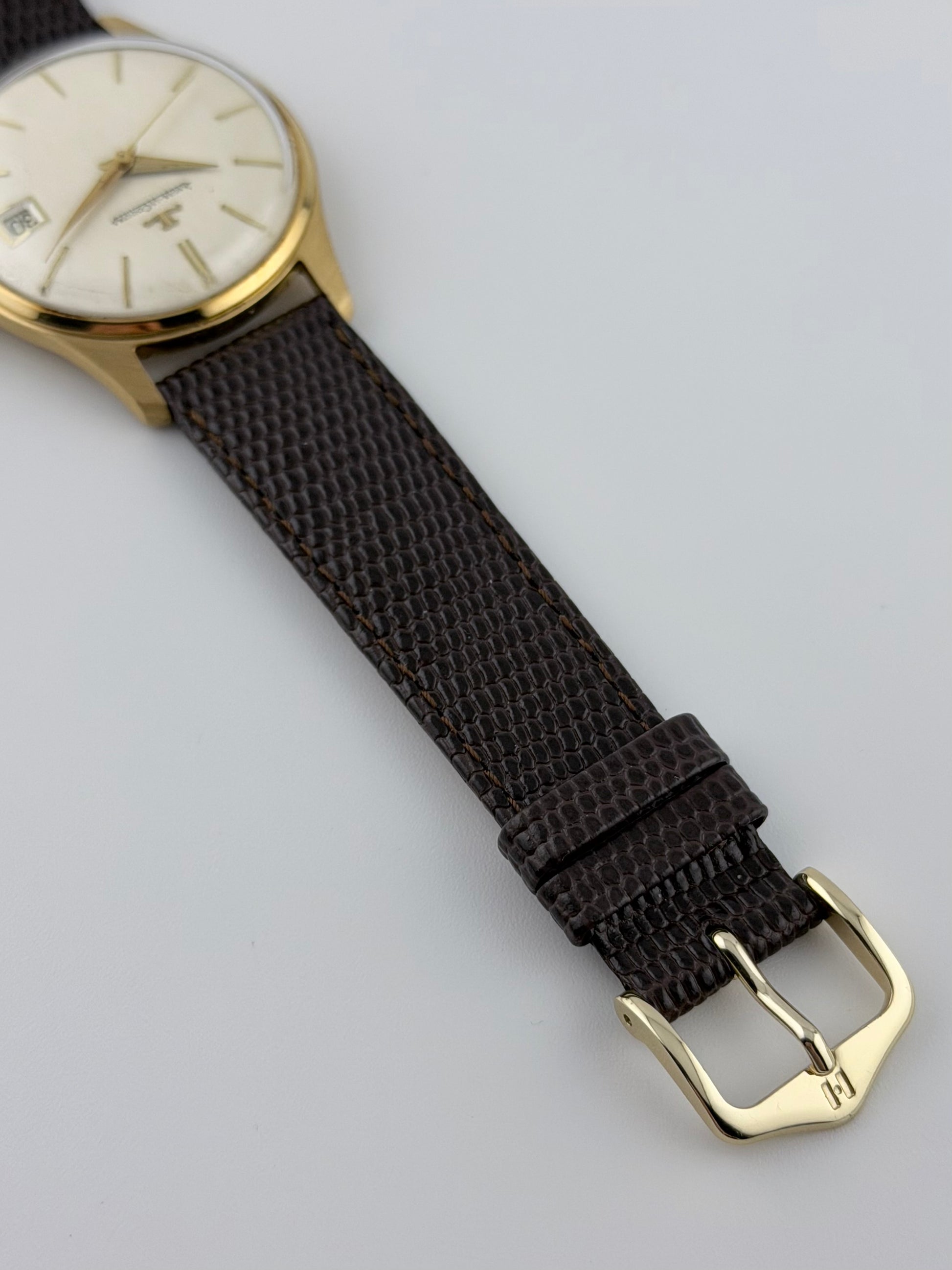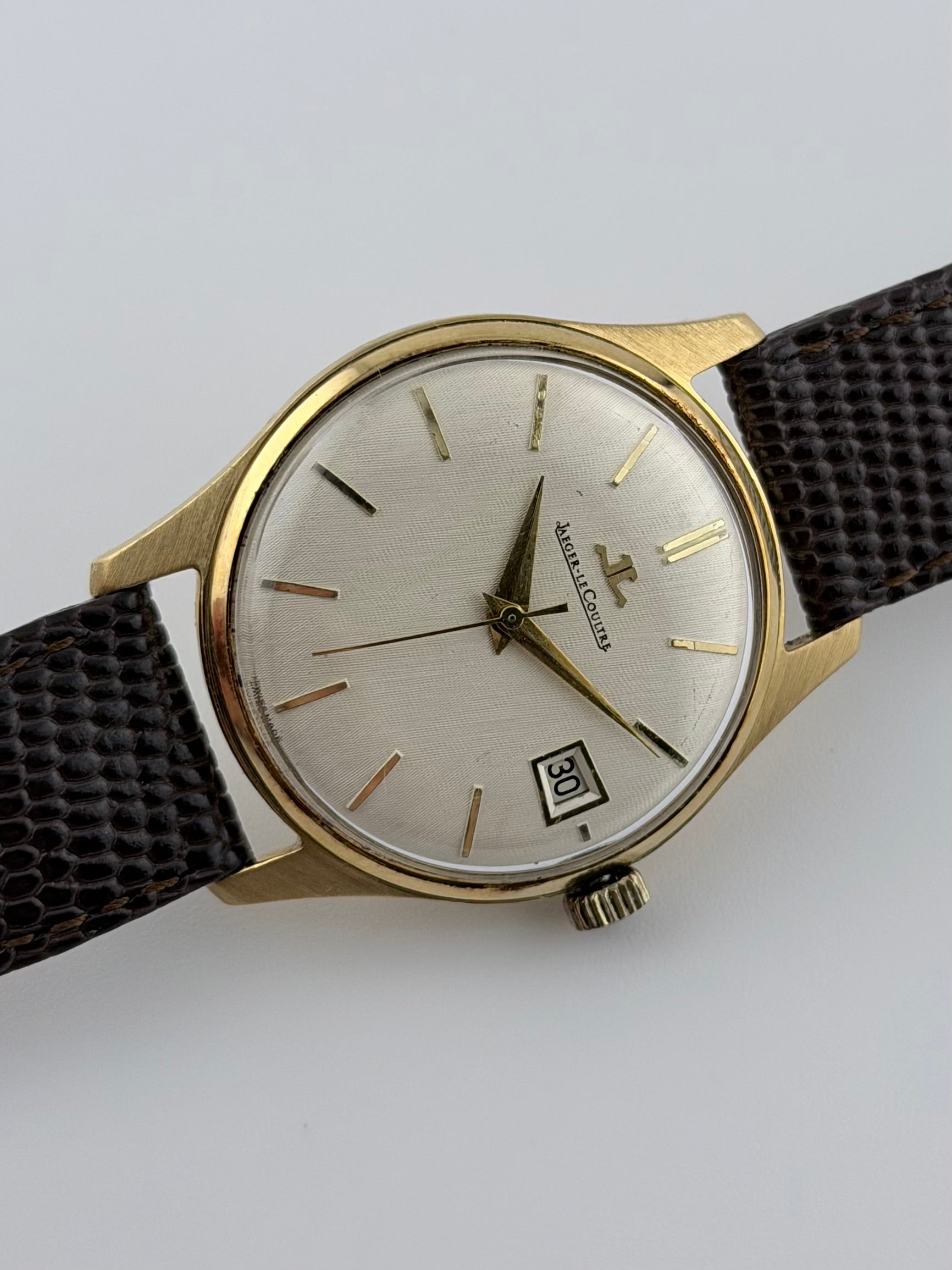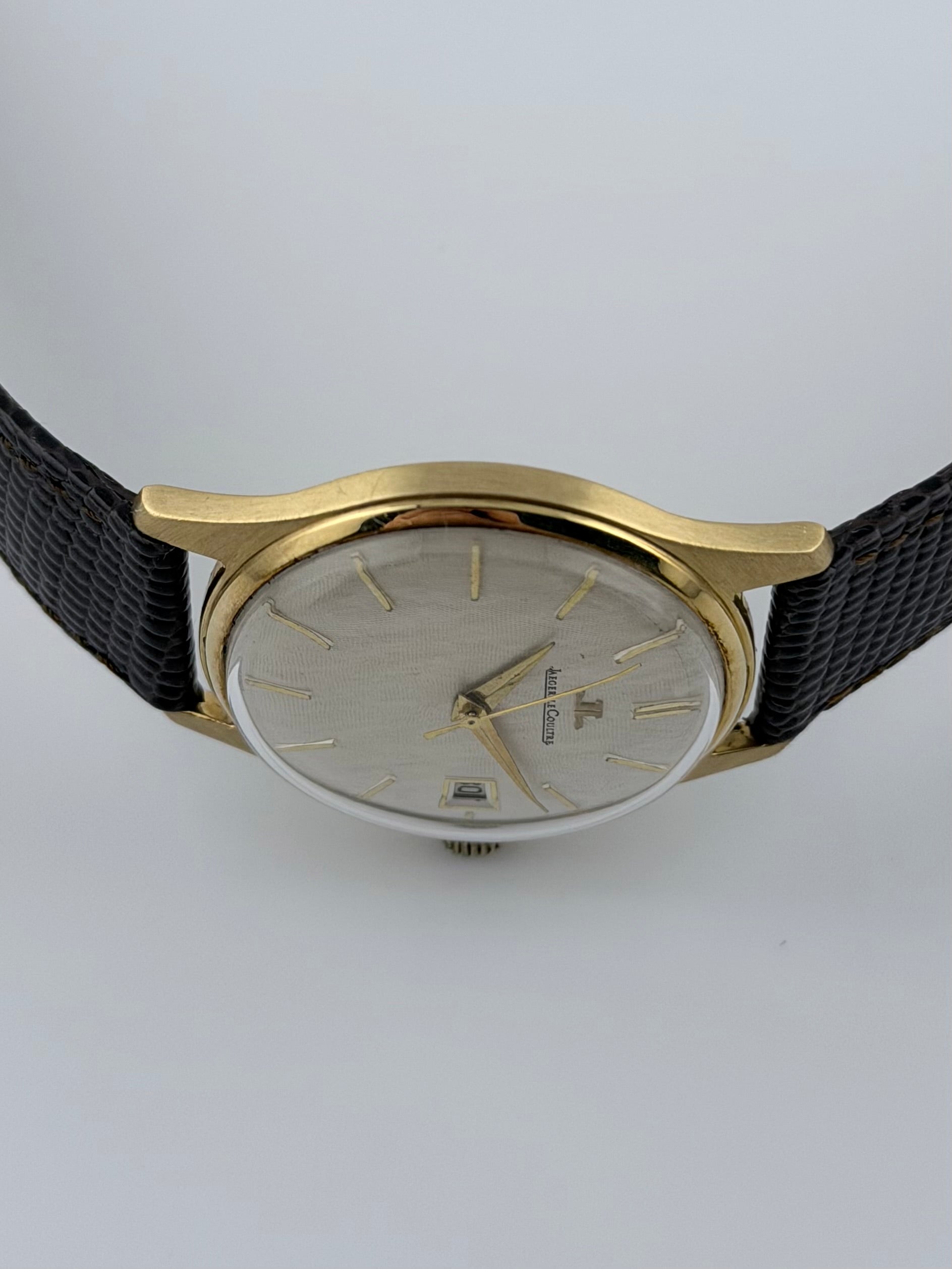 We have for sale this exceptionally beautiful vintage 1960s JLC Automatic wristwatch in solid 18ct gold, which is in lovely vintage condition. This classy timepiece features a timeless design, featuring a beautiful linen dial. The watch is running perfectly, keeping excellent time within specification after a full service.