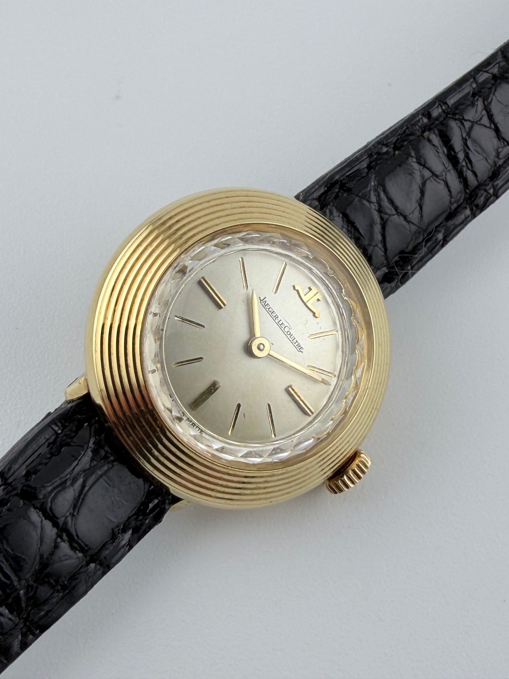 We have for sale this exceptionally beautiful vintage 1960s JLC wristwatch in solid 18kt gold, which is in absolutely outstanding condition. This classy timepiece features a timeless design, featuring baton shaped faceted indices and hands which sit on a stunning sunburst silver dial which is complimented beautifully by a faceted diamond effect crystal inlay. The watch is running perfectly, keeping excellent time within specification after a full service.