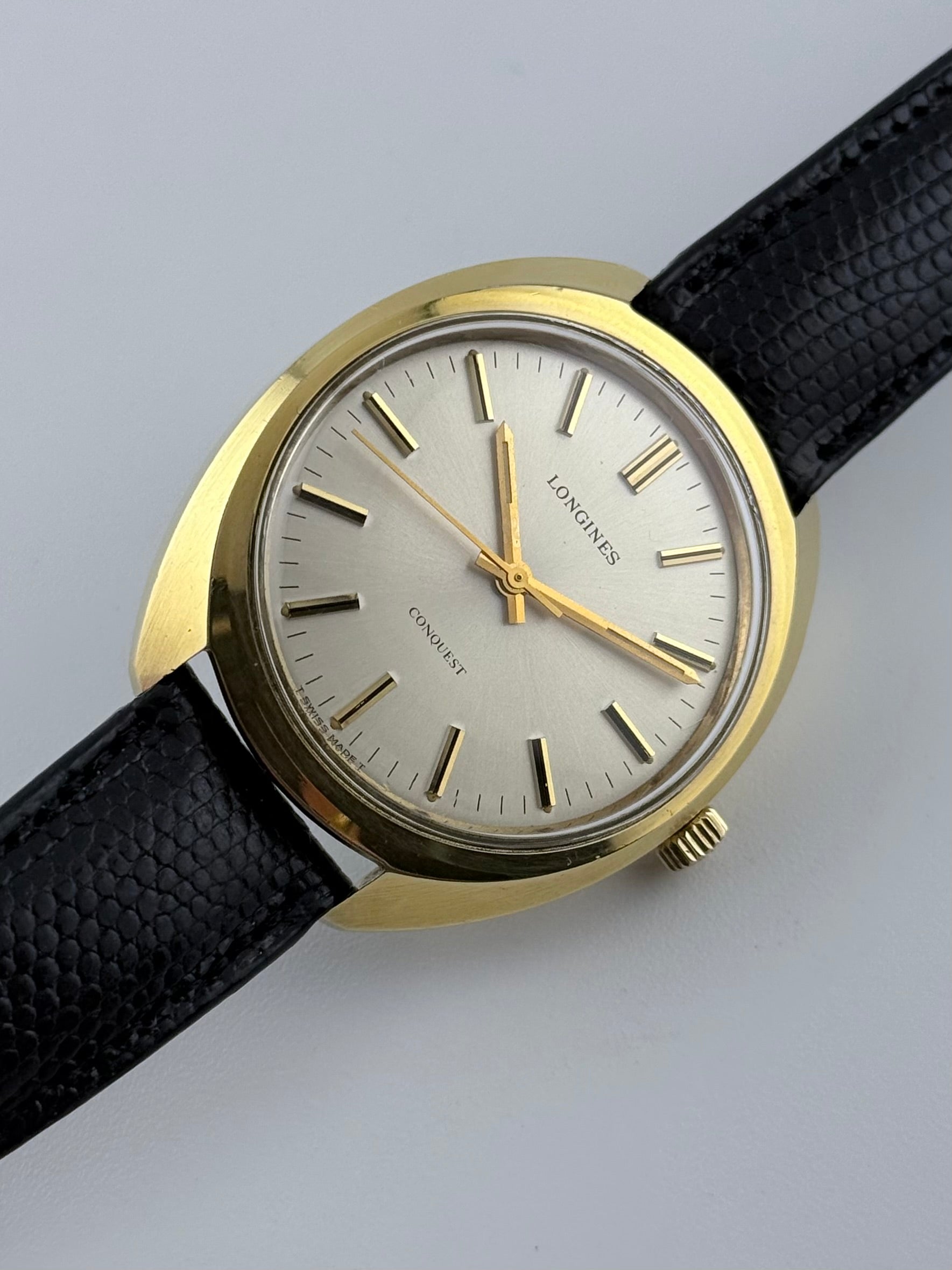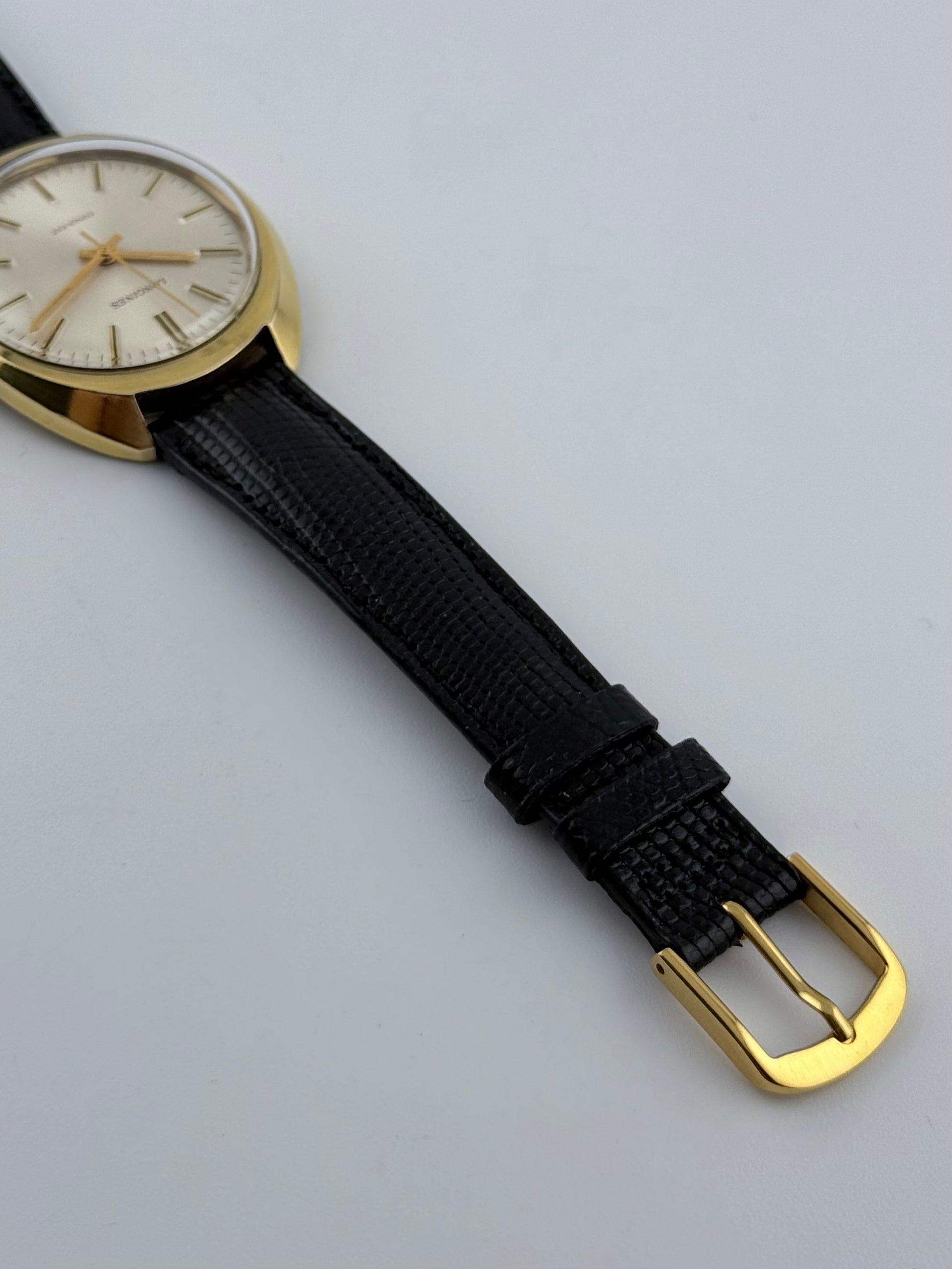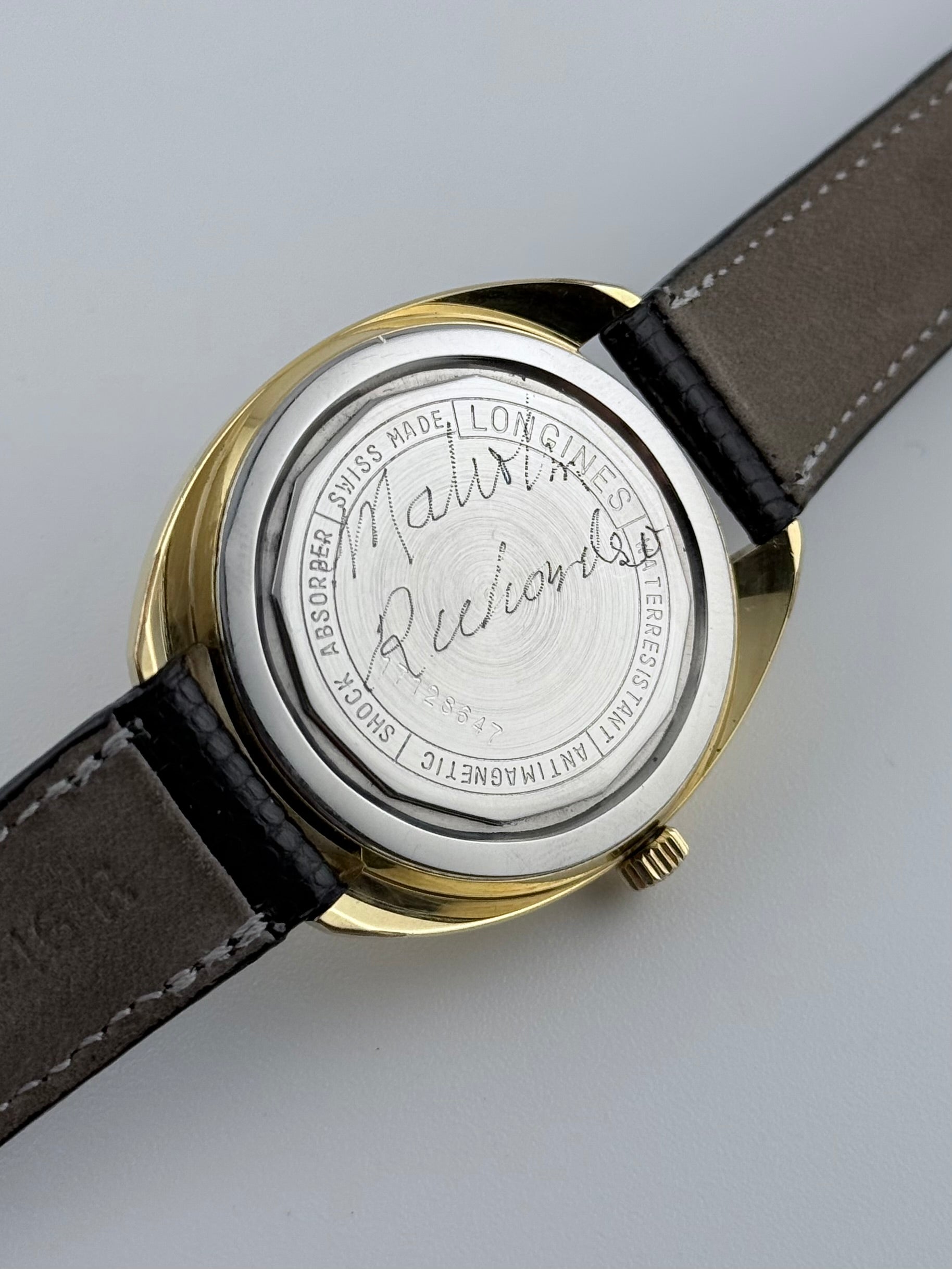 This a stunning gold plated vintage Longines from the late 1960 that is still in excellent condition and shows just the typical light wear. The lovely, faceted baton markers look striking against the mesmerising sunburst effects of the dial. The front of the case has gold plate which gives the watch some added pop and aesthetically it is the perfect combination in our view. The watch is in excellent condition showing minimal signs of wear. The movement is working perfectly and is keeping brilliant time well within specification. This timeless timepiece also has an additional story to tell with an etched signature on the back case.