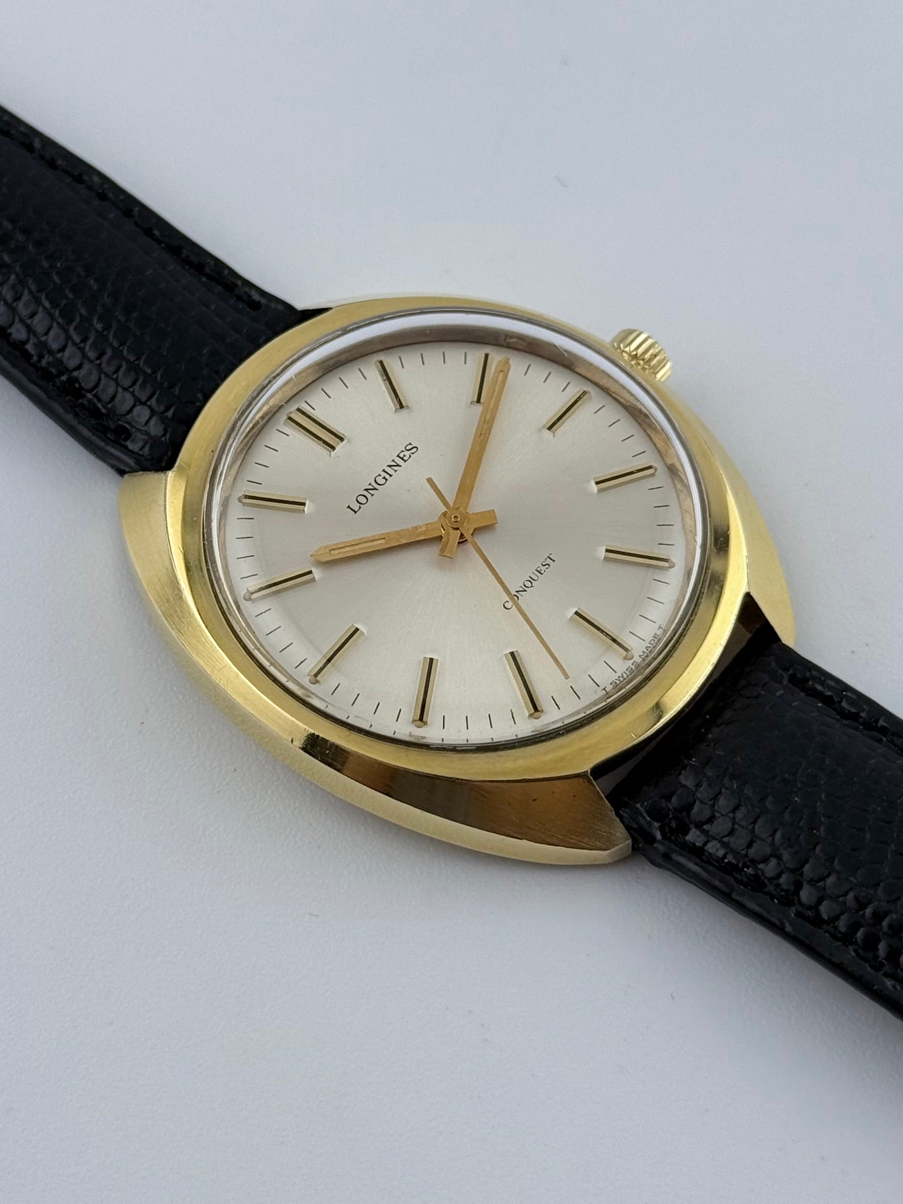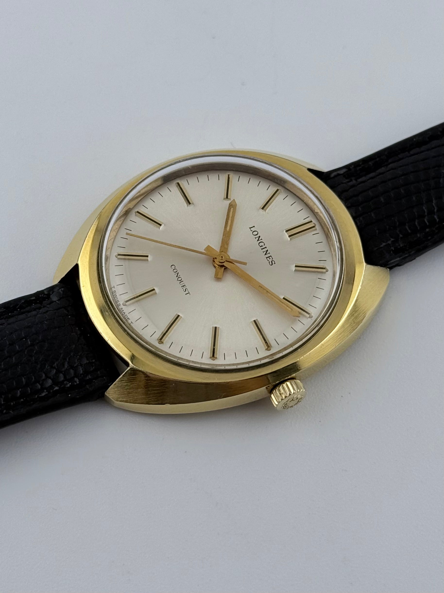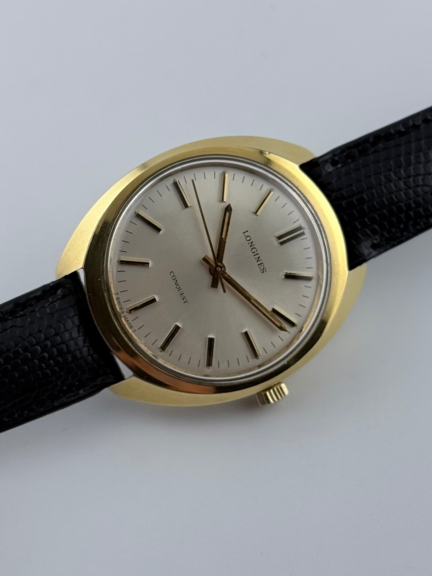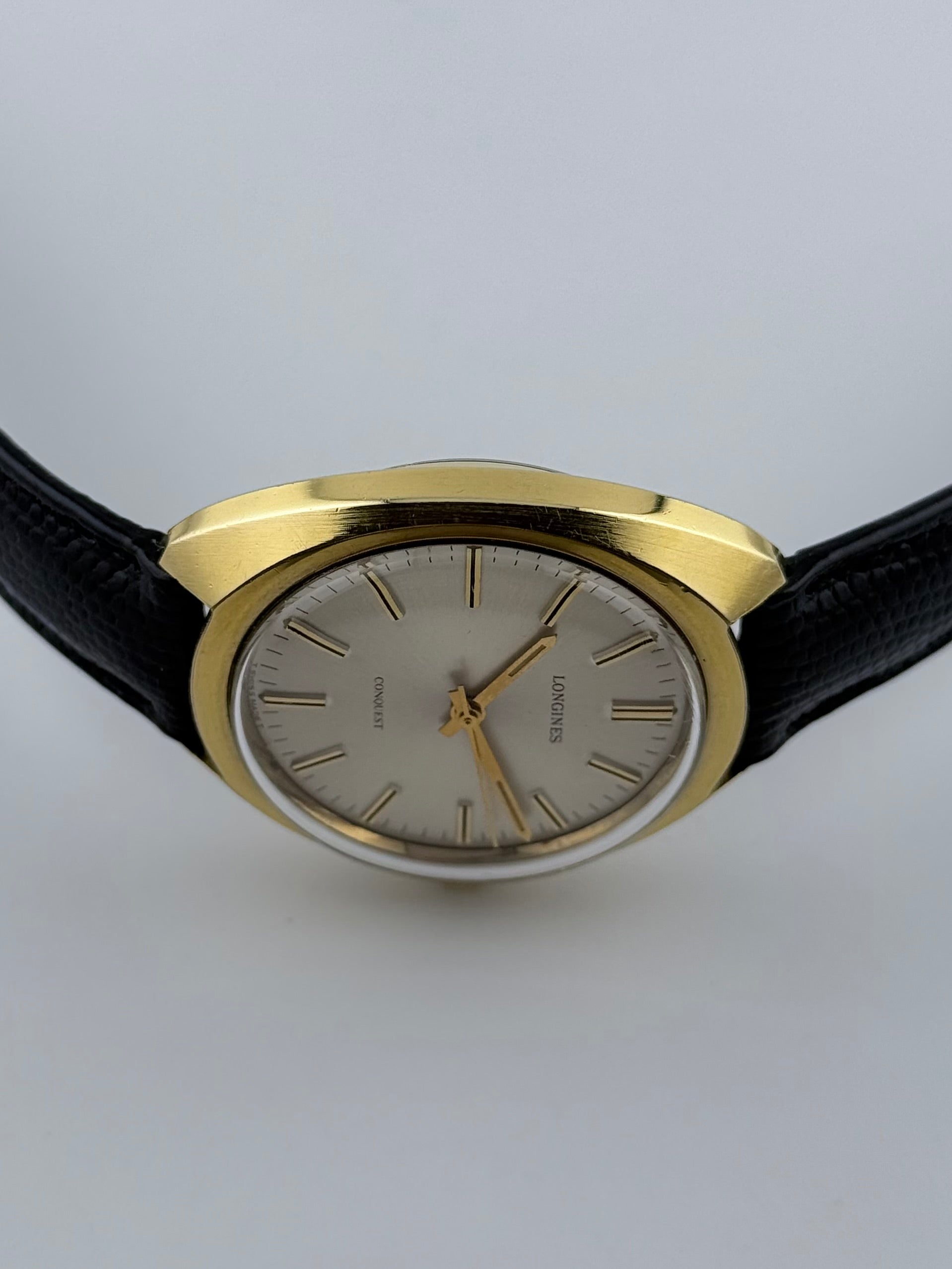This a stunning gold plated vintage Longines from the late 1960 that is still in excellent condition and shows just the typical light wear. The lovely, faceted baton markers look striking against the mesmerising sunburst effects of the dial. The front of the case has gold plate which gives the watch some added pop and aesthetically it is the perfect combination in our view. The watch is in excellent condition showing minimal signs of wear. The movement is working perfectly and is keeping brilliant time well within specification. This timeless timepiece also has an additional story to tell with an etched signature on the back case.