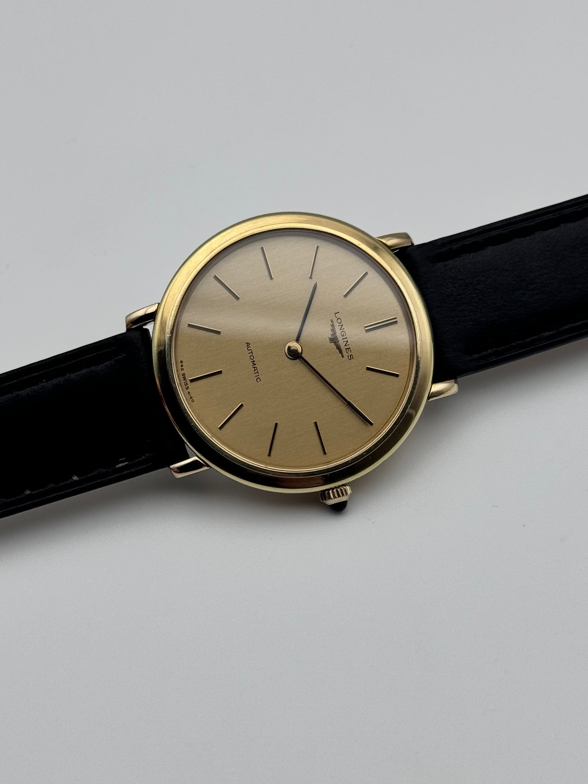 Here we present a simply beautiful vintage Longines. This piece is in amazing condition and is displaying very little signs of use. Mechanically the watch is running well and keeping good time within specification. This is the perfect dress watch with the simplicity of the baton markers on a gold dial with a crown sporting a black cabochon stone.