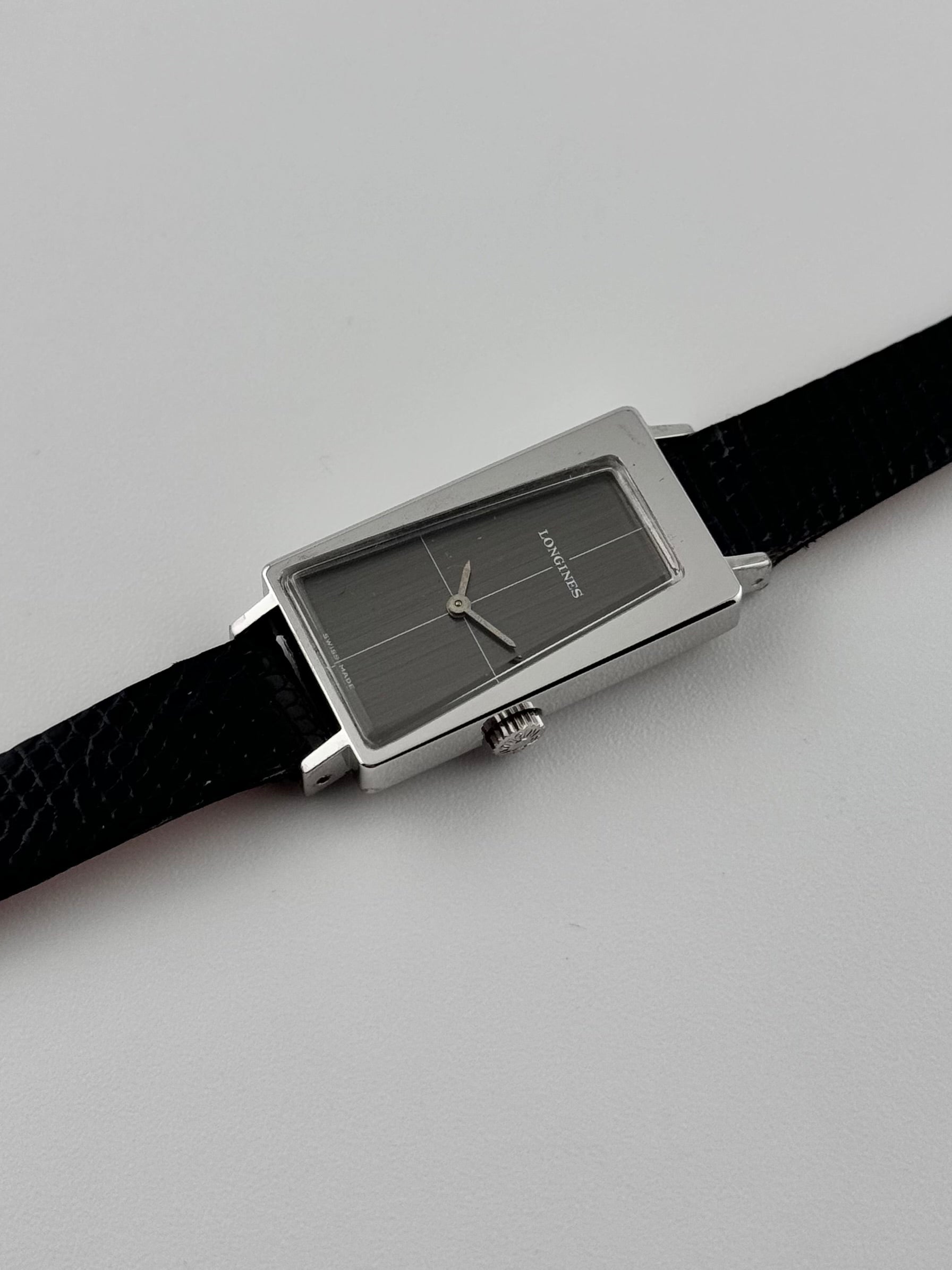 This is an extremely rare and stunning vintage Longines from 1969 designed by Serge Manzon. This watch is one of the first in his design line and an absolute rarity to find. In addition, this watch appears to be unworn; still with its original tag attached! The condition is excellent, showing minor signs of age on the polished case and the underside of its original buckle. This piece features a stunning darkened brushed irregularly shaped Crosshair dial which sits in an uniquely styled case. This stylishly sophisticated watch is complemented by a beautiful original leather strap with a Longines signed buckle as well as an original signed crown. The watch is in fantastic condition both mechanically and cosmetically and is running perfectly, keeping perfect time within specification.