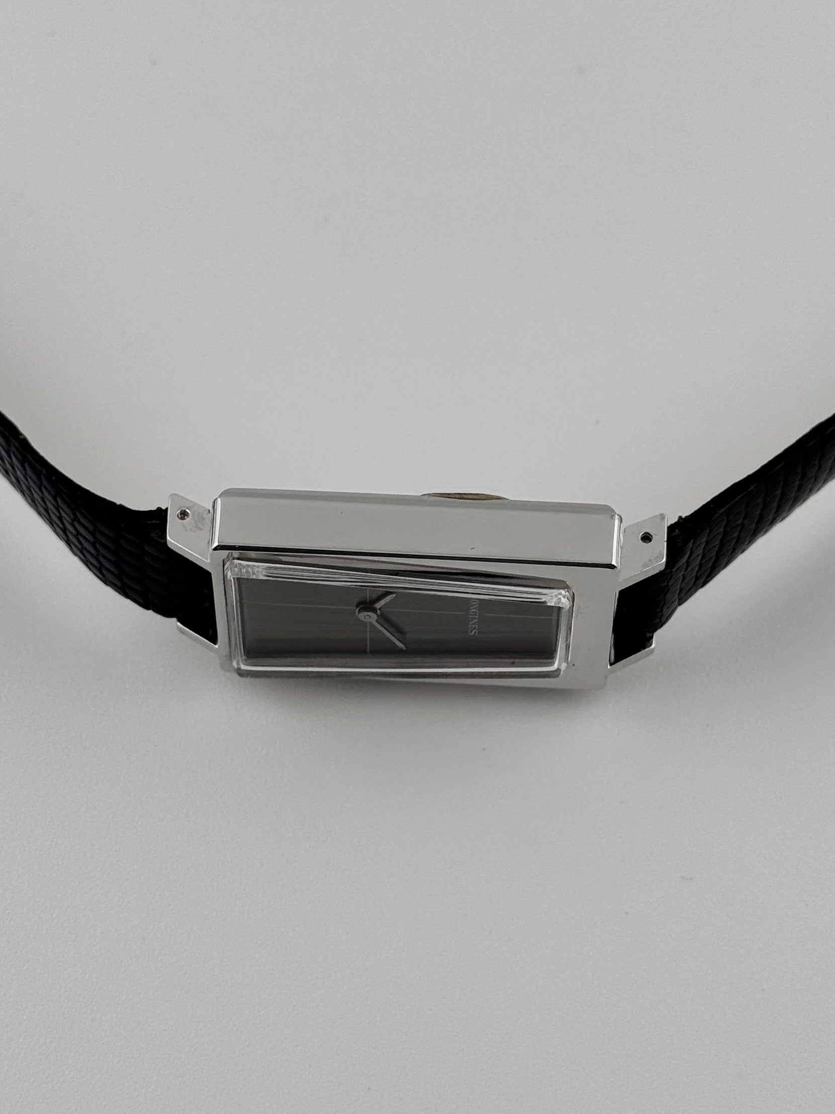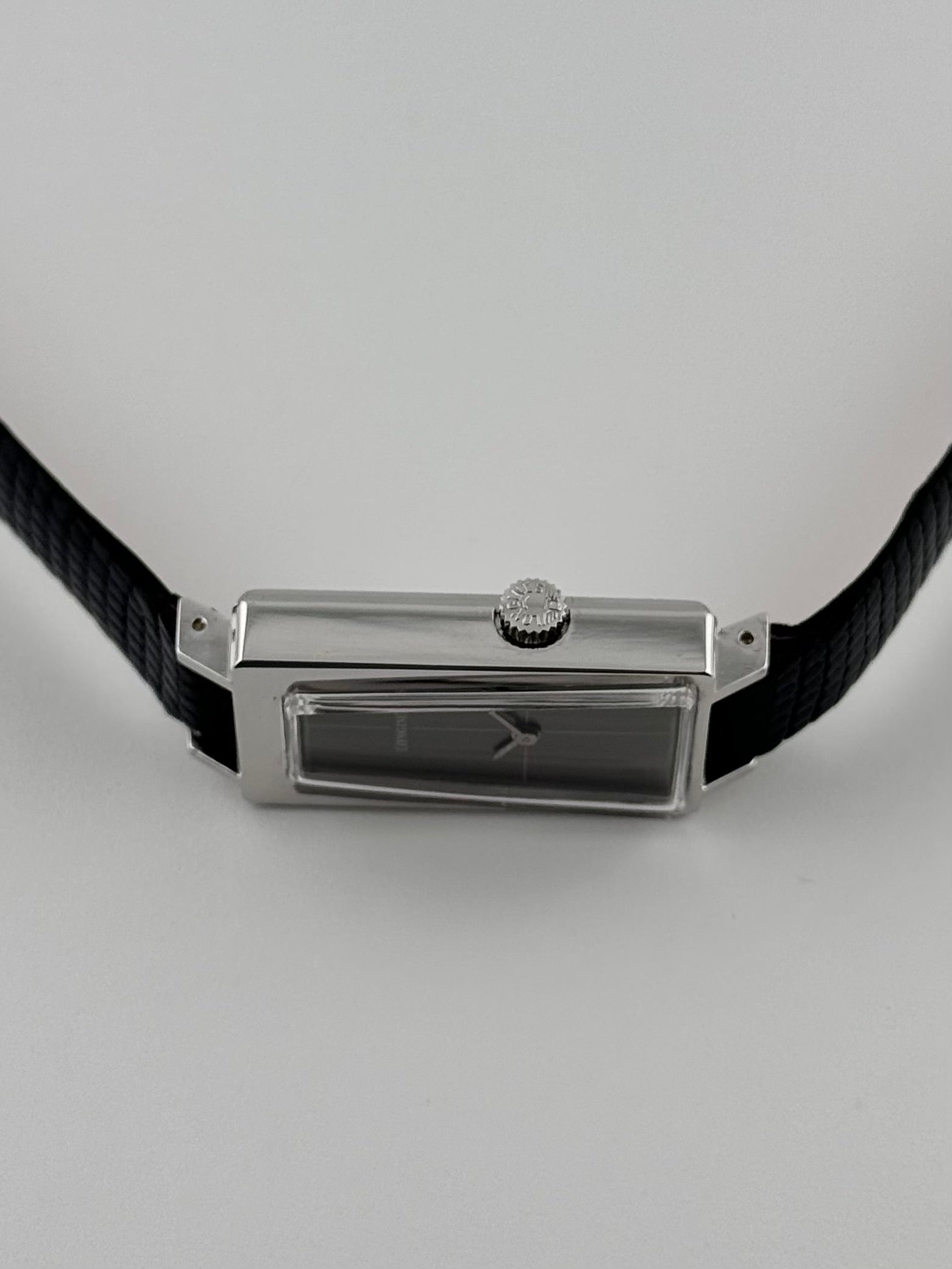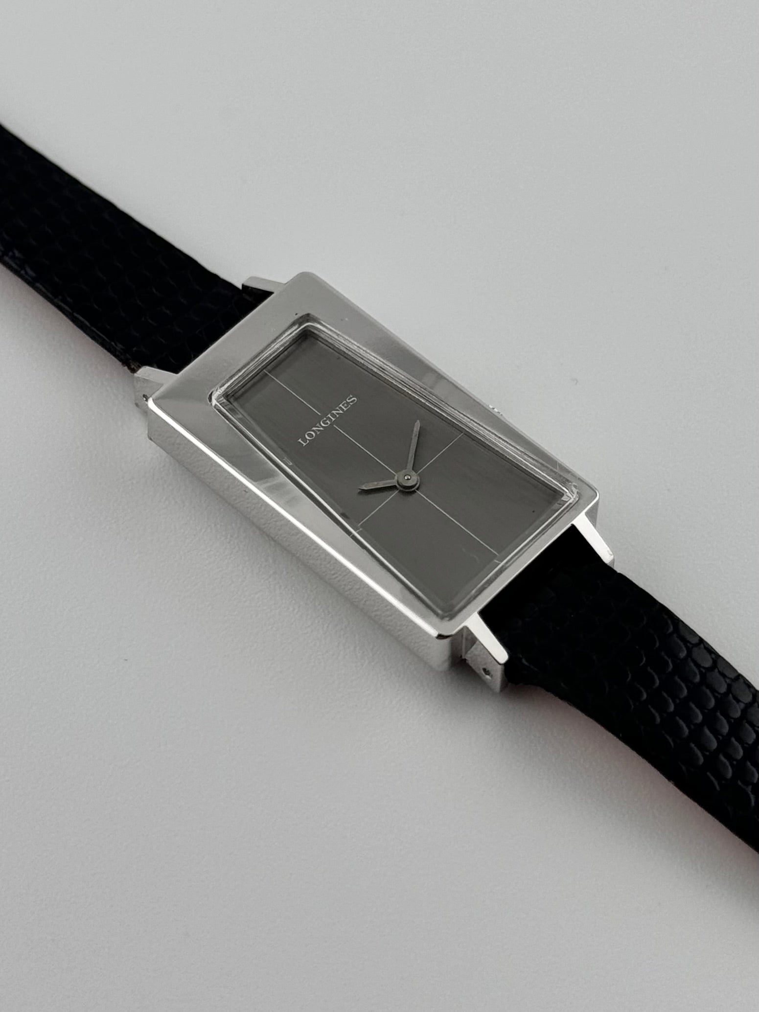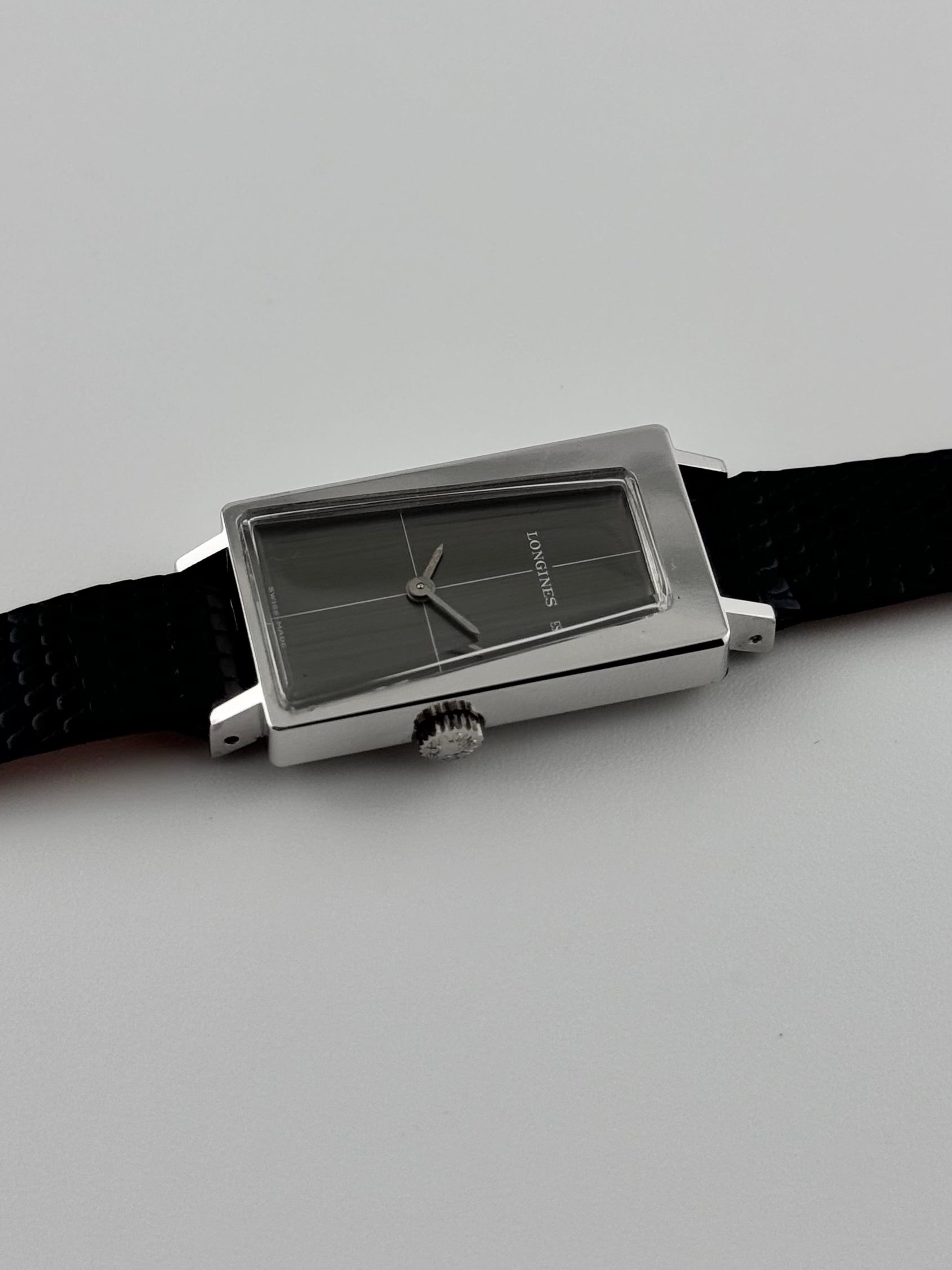This is an extremely rare and stunning vintage Longines from 1969 designed by Serge Manzon. This watch is one of the first in his design line and an absolute rarity to find. In addition, this watch appears to be unworn; still with its original strap and stickers on the back case! The condition is fantastic, showing minor signs of age on the polished case and the underside of its original buckle. This piece features a stunning darkened brushed irregularly shaped Crosshair dial which sits in an uniquely styled case. This stylishly sophisticated watch is complemented by a beautiful and original leather strap with a Longines signed buckle as well as an original signed crown. The watch is in fantastic condition both mechanically and cosmetically, it has just been fully serviced and it is running perfectly, keeping perfect time within specification.