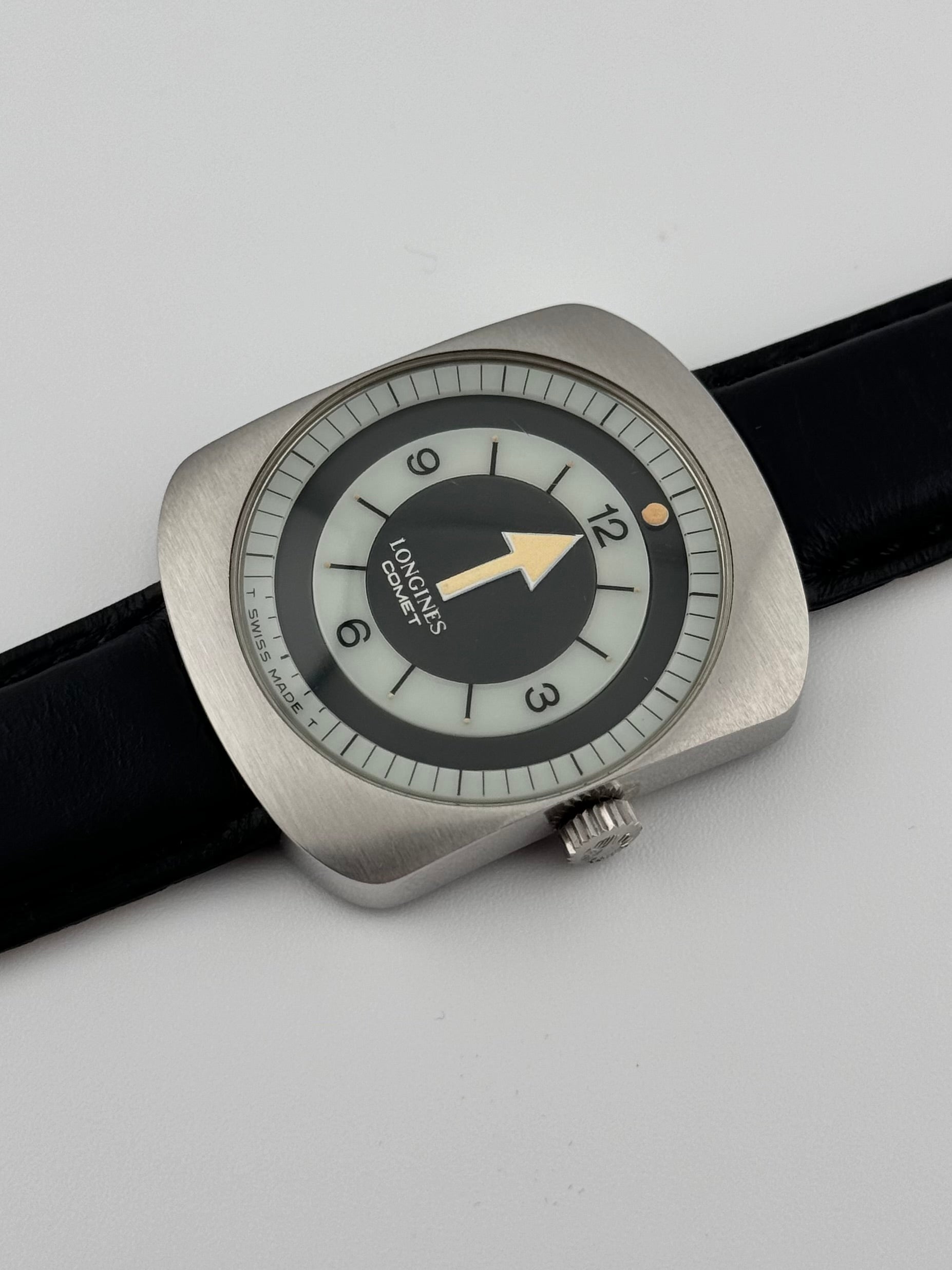 Wow! This is something a little different and a watch sure to get your friends talking. The design is full on 70s and with an arrow pointing to the hour and a small orbiting dot (the Comet) to show you the minutes, it really is a design classic! The watch works perfectly and is keeping great time. Cartier wrote the book on mystery watches and clocks, but this attempt by Longines is fantastic and a real rarity. The complexity involved in creating this watch means everyone should have one in their collection!