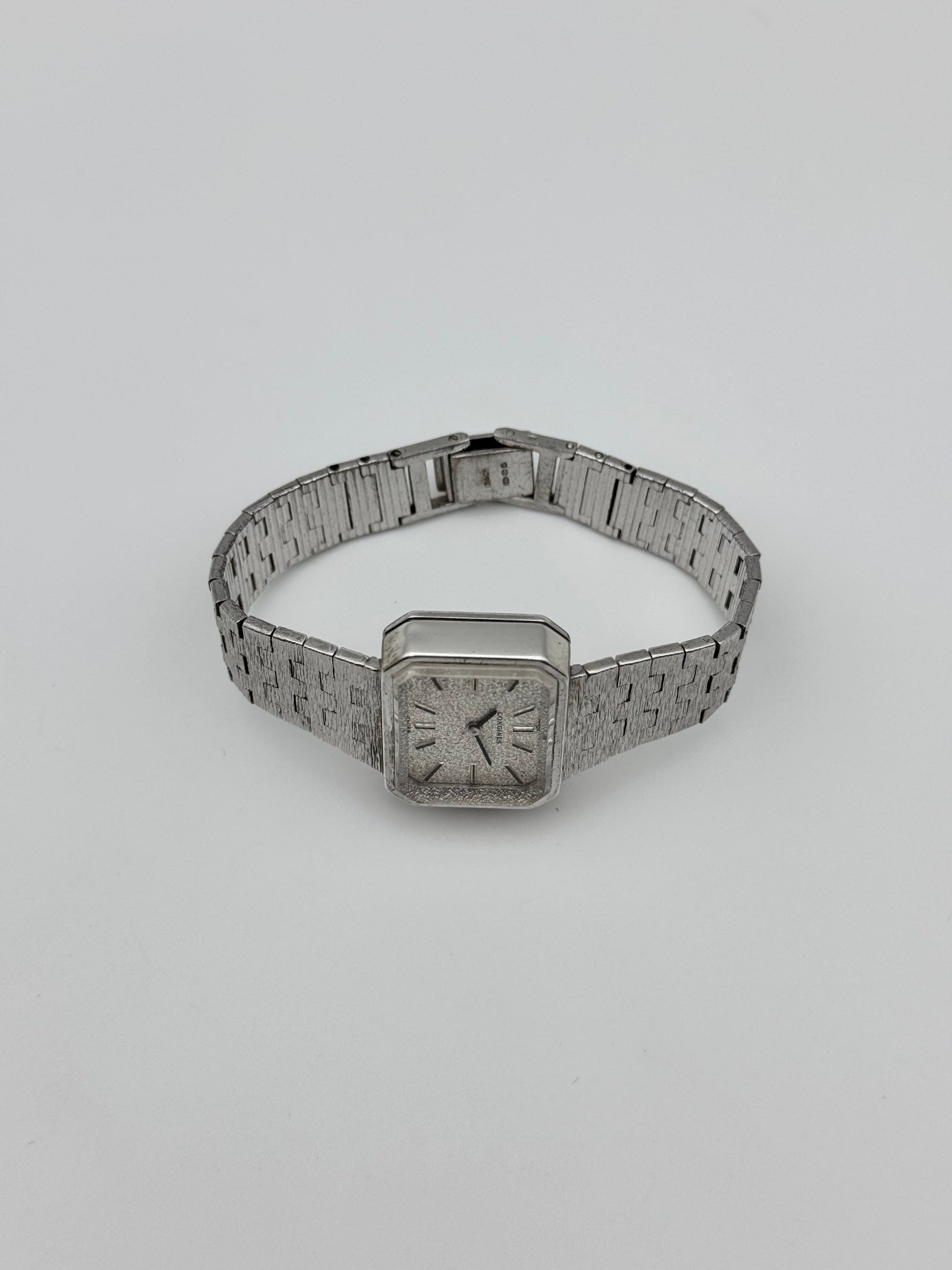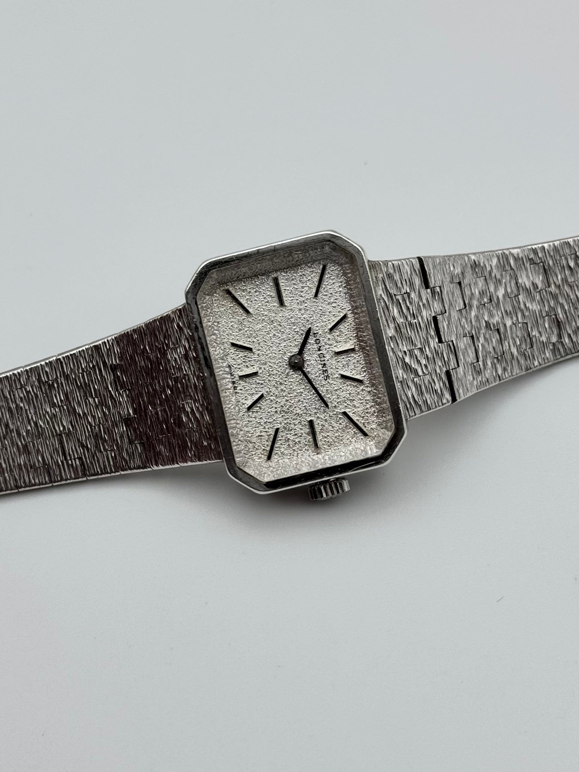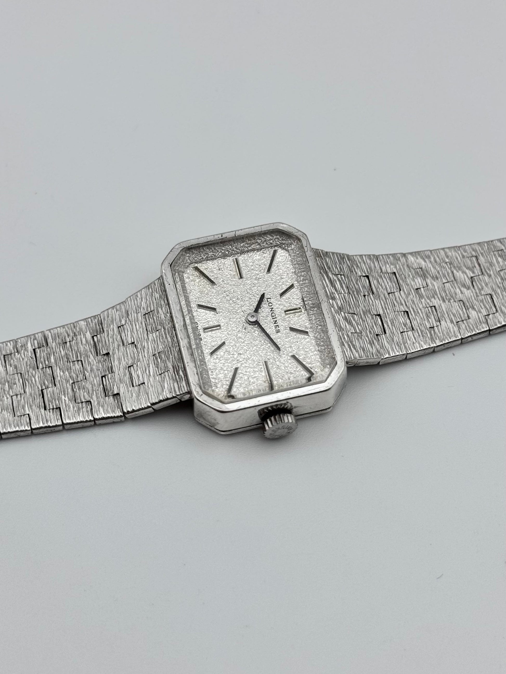 This is a very rare and absolutely stunning vintage Longines from the mid 1970s. This watch is an absolute rarity to find and is made entirely of 925 Sterling silver. This piece features a stunning frosted dial which is complemented by a beautiful bark finish on the bracelet, similar to Rolex Day-Dates of this era. The watch is in spectacular condition both mechanically and cosmetically. The watch has just been fully serviced and is running perfectly and keeping perfect time within specification.