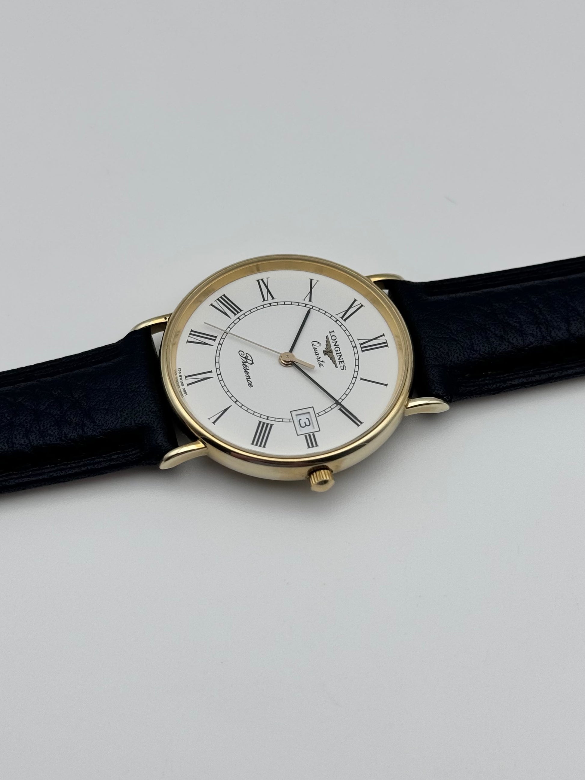 Longines Presence Date Quartz 9ct Gold - Original Strap, Buckle & Box